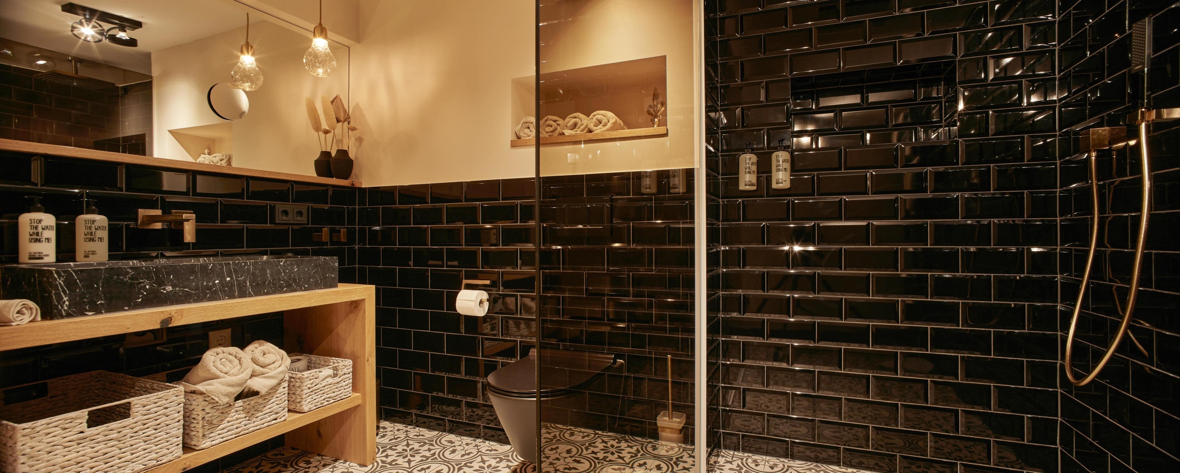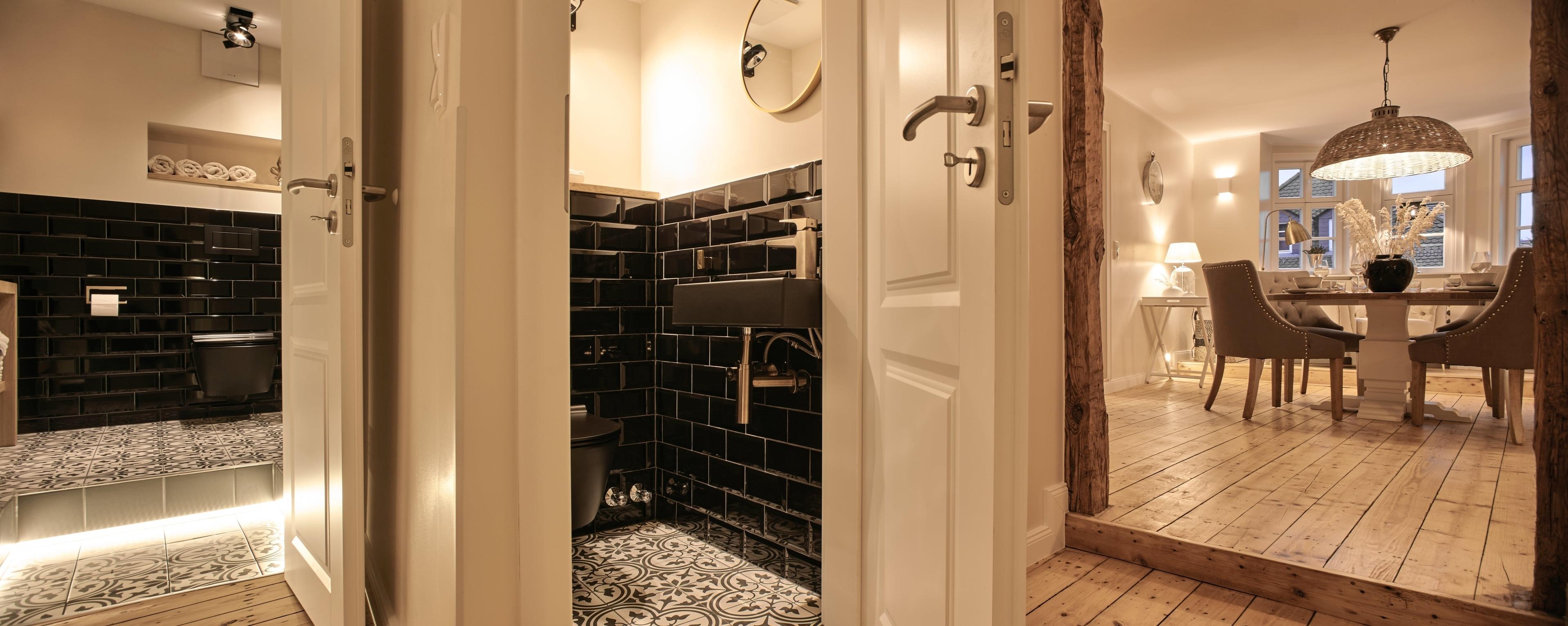 Aus dem Eingangs-/Flurbereich gelangen Sie in das Bad mit großzügiger begehbarer Rain-Shower-Dusche, Designfliesen und hochwertigsten Armaturen. Ihnen als Gast stehen sowohl flauschige Handtücher (im Wäschepakt enthalten) sowie wohlduftende Pflegeprodukte der nachhaltigen Kosmetiklinie Stop Water while using me kostenfrei zur Verfügung.