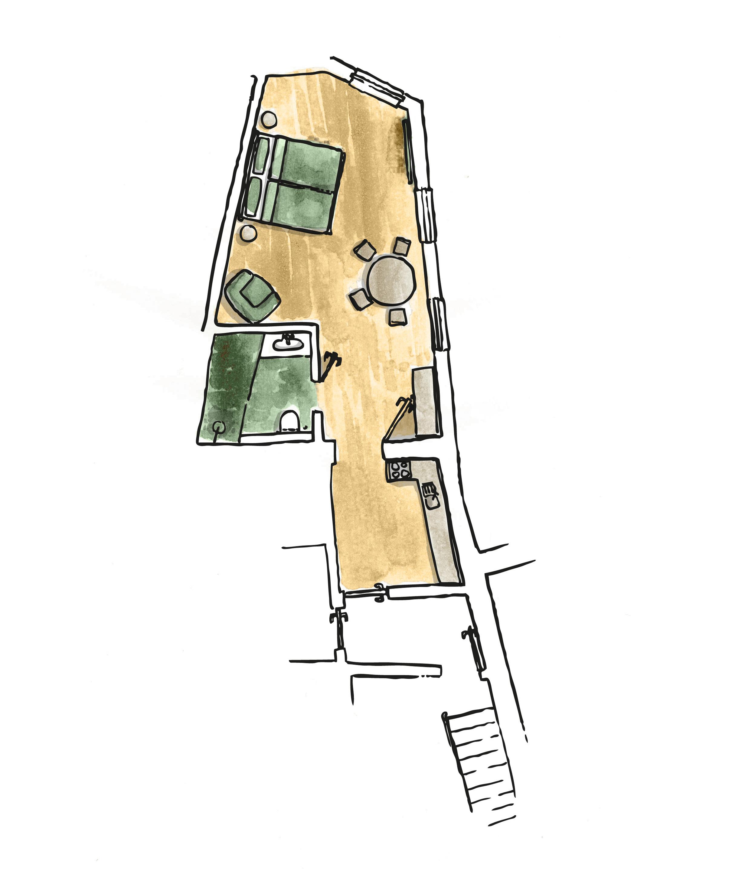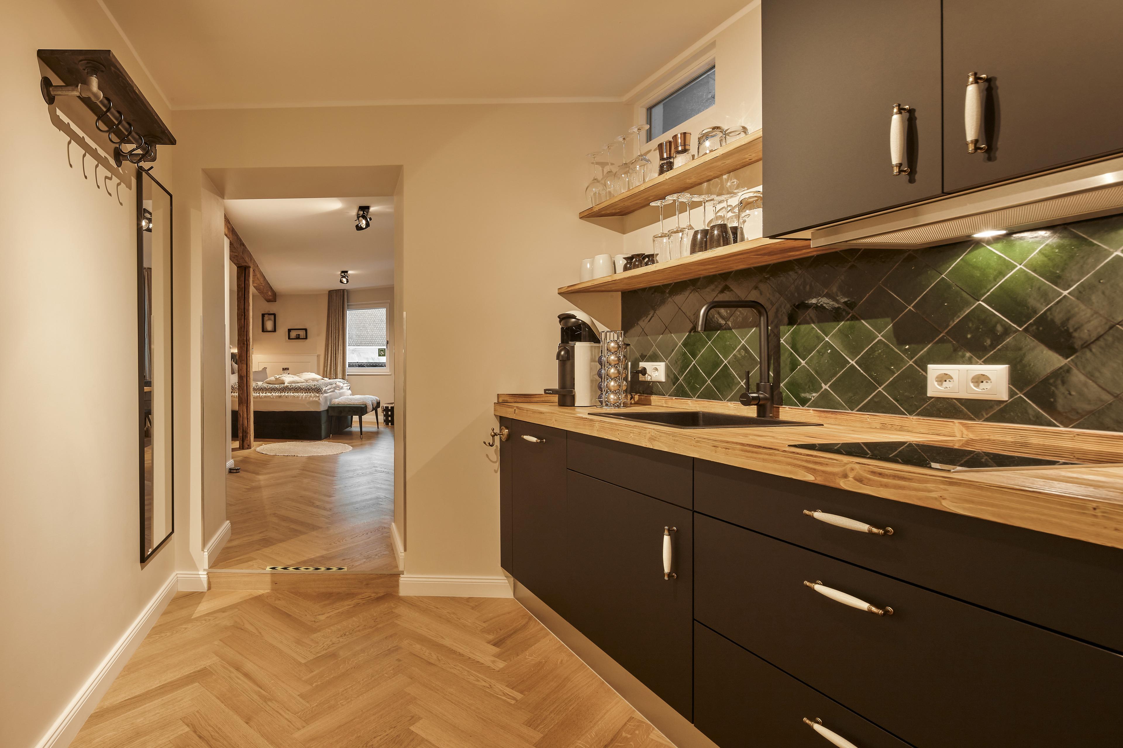 Die Wohnung liegt im 1. Obergeschoß und verfügt über einen eigenen Eingang. Der großzügige Wohnschlafraum bietet genügend Raum für den Essbereich, eine gemütlichen Sessel zum Entspannen sowie das große Premium-Boxspringbett. Die Designküche ist -bis auf einen Ofen- voll ausgestattet und enthält neben Kühlschrank, Herd und Spülmaschine auch Gläser, Geschirr, Besteck, Weinöffner und alles Weitere was Sie für ein leckeres Frühstück oder ein gemeinsames Abendessen benötigen. Mit der Nespresso-Vertuo Machine inkl. einer kostenlosen Erstausstattung an Kapseln bereiten Sie am Morgen nach dem Aufstehen den perfekten Kaffee und am Nachmittag Ihren leckeren Espresso zu. Die Wohnung verfügt außerdem über kostenfreies WLAN einen 4K-LED-TV sowie einen hochwertigen Bluetooth-Lautsprecher.