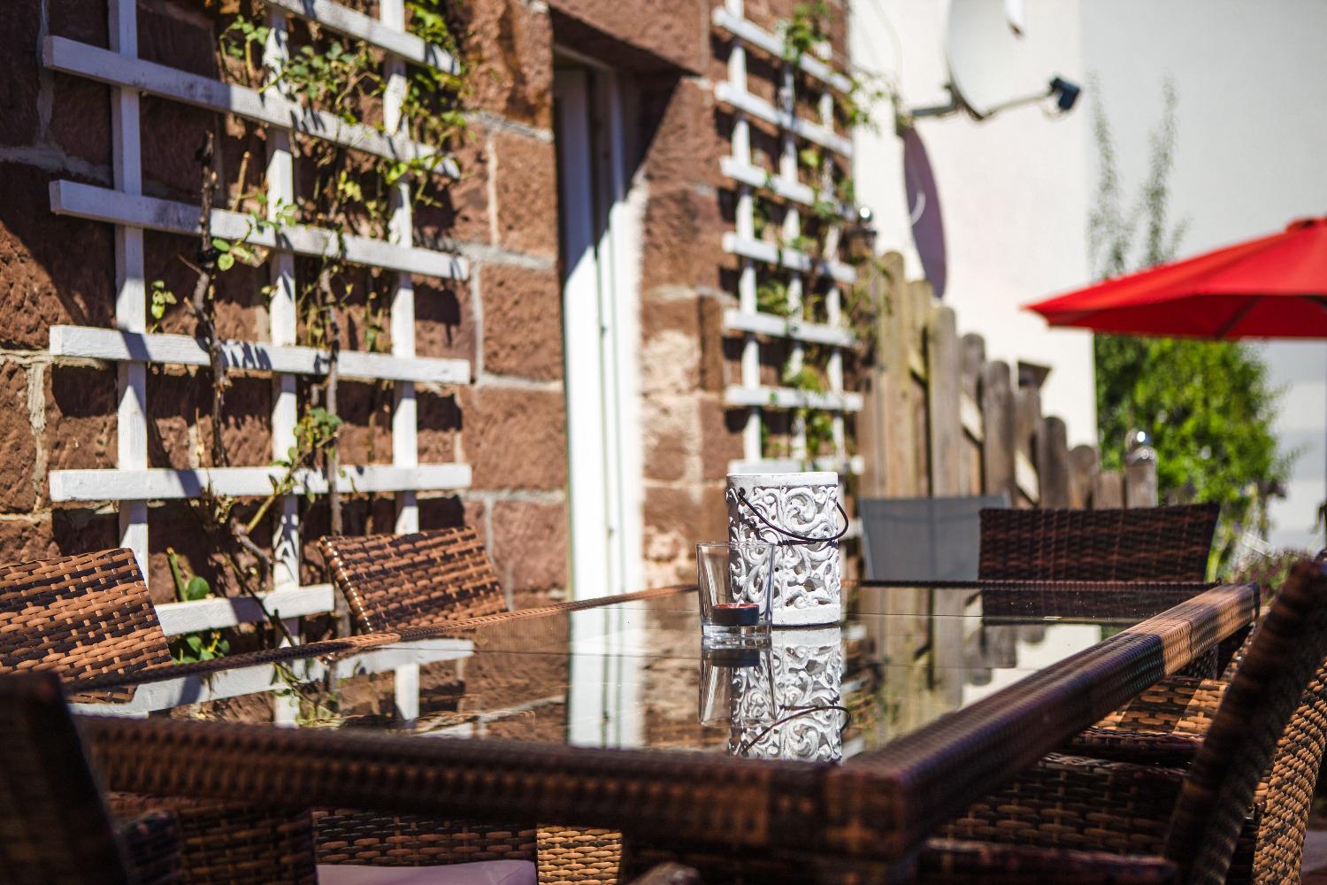 Studio zwischen 20-35qm, seperater Eingang, Terasse mit Sitzgruppe, für 1-3 Personen, Küchenzeile mit Kaffeemaschiene, Mikrowelle, Herd, Wasserkocher, Geschirr, Kühlschrank, Bad mit Dusche, Fön und Kosmetikspiegel, TV, kostenloses W-lan, Parkmöglichkeit, aufgezogene Bettwäsche und Endreinigung inklusive, Frühstück auf wunsch zur Wunschzeit, ruhige Lage, Rad-und Wanderweg in direkter Nähe