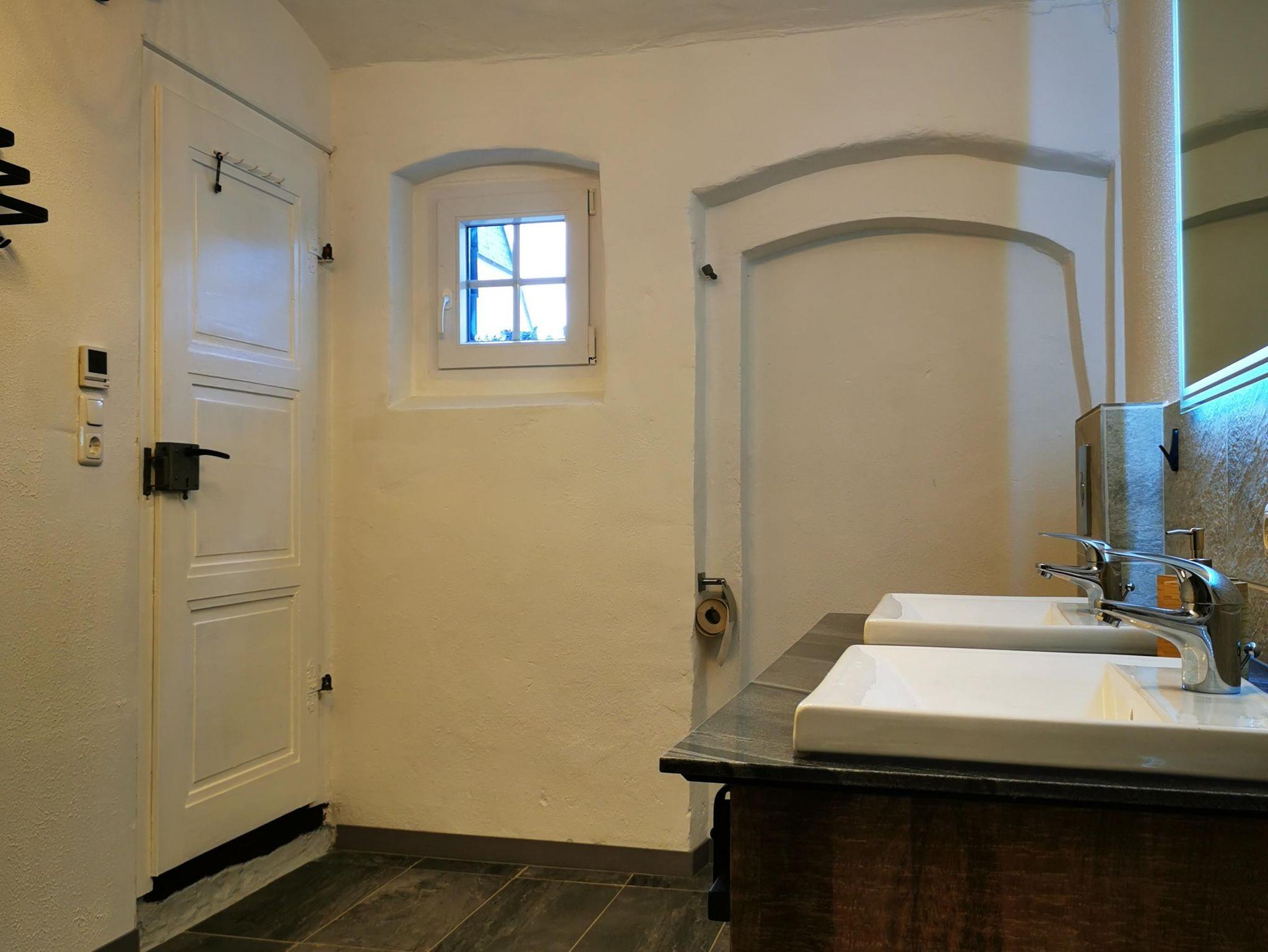 Ein Duschbad mit Waschmaschine und eine Küche sind vorhanden.