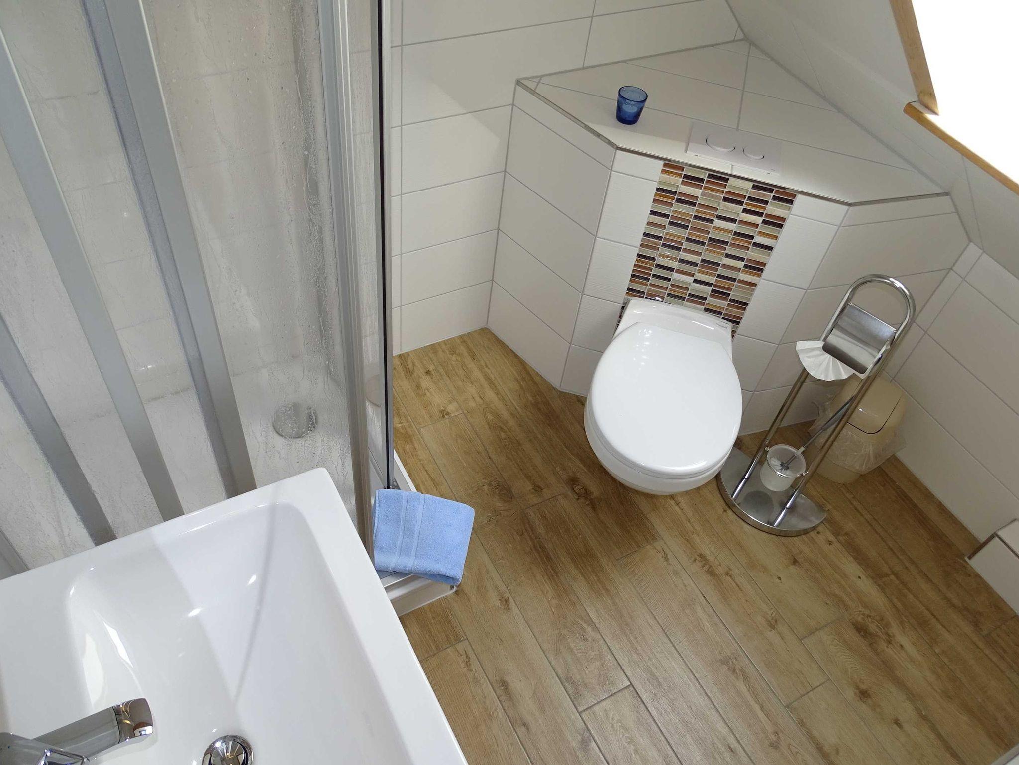 Die Ferienwohnung im Obergeschoß verfügt über ein Wohnzimmer, ein separates Schlafzimmer mit Doppelbett, Dusche/WC, Miniküche (Toaster, Eierkocher, Wasserkocher, Kaffeemaschine, Besteck, Geschirr), und Sat-TV, Radio.