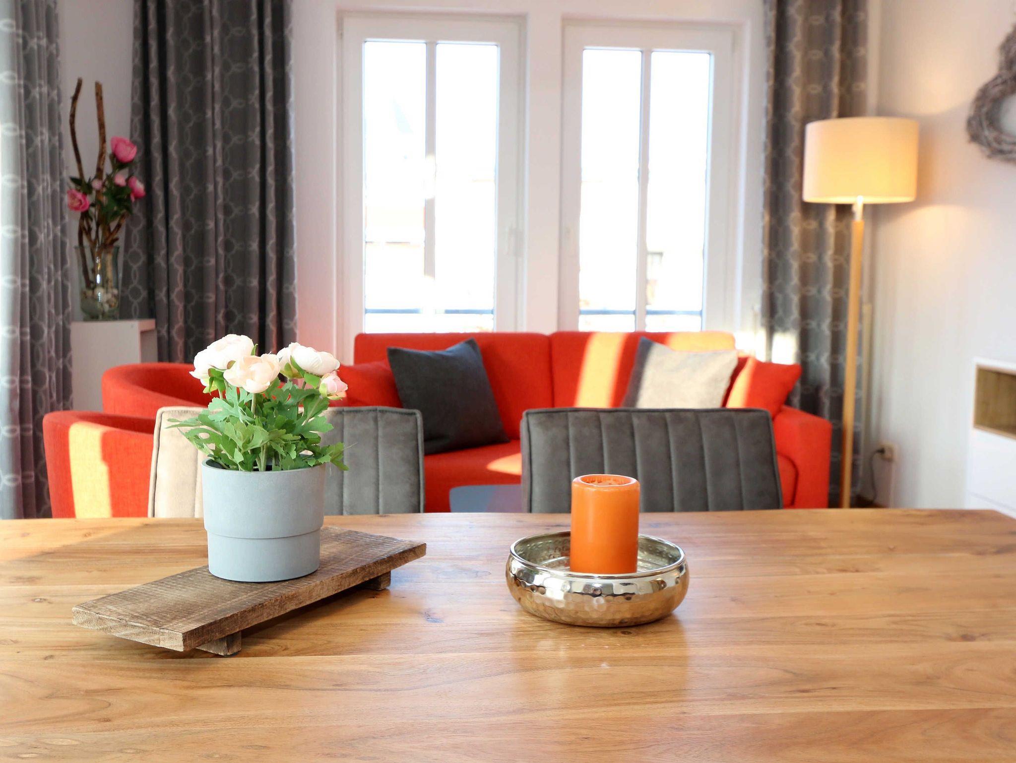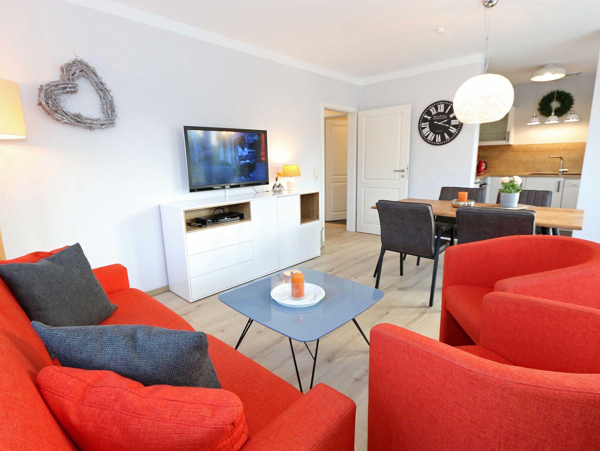 Die Nichtraucherferienwohnung des Hauses Eintracht ist eine komfortable 2-Raumwohnung in der 1. Etage und umfasst etwa 56m², somit bietet sie Platz für bis zu 4 Personen. Sie setzt sich zusammen aus einem Wohnzimmer mit Zugang zum Balkon, einem Schlafzimmer, einer Küchenzeile, einem Flur und einem Badezimmer. Der Wohnbereich ist liebevoll und detailreich eingerichtet. In dem lichtdurchfluteten Raum finden sie, neben zwei Sessel, einen Couchtisch, eine Schlafcouch (1,60m x 2,00m), welches als Schlafmöglichkeit für 2 Personen geeignet ist. Ein Smart-TV sowie ein DVD-Player ermöglichen es ihnen, nach einem eindrucksvollen Tag einen gemütlichen Filmabend mit den Liebsten zu verbringen. Auch ein Radio mit CD-Player und verschiedene Lektüren für die Bücherwürmer unter Ihnen sind vorzufinden. Auf einen Internetzugang (WLAN) brauchen Sie nicht zu verzichten. Des Weiteren befindet sich hier auch ein schöner Esstisch mit vier bequemen Stühlen, die sich direkt am Balkon Fenster befinden. Auf diesem zu Süd gerichteten Balkon befindet sich ein Tisch mit vier Stühlen, einen Sonnenschirm sowie einer Gartenbank. Die neu moderne Küchenzeile ist ausgestattet mit einem Ceranfeld, Backofen und einem Kühlschrank mit Eisfach, Geschirrspüler, Mikrowelle, Wasserkocher, Toaster, Kaffeemaschine und diverse Kochutensilien. Das Schlafzimmer ist mit einem Doppelbett (1,80m x 2,00m), verstellbare Lattenroste, Nachttischablagen und einem geräumigen Kleiderschrank ausgestattet. Wie im Wohnzimmer ist das Schlafzimmer angenehm hell, auch hier befindet sich ein TV-Gerät. Bei Bedarf können sie jedoch einfach die Raffrollos zuziehen und dunkeln den Raum somit komplett ab. Sollten sie feststellen, dass ihre Kleidung im Koffer zerknittert ist, so finden sie im Schlafzimmer sowohl ein kleines Bügelbrett als auch ein Bügeleisen vor. Das Badezimmer setzt sich zusammen aus einer modernen Regendusche, einem großen Waschtisch mit einem geräumigen Unterschrank, einem WC, einem großen beleuchteten Spiegel sowie einem Handtuchheizkörper. Auch ein Fön steht Ihnen zur Verfügung. Natürlich ist auch an die kleinen Gäste gedacht, so dass Sie sich an verschiedenen Spielzeuge, Gesellschaftsspielen und Kinderbüchern erfreuen können. Ihr PKW-Stellplatz (Nr.16) befindet sich direkt am Haus. Zu der Villa ?Eintracht? gehört auch ein kleiner Kinderspielplatz. Leider sind bei uns keine Haustiere erlaubt. Die Erstausstattung eines Wäschepaketes (komplette Bettwäsche, 1 Duschhandtuch, 2 kleine Handtücher, 2 Geschirrhandtücher) können Sie bis 14 Tage vor Anreise gegen einen Aufpreis dazu buchen oder durch eigene ergänzen.