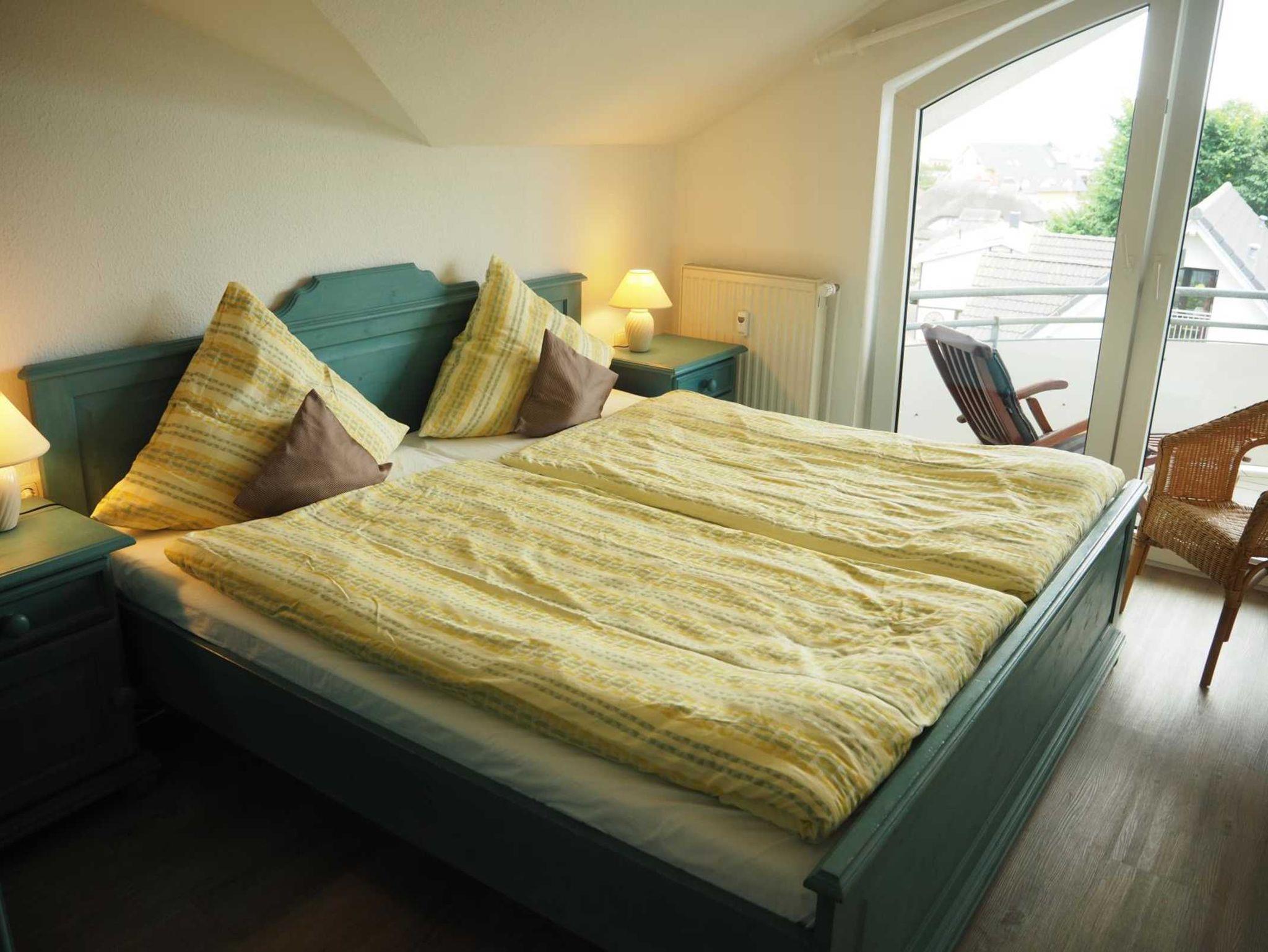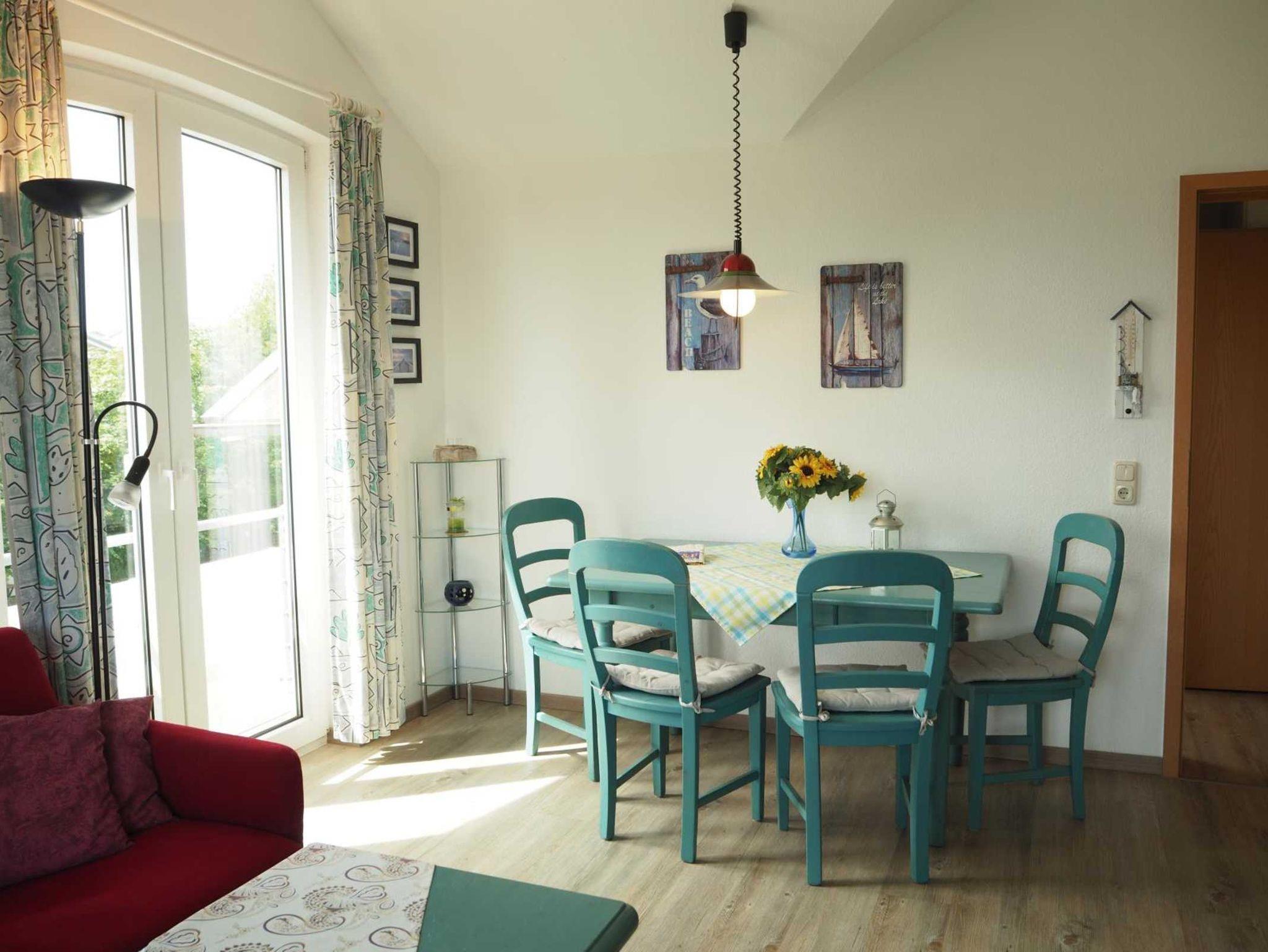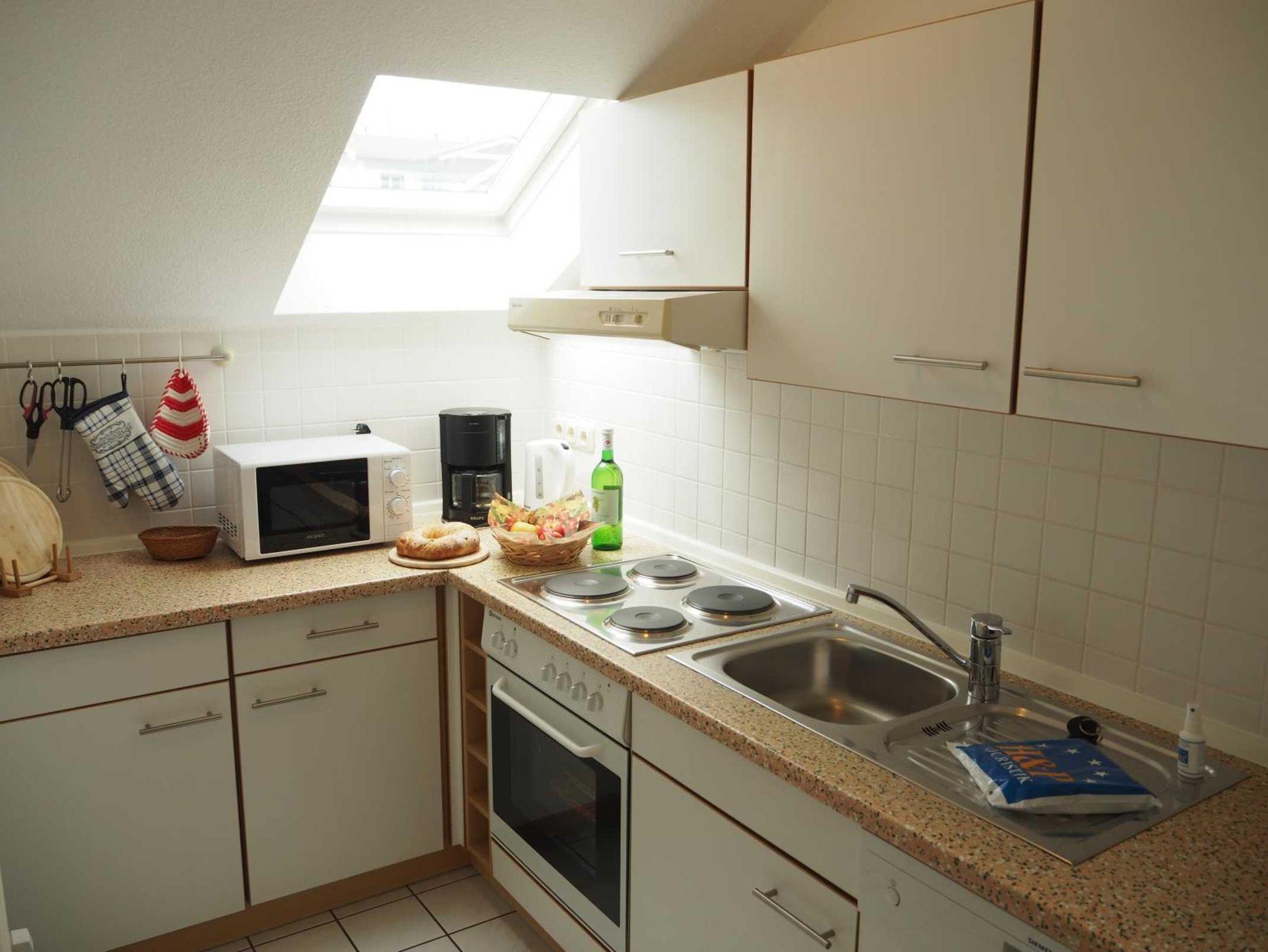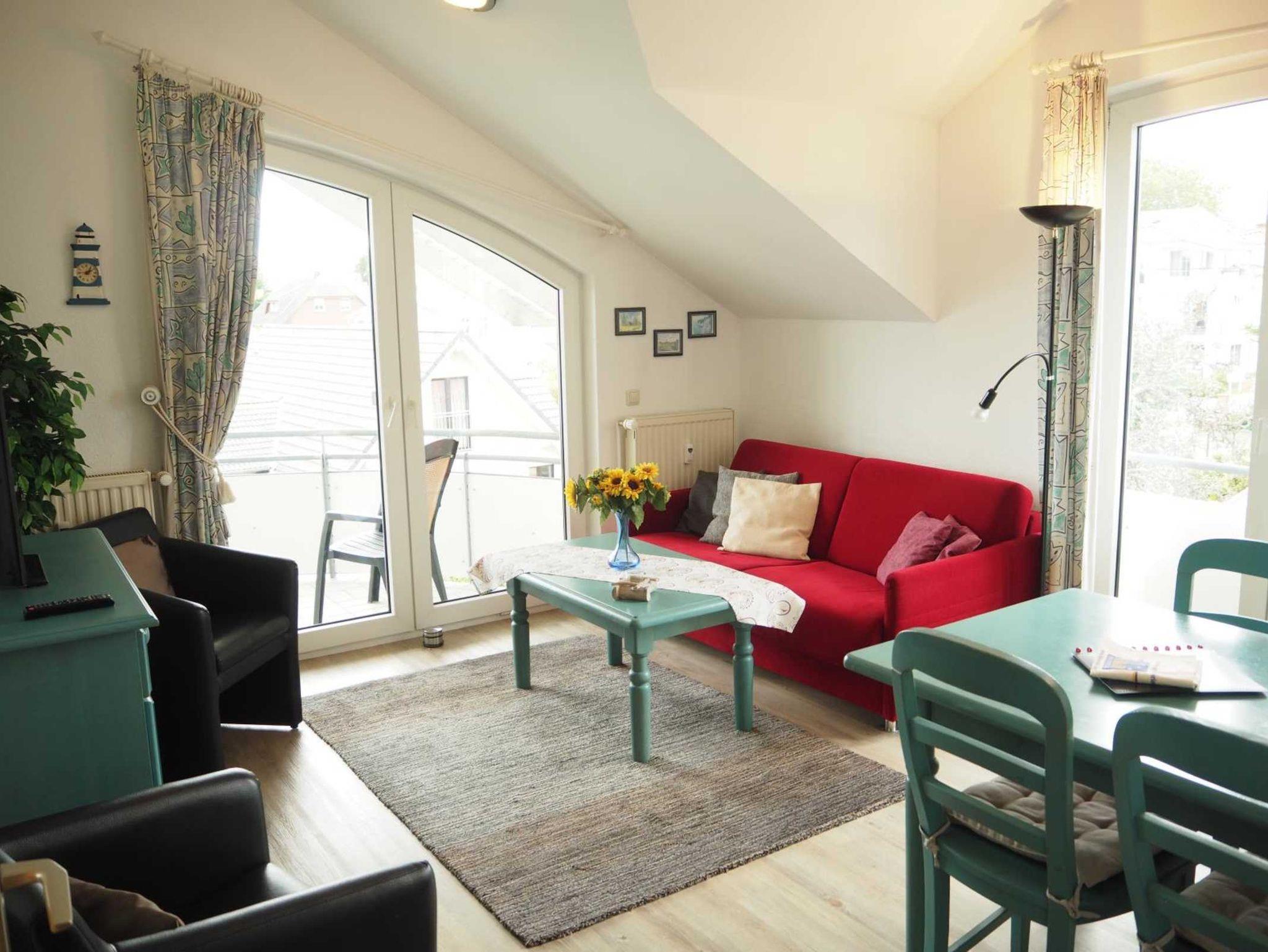 Sie wohnen in einem 2-Zimmer-Appartement für bis zu 4 Personen in der Villa Eintracht im Dachgeschoss, ca. 48m², ein Schlafzimmer (Möglichkeit zur Abdunklung vorhanden) mit Doppelbett, Wohn-/Schlafraum mit Doppelbettcouch, separater Essplatz, voll ausgestattete separate Küche mit Geschirrspüler und Mikrowelle, Dusche/WC, Balkon, SAT-TV.