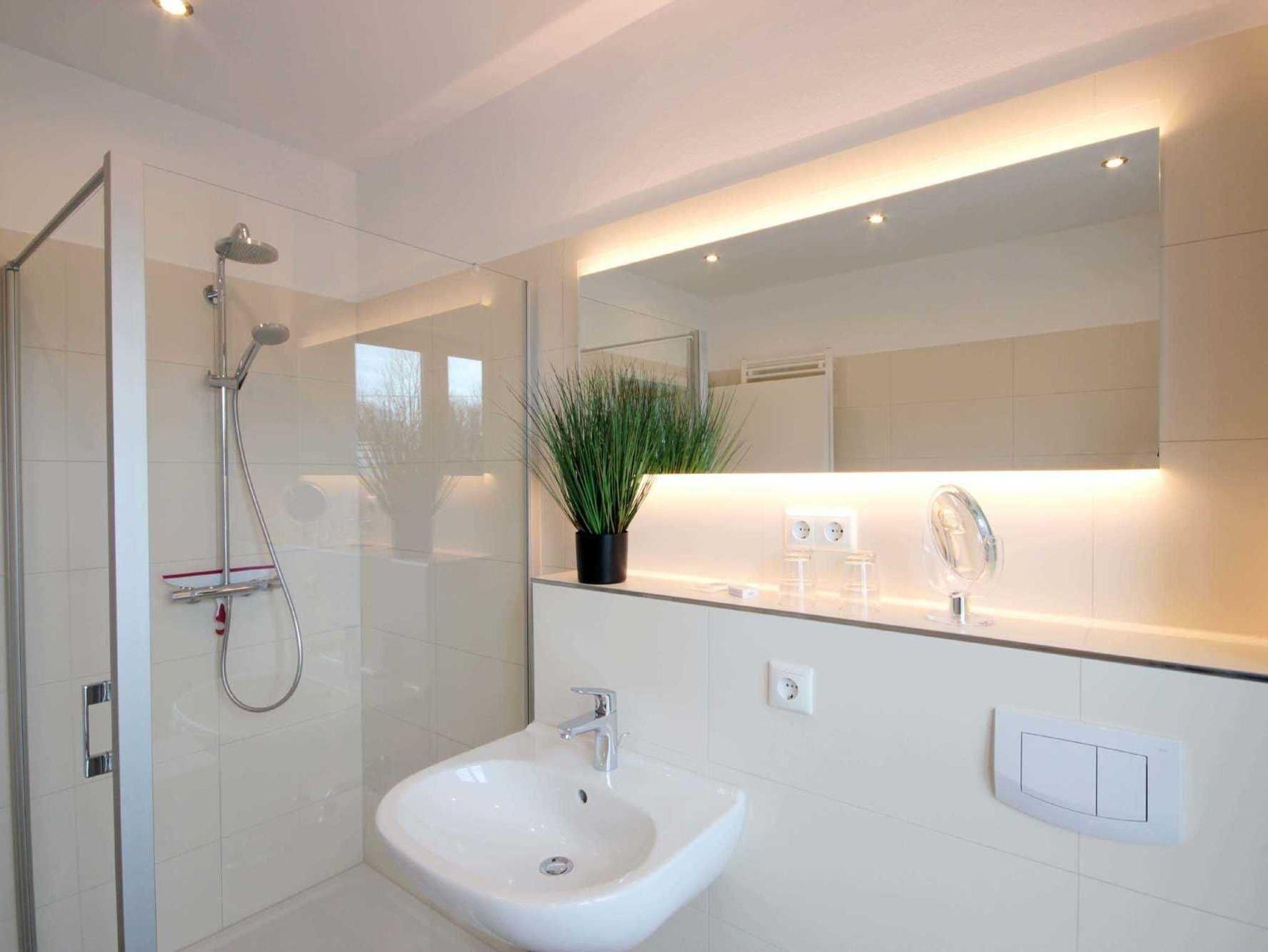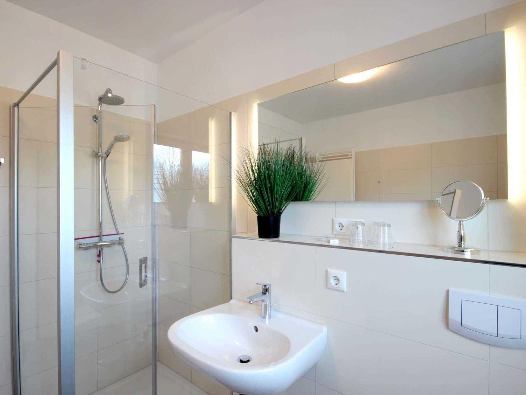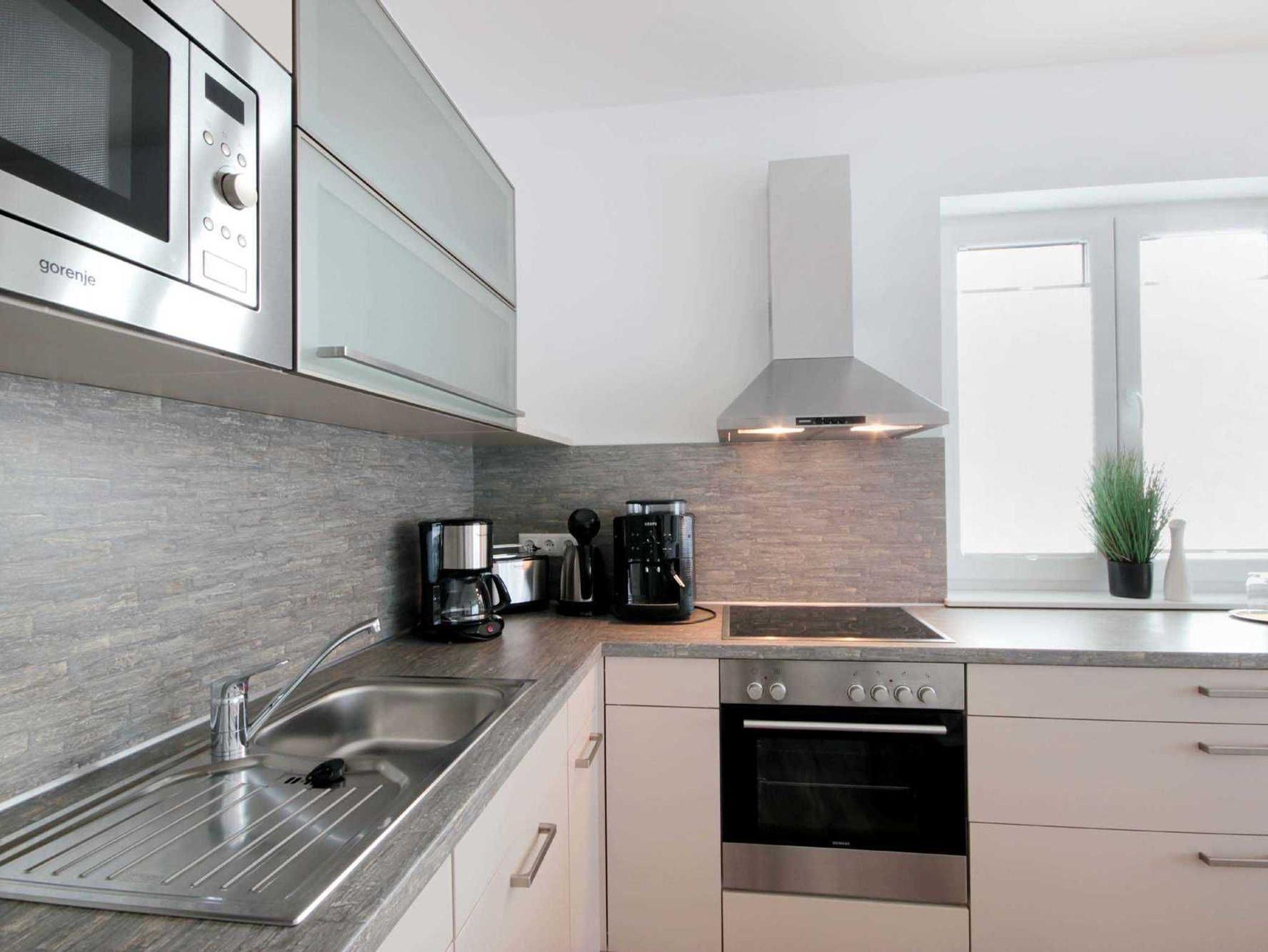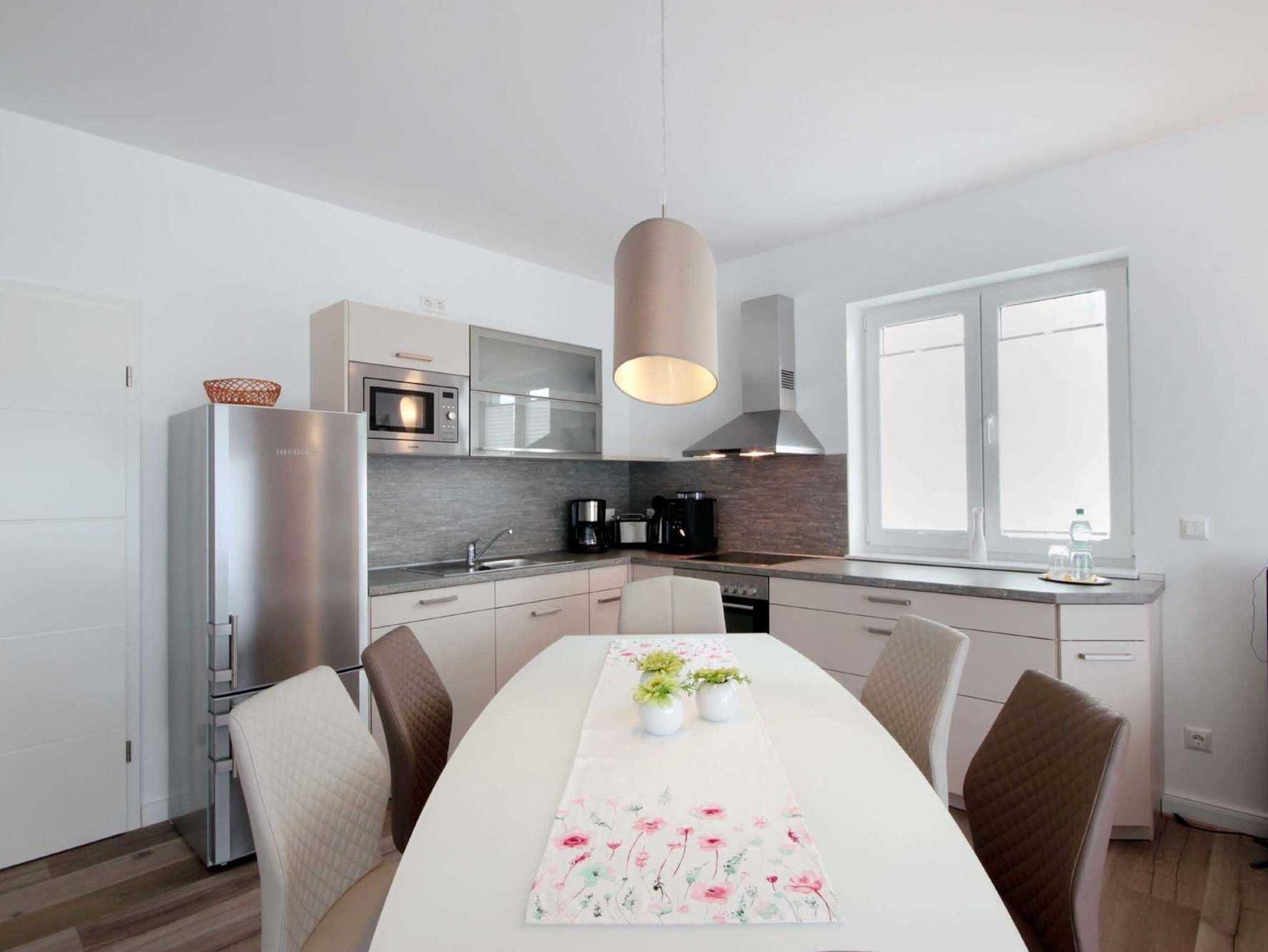 Im EG befindet sich der Wohnbereich mit einer großzügigen Sitzgruppe, Kamin sowie die moderne Küche und der Essbereich. Zur technischen Ausstattung im Wohnraum zählt ein Flachbildfernseher (65-Zoll) und der kostenfreie Internetzugang. Die Küche ist mit Backofen, Cerankochfeld, Mikrowelle, Geschirrspülmaschine, Kühl-/Gefrierkombination, Kaffeevollautomat, Wasserkocher, Toaster und diversen anderen Küchenhelfern komplett ausgestattet. Darüber hinaus gibt es Tageslicht-Duschbad mit Waschtisch, Waschmaschine und WC.