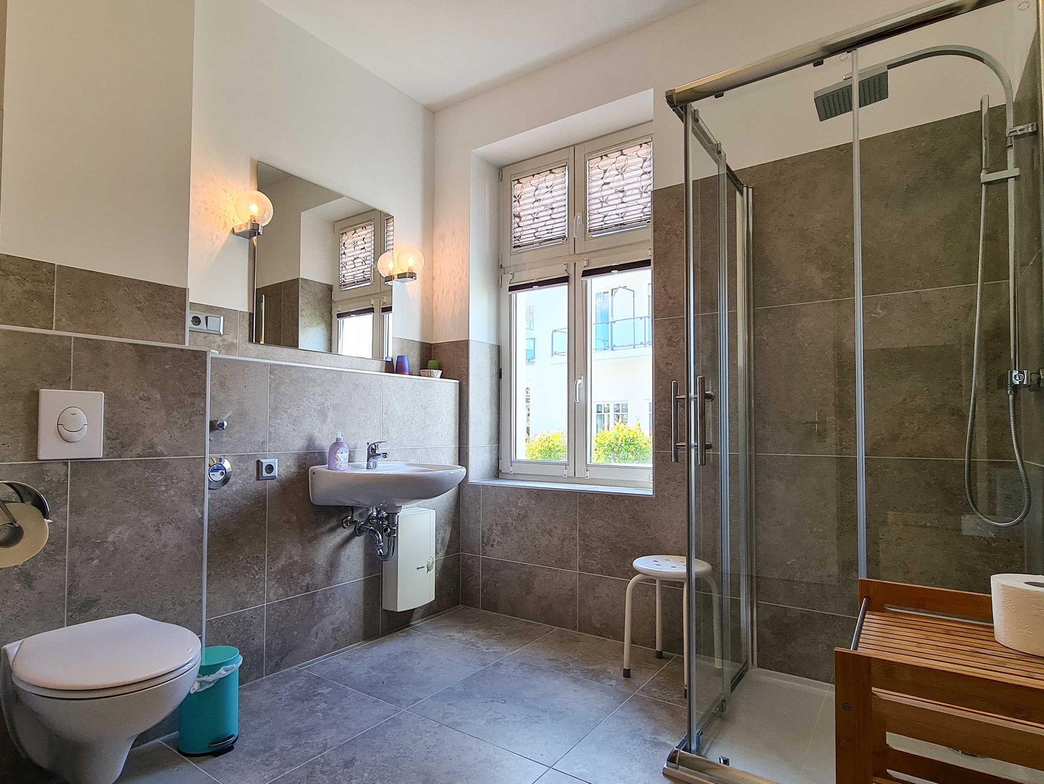 * Badezimmer mit Dusche, Waschtisch, WC und Fön