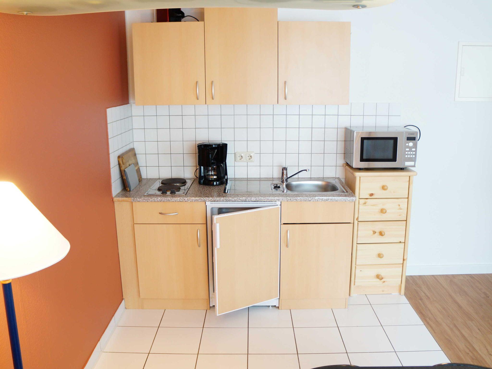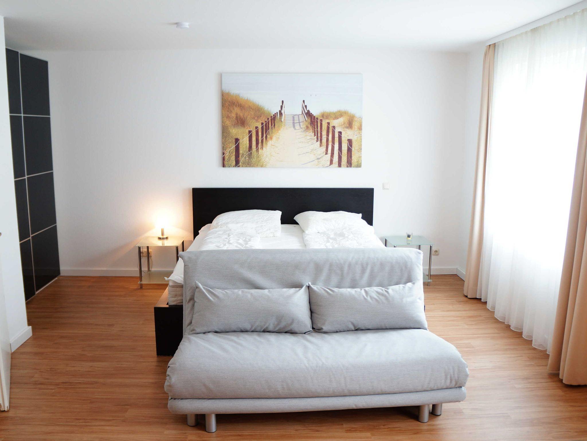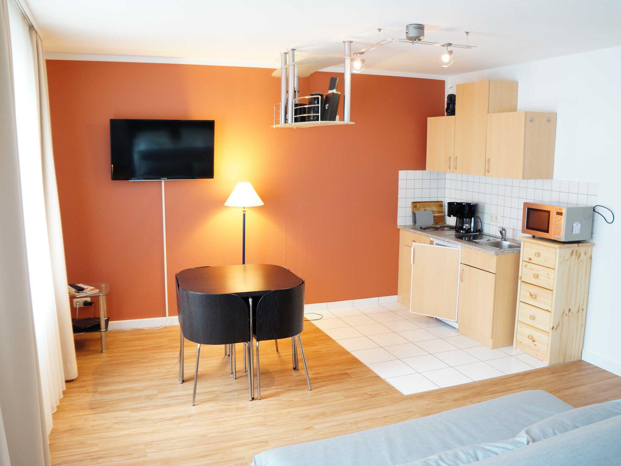 Die 1-Raum-Ferienwohnung ist 36 m² groß und wie folgt eingerichtet: Doppelbett und Kleiderschrank, Sitzecke mit Schlafsofa, TV, komplett eingerichtete Pantryküche (2 Plattenherd, Kaffeemaschine, Nespressomaschine, Toaster, Wasserkocher, Mikrowelle, Eierkocher und Kühlschrank) und kleine Essecke.