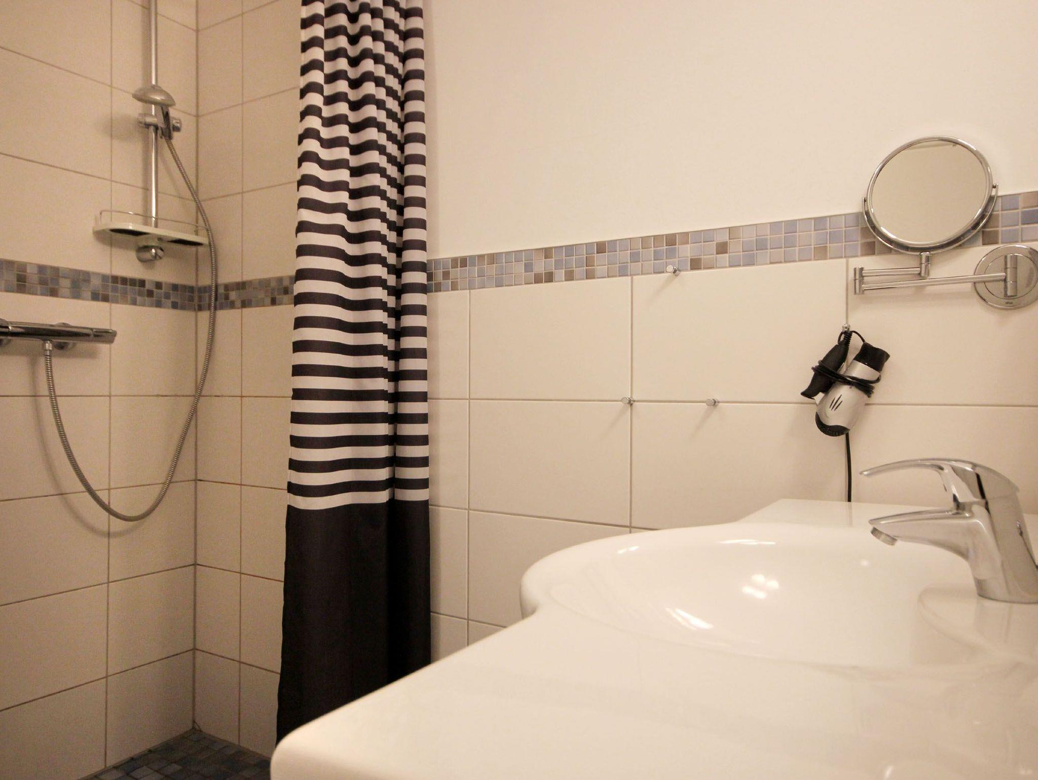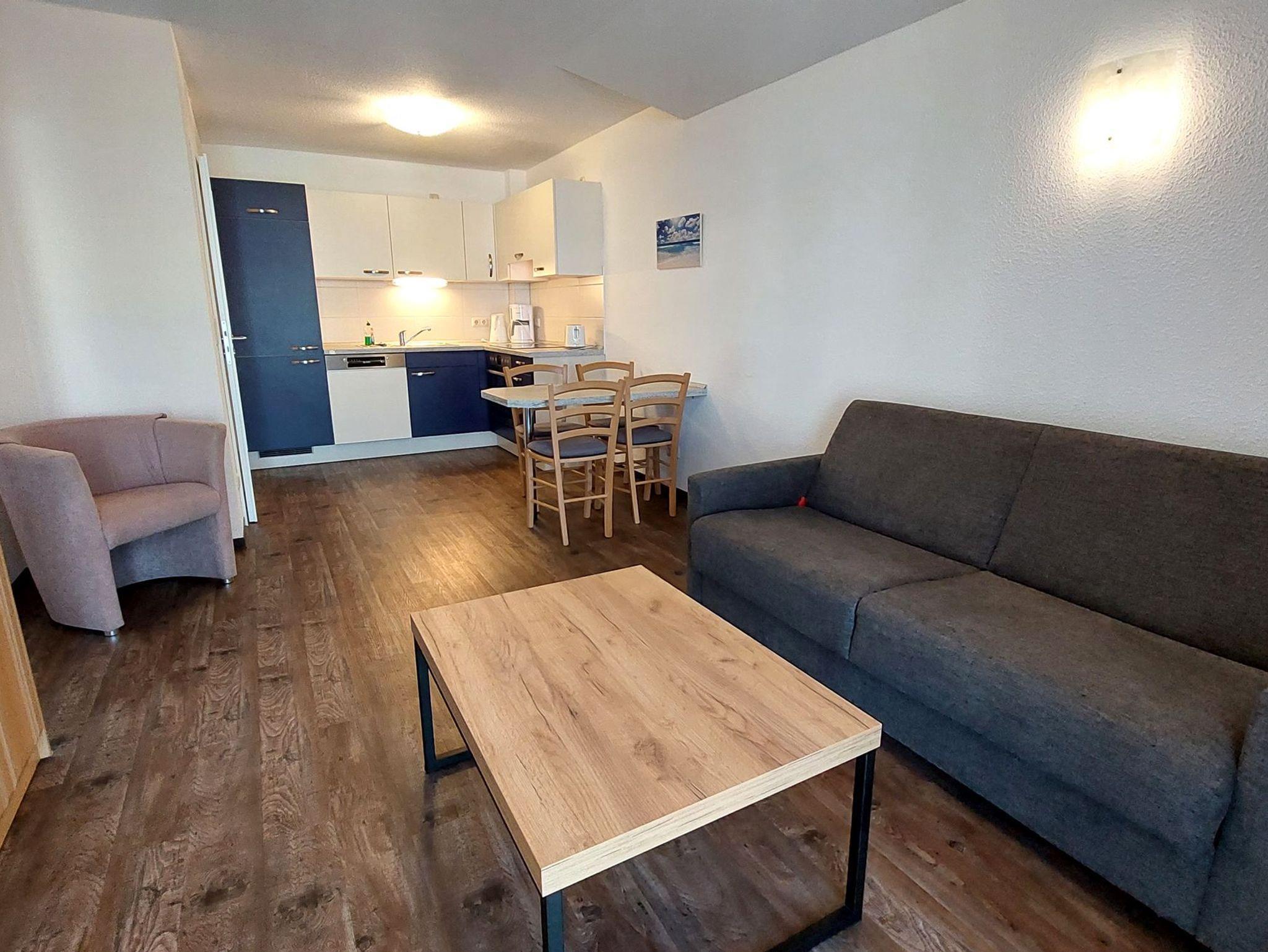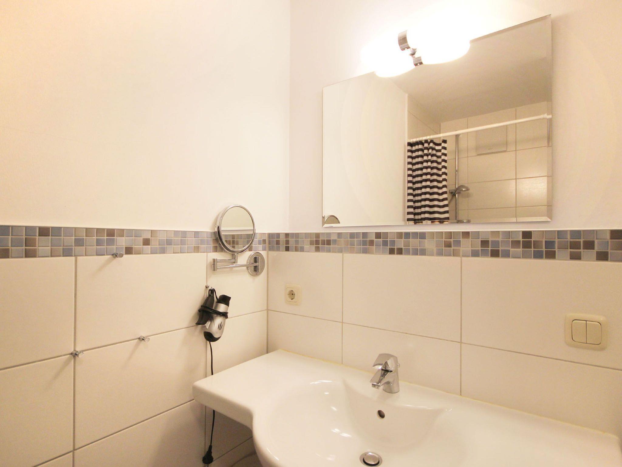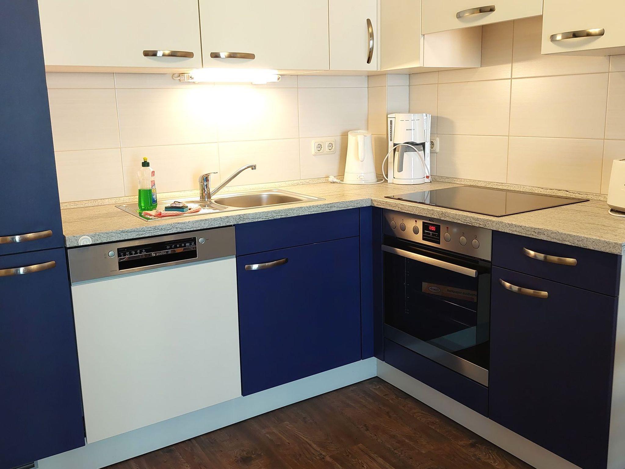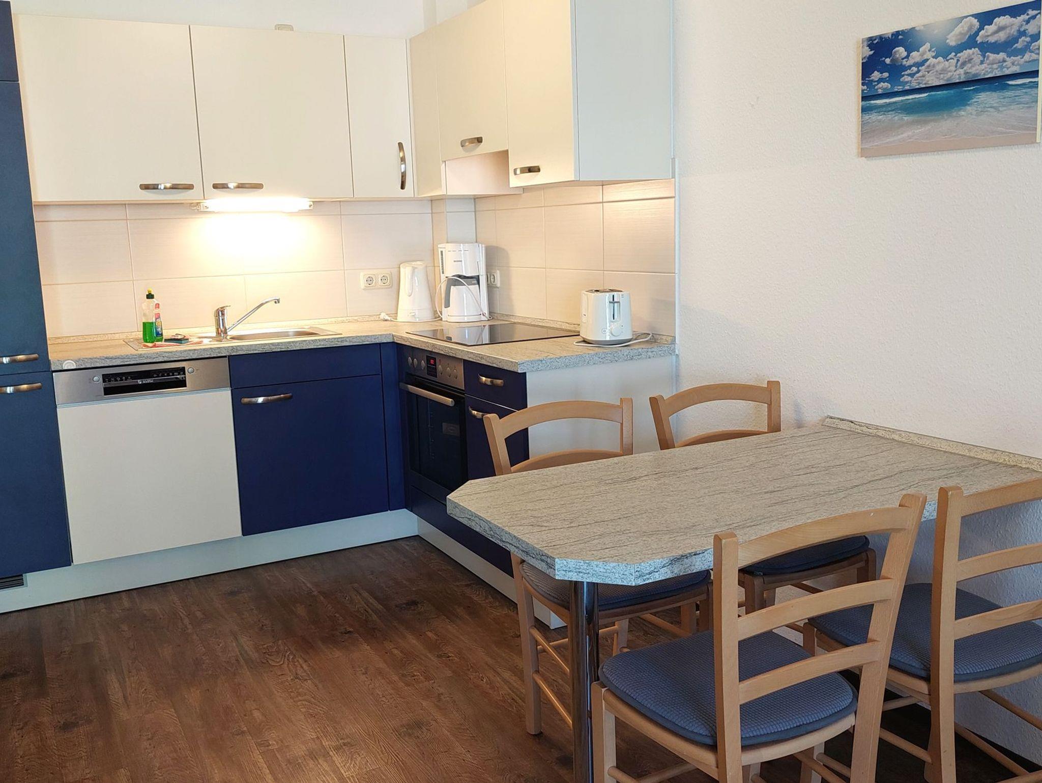 Diese freundliche Wohnung ist aufgeteilt in einen Wohnraum mit französischem Balkon und integrierter Küchenzeile, ein Schlafzimmer ebenso mit Zugang zum Balkon und ein Duschbad mit Waschtisch und WC. Das Wohnzimmer begrüßt Sie mit einem Schlafsofa und Sessel sowie Flachbild-TV. Das Schlafzimmer verfügt über ein Doppelbett (1,80m x 2m) sowie einen Kleiderschrank. Die Küchenzeile ist mit Backofen, Geschirrspüler, Cerankochfeld, Kühlschrank mit kleinem Gefrierfach, Cerankochfeld, Mikrowelle, Kaffeemaschine, Wasserkocher und Toaster ausgestattet. Highlights: Kostenfreies WLAN sowie ein frei wählbarer PKW-Stellplatz direkt am Haus.