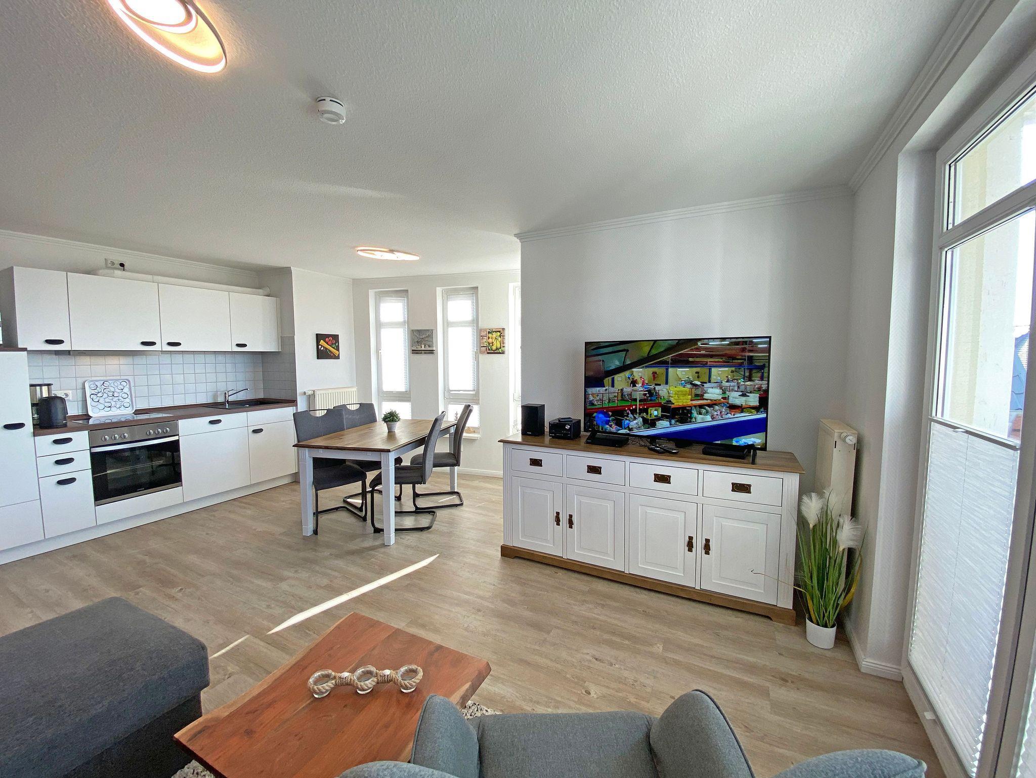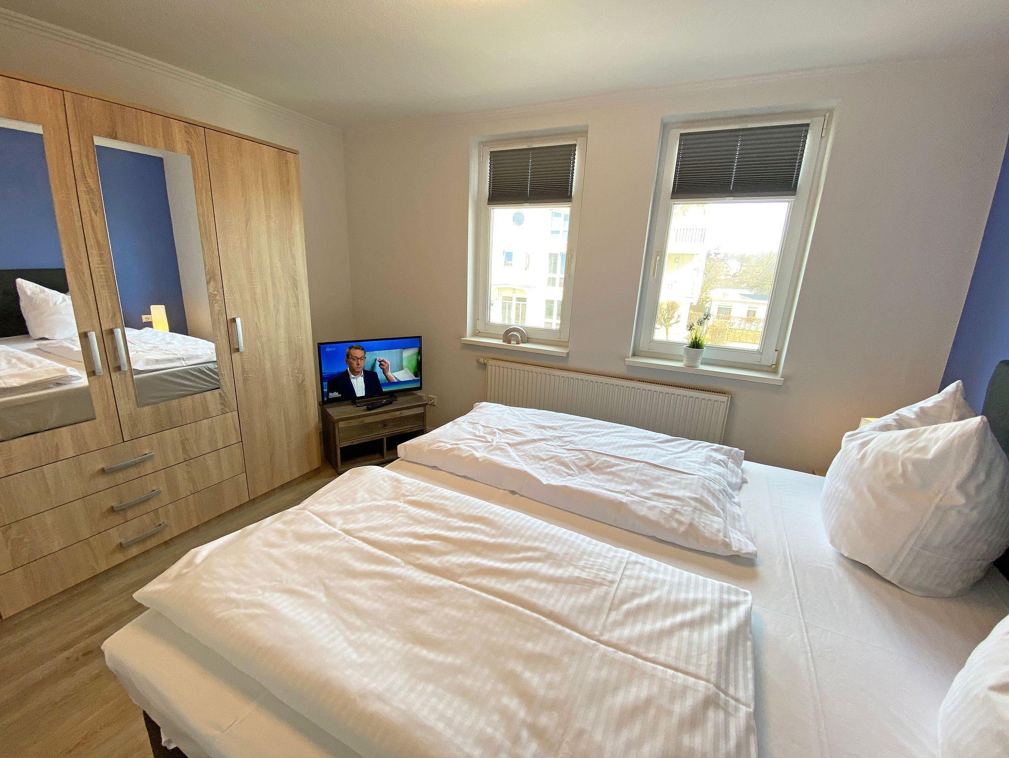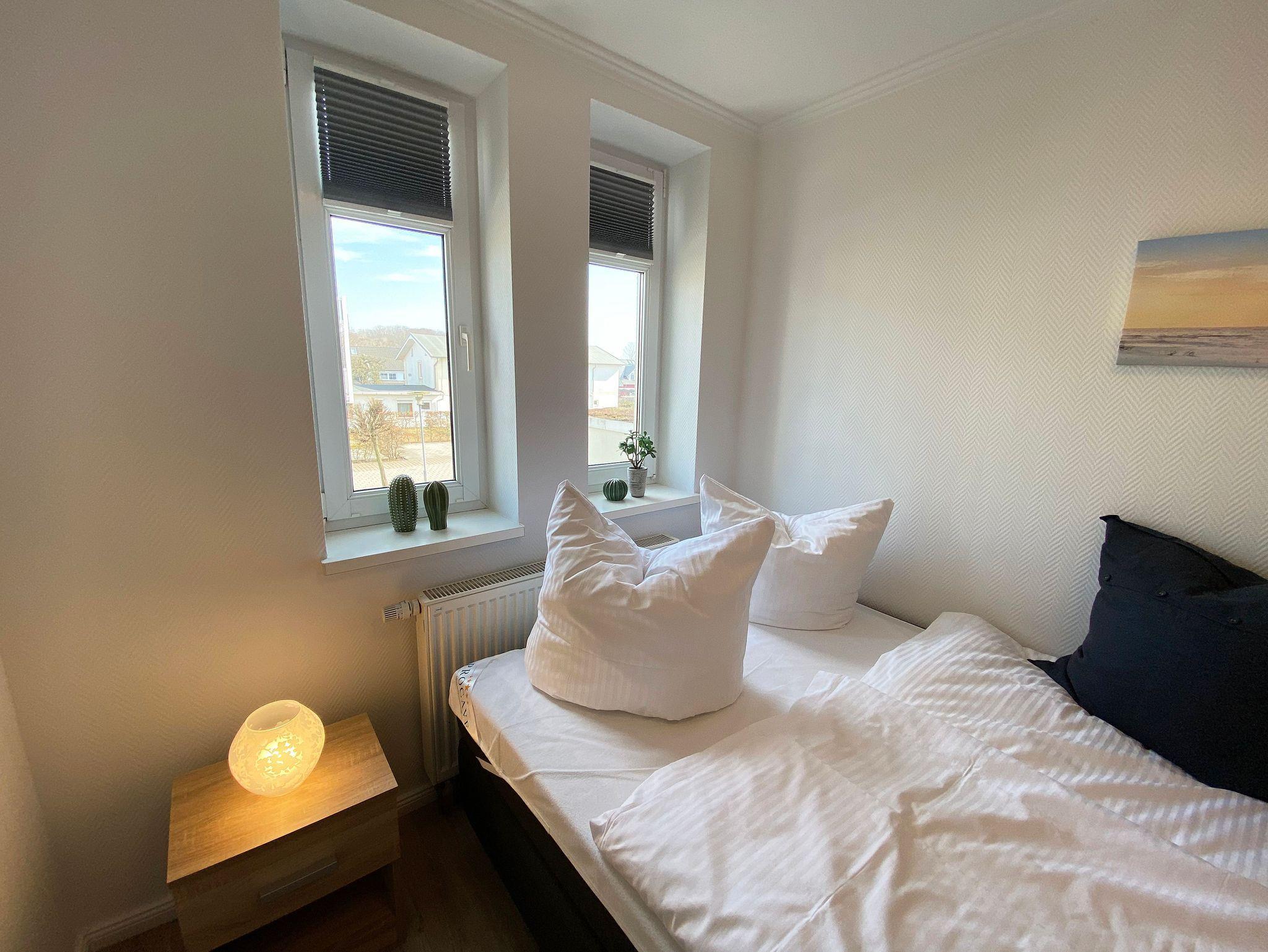 Unsere komfortable Nichtraucherwohnung von ca. 60 qm für 2 bis max. 4 Erwachsene und 1 Kleinkind im Kinderreisebett bis 3 Jahre verfügt über ein Schlafzimmer mit einem Boxspringbett (1,80m x 2,00m), einen Kleiderschrank, Nachttische, ein Sideboard sowie ein zweiter Smart-TV. Im zweiten kleineren Schlafzimmer befindet sich ein Boxspringbett (1,40m x 2,00m), ein weiterer Kleiderschrank sowie ein Nachttisch. Vom hellen Wohnbereich mit einem 2-Sitzer, Sessel, Vitrine, TV-Board, mit Smart TV und Ministereoanlage gelangen Sie auf den bestuhlten Balkon mit Sonnenschirm und können von hier aus den einmaligen Blick auf die Ostsee genießen. WLAN ist für Sie inklusive nutzbar! Die moderne Küchenzeile bietet Ihnen einen Esstisch mit 4 Stühlen, einen Geschirrspüler, ein 4 Zonen-Ceranfeld mit Backofen, eine Mikrowelle, ein Toaster, eine Kaffeemaschine, ein Wasserkocher, ein Kühlschrank mit Eisfach, eine Dunstabzugshaube sowie diverse Küchenutensilien. Das Badezimmer mit Fenster ist mit einer Dusche, einem WC, ein Kosmetikspiegel und einen Fön ausgestattet. Die Fenster verfügen teilweise über einen Insektenschutz. Ein Kinderreisebett (ohne Matratze und Bett Inlett) und ein Hochstuhl können für unsere kleinen Gäste gegen eine Gebühr gestellt werden. Ein PKW-Stellplatz (Nr. 04) sowie eine Unterstellmöglichkeit für Ihre Fahrräder ist direkt am Haus vorhanden. Ein Haustier ist gegen eine Gebühr ein gern gesehener Gast. Die Erstausstattung eines Wäschepaketes (komplette Bettwäsche, 1 Duschhandtuch, 1 kleines Handtuch) können Sie bis 14 Tage vor der Anreise gegen einen Aufpreis dazu buchen oder durch eigene ergänzen. Ab 2 gebuchten Paketen erhalten Sie einmalig 1 Geschirrtuch und einen Duschvorleger dazu.