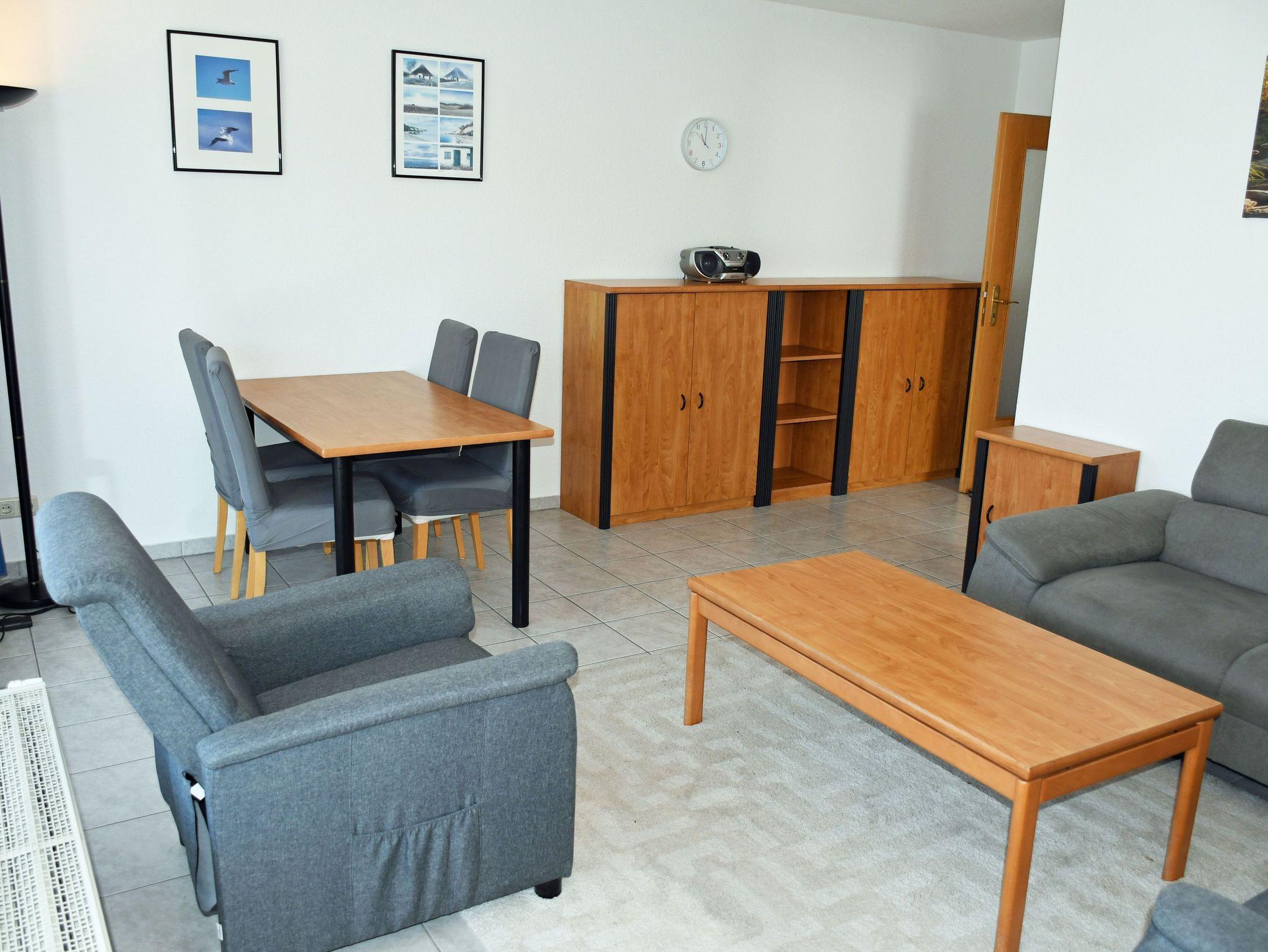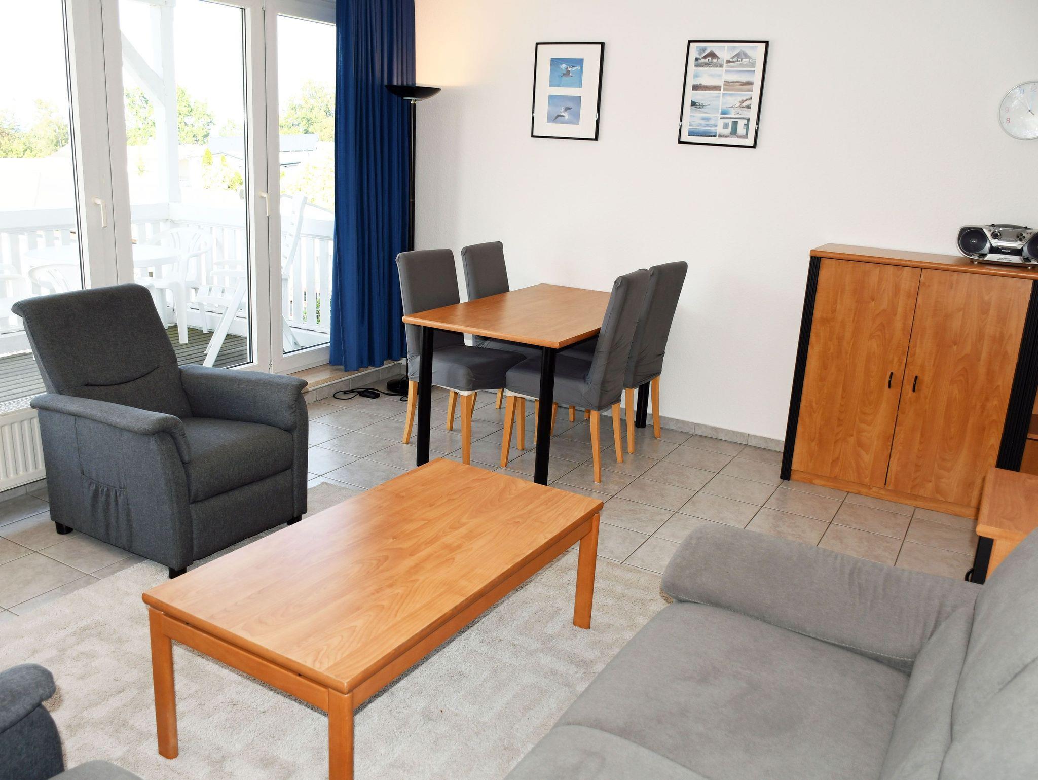 · Wohnbereich mit ausziehbarer, moderner Doppelbettschlafcouch (150 x 200 cm), 2 Sesseln, Couchtisch, Anrichte, Flat-TV, Radio und Esstisch mit 6 Stühlen