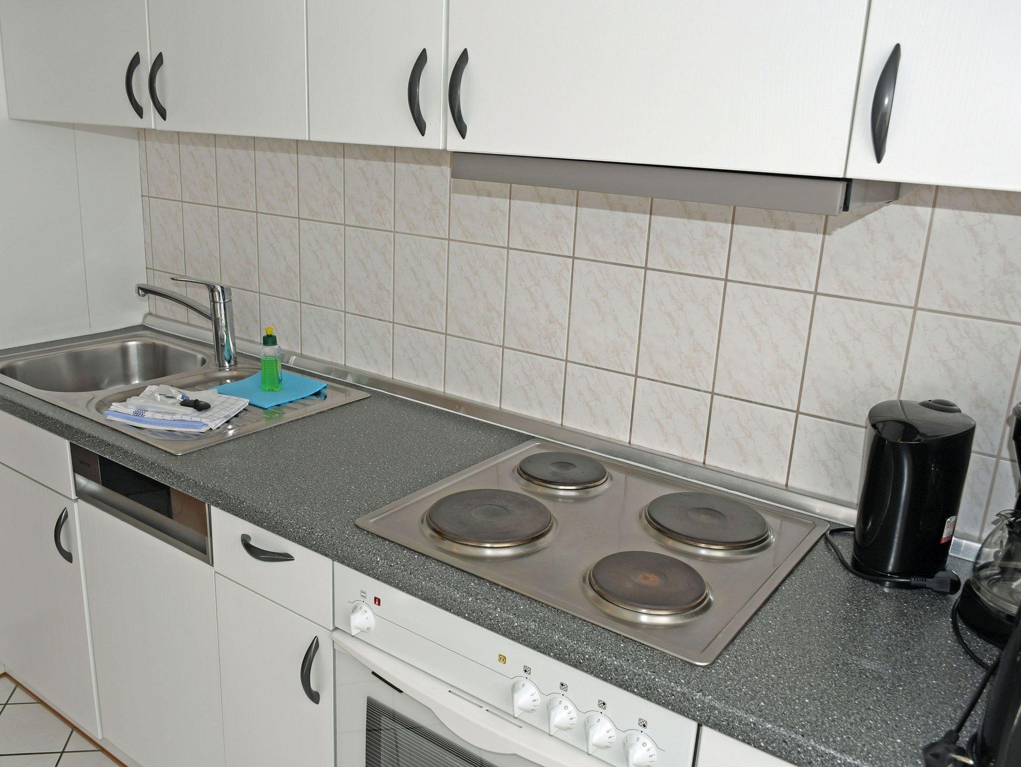 · Einbauküche im Wohnbereich integriert, ausgestattet mit: 4-Platten-Kochfeld, Backofen, Dunstabzugshaube, großer Kühlschrank mit Gefrierfach, Geschirrspüler, Toaster, Kaffeemaschine, Wasserkocher und Küchenutensilien