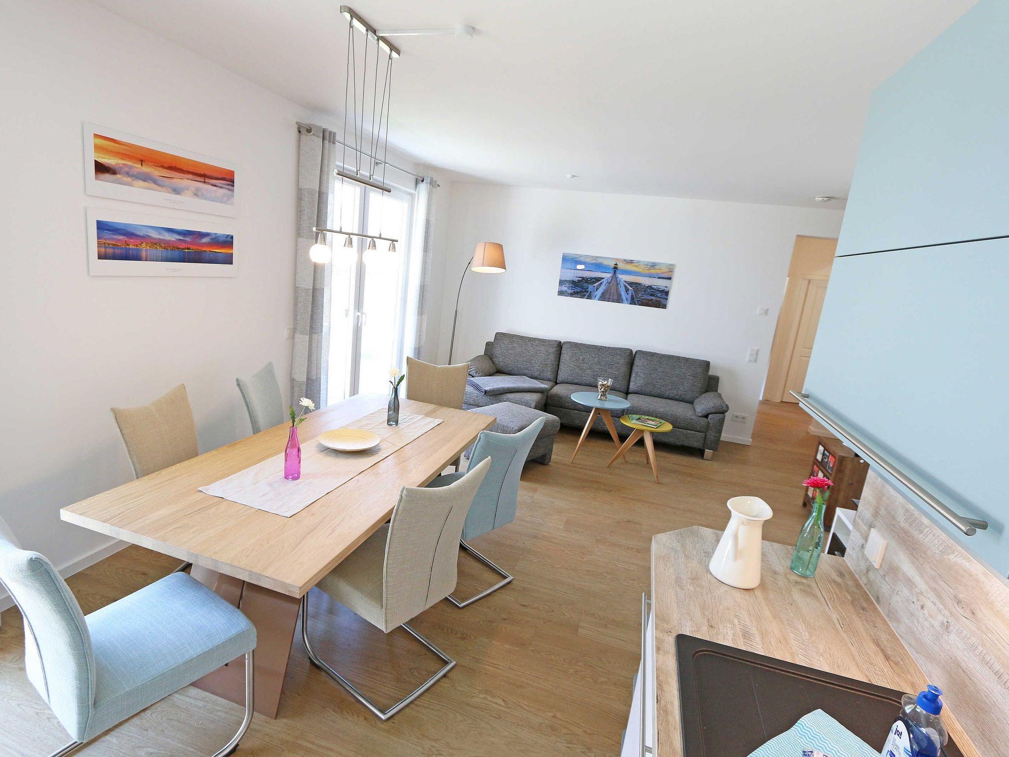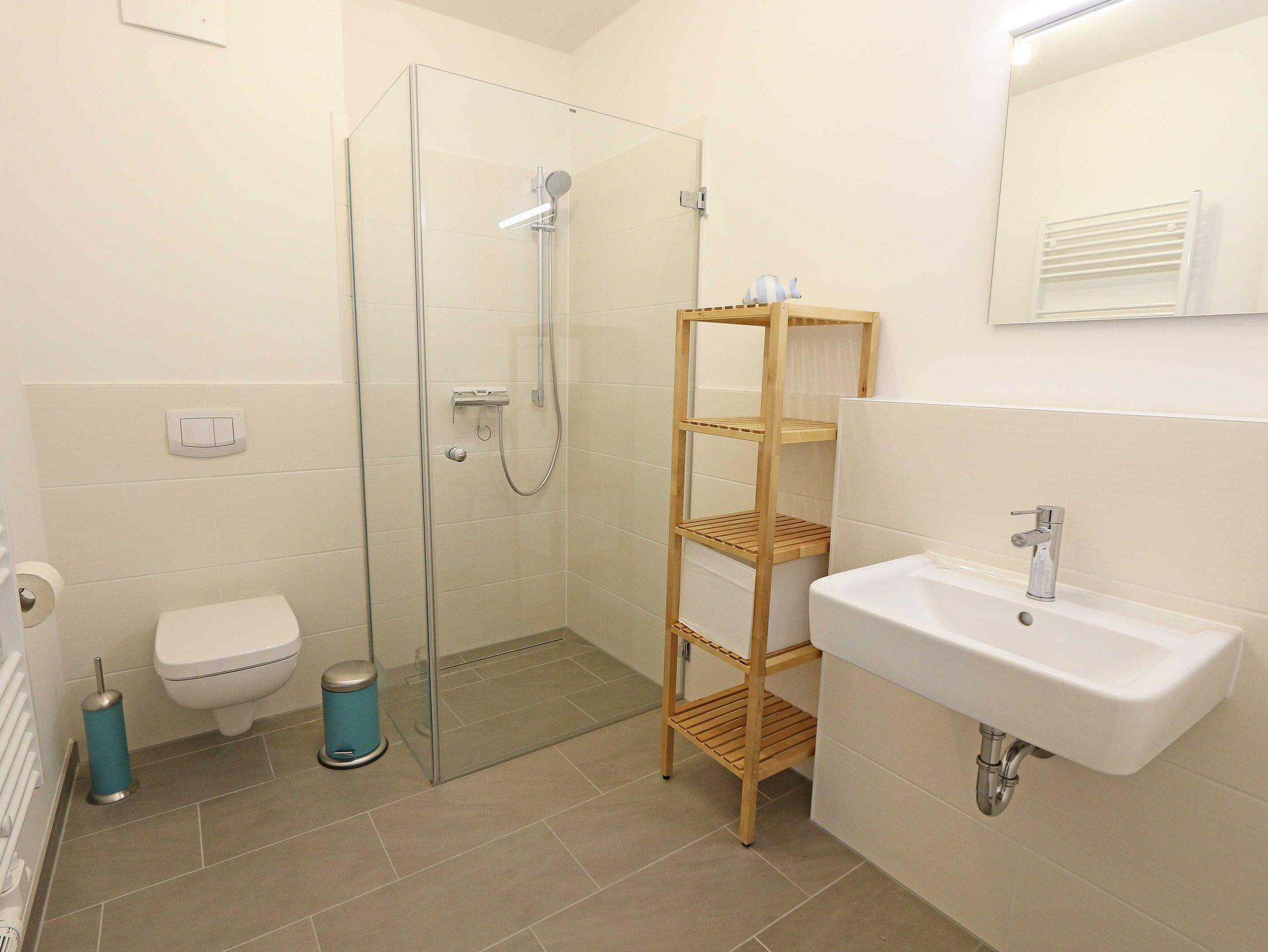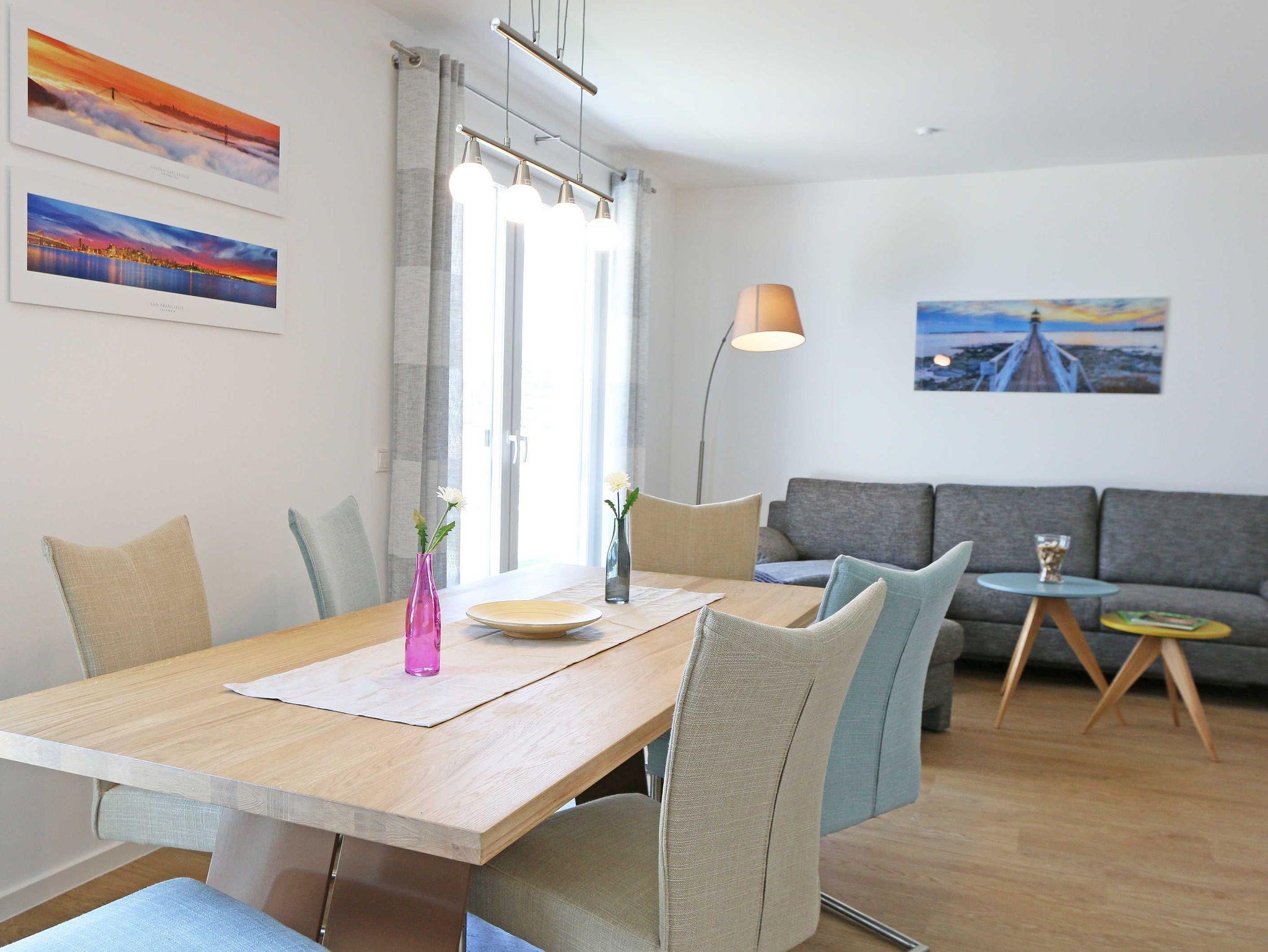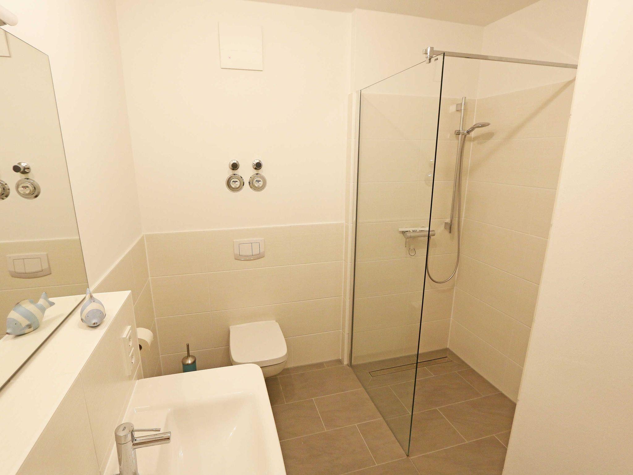 Die Wohnung Nr. 3 in der Villa Anni ist eine komfortable, ca. 83 m² große und stilvoll eingerichtete Nichtraucherferienwohnung im Erdgeschoss. Sie bietet mit ihren 3 Schlafzimmern ausreichend Platz für 5 Erwachsene + 1 Kleinkind bis 3 Jahre im Kinderreisebett. Zusätzlich kann auf die Couch im Wohnbereich zur Schlafcouch erweitert werden. Der kombinierte Wohn-/Koch- und Essbereich mit der modernen und integrierten Küchenzeile lässt mit Ceranfeld, Backofen, Geschirrspüler, Mikrowelle, Kühlschrank mit Gefrierfach, Kaffeemaschine, Senseo Padmaschine, Wasserkocher, Toaster und diversen Küchenutensilien keine Wünsche offen. Ein großzügiger Essbereich fügt sich der Küchenzeile an. Der offene Wohnbereich verfügt über eine gemütliche Sitzecke mit Couchtisch, eine Leselampe, ein Smart-TV, DAB-Radio, Heimkino mit LG 4K Laser Beamer und 100 Zoll Bilddiagonale, Quadral DTS 5.1 Soundsystem, einen Blu-Ray-Player sowie eine Hifi-Anlage mit Bluetooth sowie Internetradio. Auch auf einen Internetanschluss (WLAN) sowie einen Netflix Zugang, Amazon Prime, Disney+ und Sky Q mit folgenden Paketen: Serien und Dokus, Sport: Formel 1, Moto GP und Fußball Bundesliga Zugang müssen Sie in Ihrem Urlaub nicht verzichten. Dieses ist für Sie inklusive! Eine Auswahl an Gesellschaftsspielen, Blu Ray Sammlung und Urlaubslektüre sorgt für gelungene Abwechslung. Die nach Westen ausgerichtete, überdachte und bestuhlte Terrasse mit Sonnenschirm ist direkt vom Wohnbereich sowie aus einem Schlafzimmer aus zu erreichen. Das erste Schlafzimmer verfügt über ein Doppelbett mit Kaltschaummatratzen (1,60m x 2,00m / H3), Flachbild-TV, verstellbaren Lattenrosten, Nachttischablagen und einen Kleiderschrank. Das zweite Schlafzimmer verfügt über ein Doppelbett mit Kaltschaummatratzen (1,60m x 2,00m / H3), Nachttischablagen, Flachbild-TV und einen Kleiderschrank. Im dritten Schlafzimmer befindet sich ein Einzelbett (0,90m x 2,00m) mit Nachttischablage und einen Kleiderschrank. Zwei Bäder sind mit ebenerdigen Duschen, Waschplatz, WC, Kosmetikspiegel, Fön und Handtuchheizkörper ausgestattet. Ein Bad verfügt zusätzlich über eine Waschmaschine. Alle Räumlichkeiten sind mit Fußbodenheizung versehen und sorgen für eine angenehme Wärme. Für unsere kleinen Gäste steht 1x Kinderreisebett (ohne Zusatzmatratze, ohne Bettinlett) und 1x Hochstuhl inklusive zur Verfügung. Ihre Fahrräder können Sie auf der Terrasse abstellen, welche Sie von außen bequem erreichen können. Ein eigener PKW-Stellplatz (Nr. 3) befindet sich in der Tiefgarage (Einfahrtshöhe 2,00 m) des Hauses. Haustiere sind in der Wohnung nicht erlaubt! Die Erstausstattung eines Wäschepaketes (komplette Bettwäsche, 1 Duschhandtuch, 2 kleine Handtücher) können Sie bis 14 Tage vor Anreise gegen einen Aufpreis dazu buchen oder durch eigene ergänzen. Ab 2 gebuchten Paketen erhalten Sie einmalig 1 Geschirrhandtuch und 1 Duschvorleger hinzu.