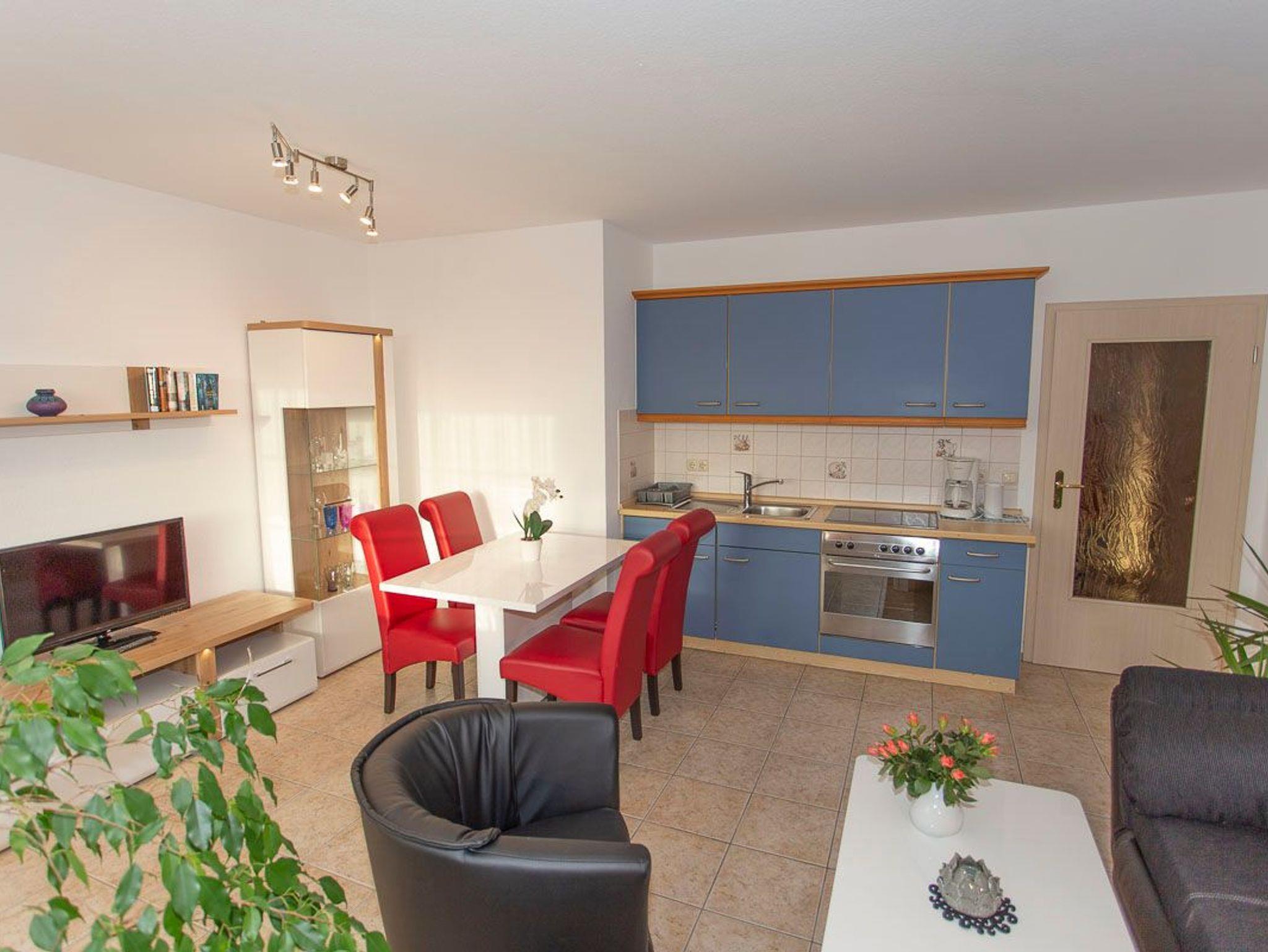Die Zweiraumwohnung bestehend aus einem Wohnzimmer mit einer offenen Küchenzeile (Wasserkocher, Toaster, Ceranfeld, Backofen, Eierkocher), einem Schlafzimmer mit einem Doppelbett und einem Bad mit Dusche/WC. Ein Parkplatz, sowie Fahrradabstellmöglichkeiten befinden sich direkt am Haus.