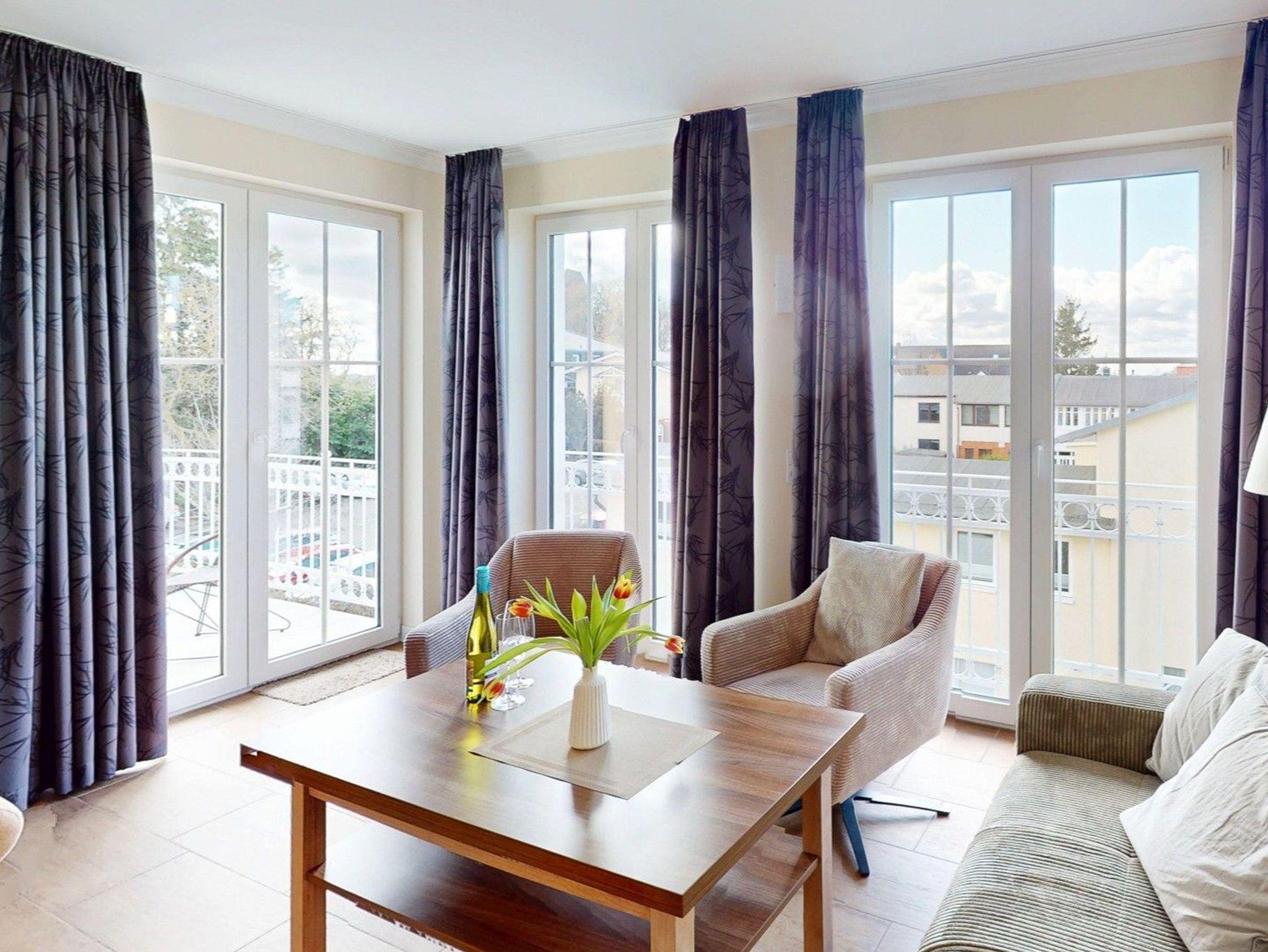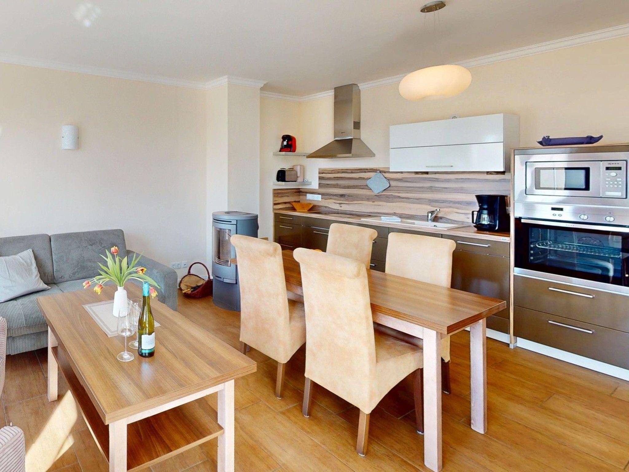 Apartmenthaus im Stil der für die Ostsee typischen Bäderarchitektur. Sie wohnen in einer 3-Zimmer-Ferienwohnung für bis zu 4 Personen mit jeweils 2 Schlafzimmern, einem Wohnraum mit Kamin, voll ausgestatteter Küchenzeile, Dusche/WC und eigener Sauna und drei Fernsehern. Zur Wohnung gehören zudem 2 Balkone.