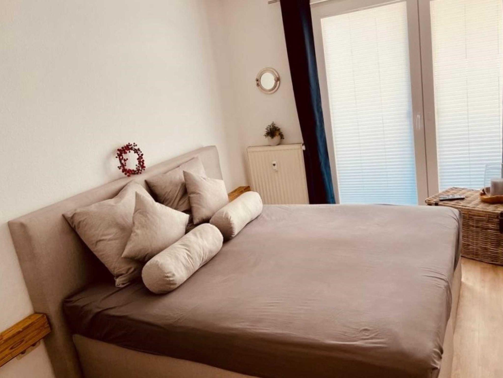 Das freundlich eingerichtete Schlafzimmer hält ein Boxspringbett (180 cm x 200 cm), einen Kleiderschrank und ebenfalls Smart-TV bereit.
