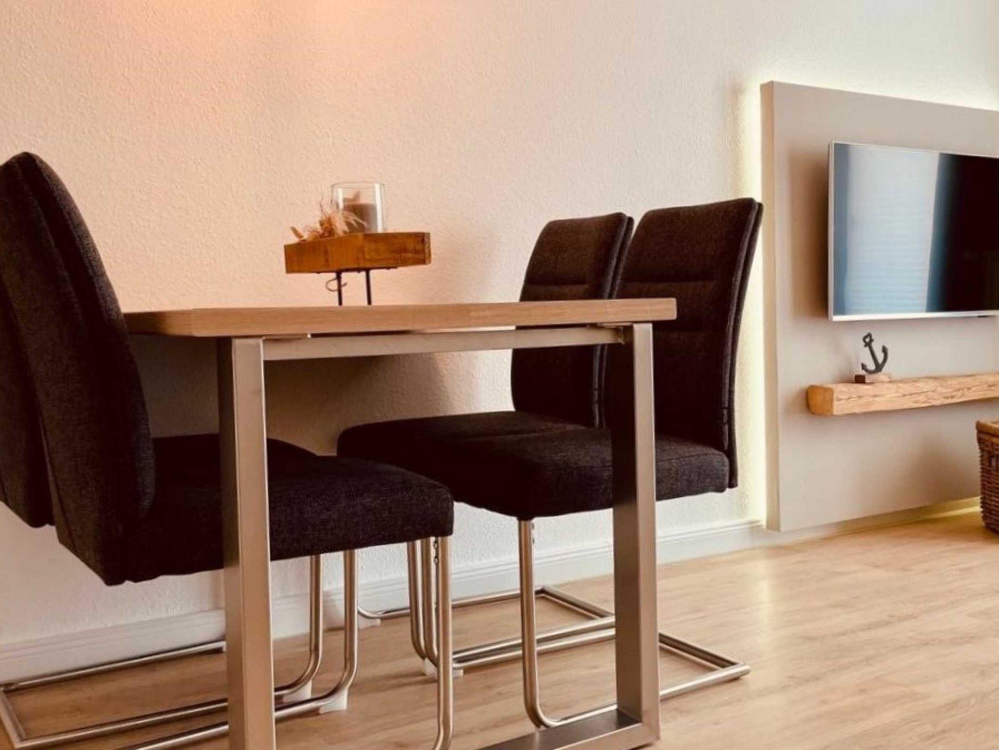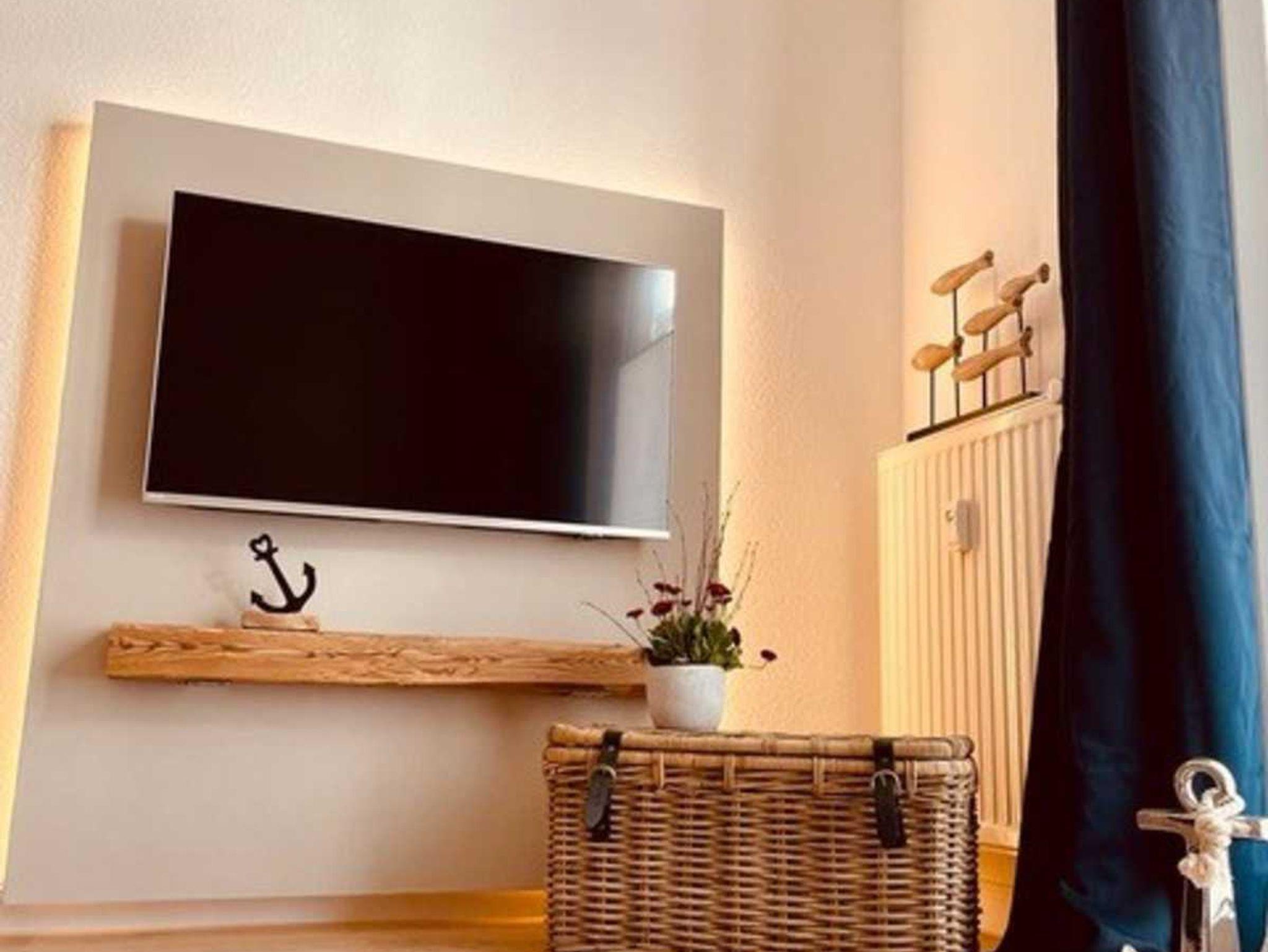 Das gemütliche Wohnzimmer verfügt über eine Wohn-/Schlafcouch mit zwei Sesseln, welches durch das Smart-TV abgerundet wird.