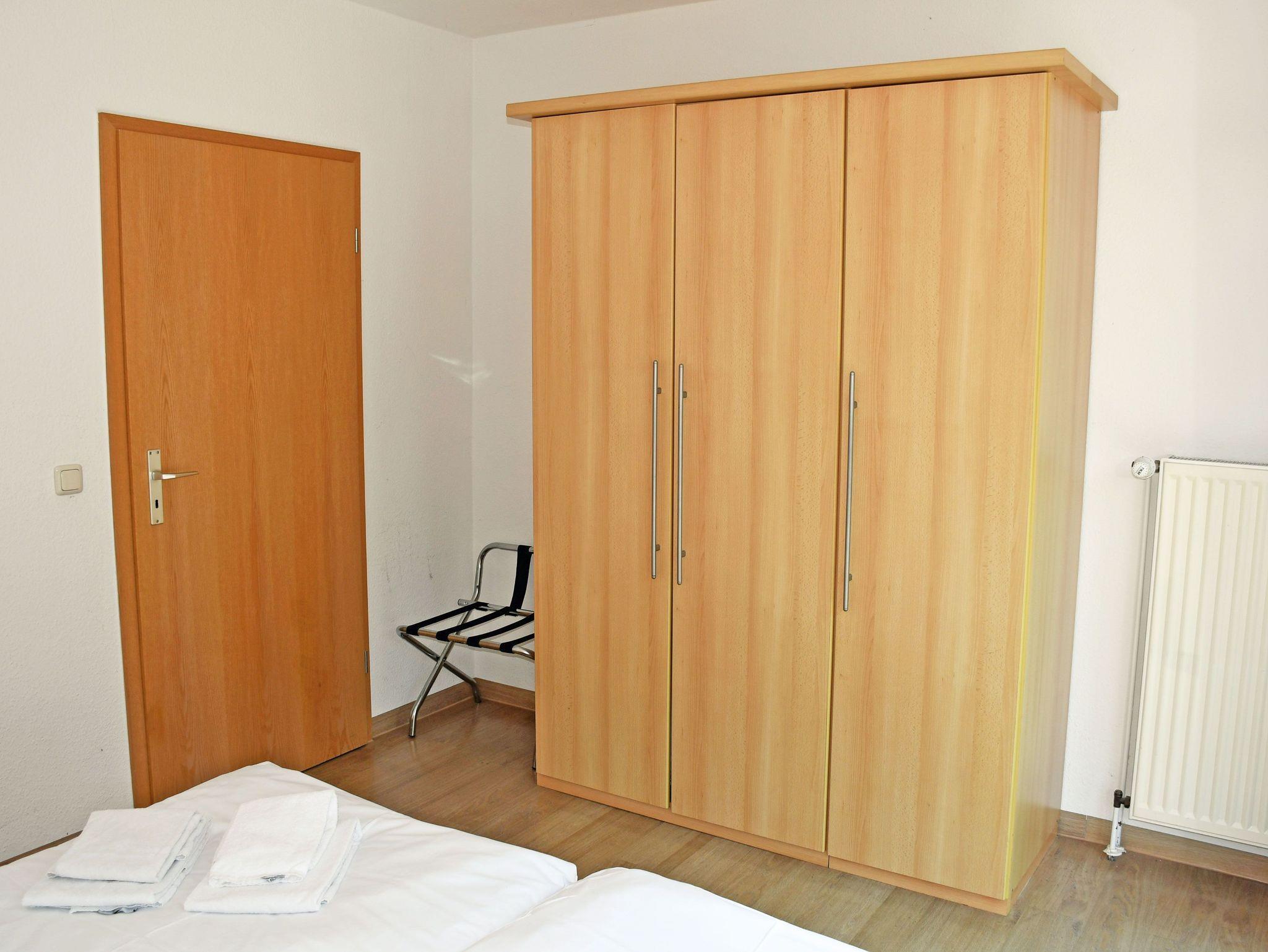 Schlafzimmer mit einem Doppelbett (180 x 200 cm) und großem Kleiderschrank