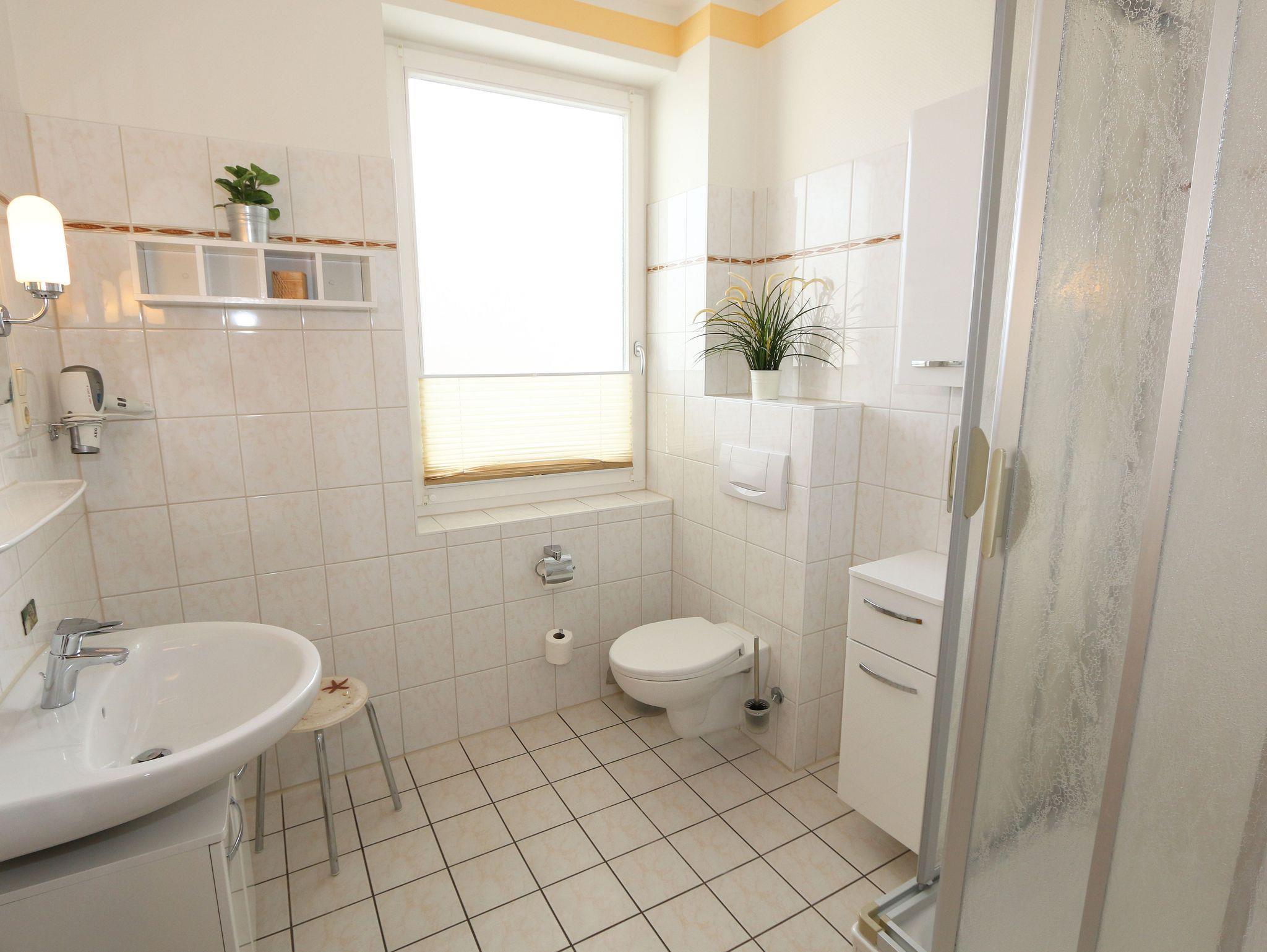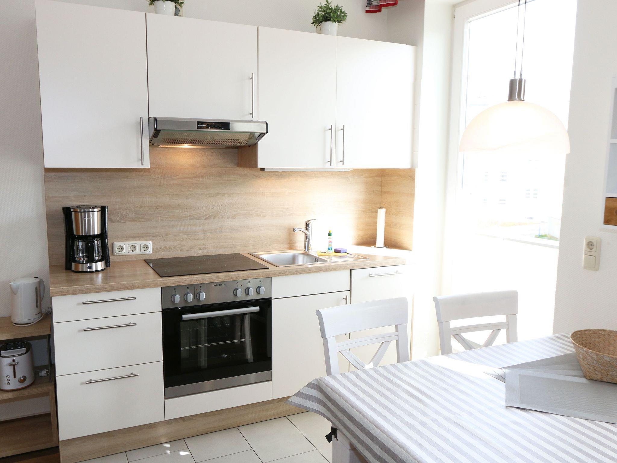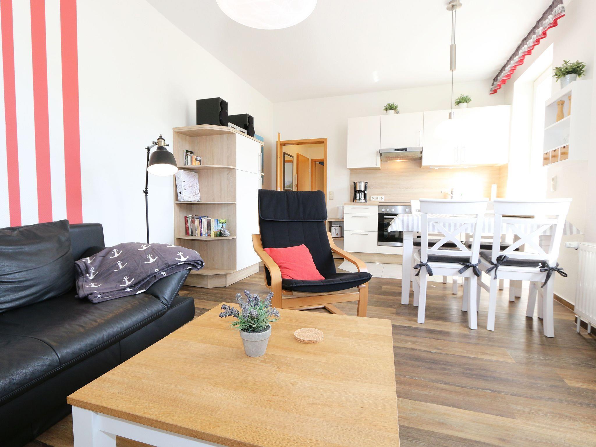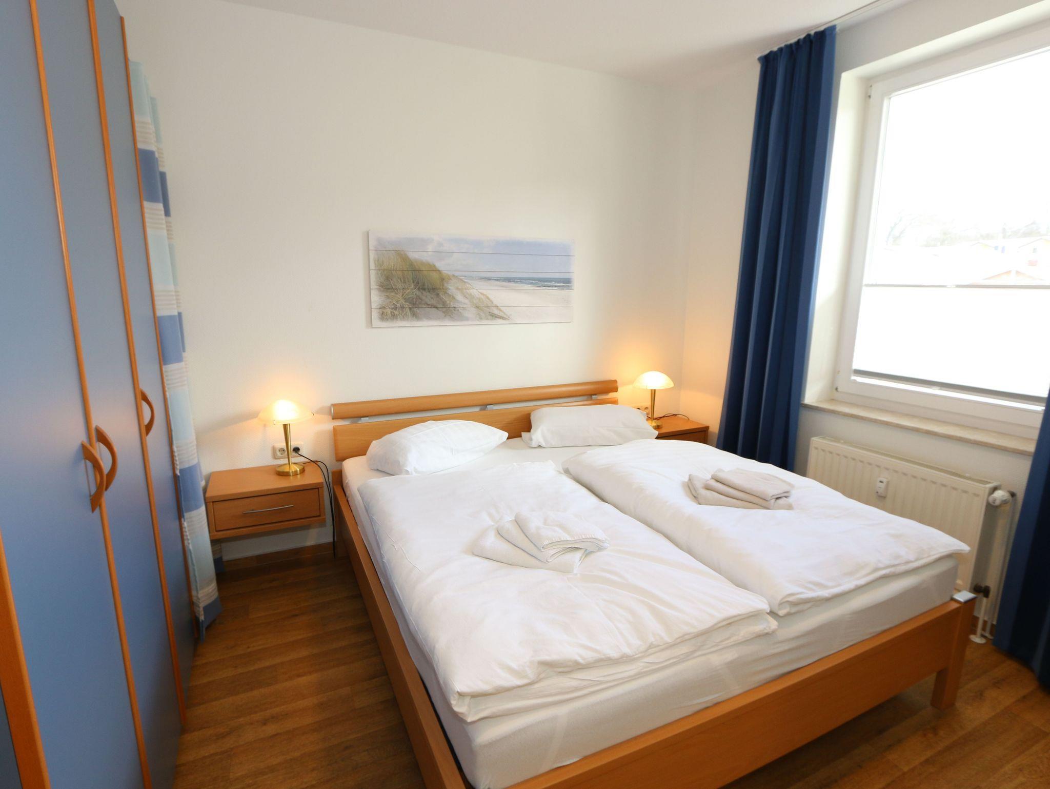 Die helle und freundliche 2-Raumferienwohnung im 2. Obergeschoss umfasst ca. 45 qm und ist eine Nichtraucherwohnung. Die Wohnung ist für max. 2 Erwachsene + 1 Kind bis 17 Jahre bis ausgestattet und bequem über das Treppenhaus oder den Aufzug zu erreichen. Sie verfügt über ein Wohn-/Esszimmer mit ausziehbarer Schlafcouch (ca.1,47 m x 2,00 m), Sessel, Couchtisch, Stehlampe, Esstisch mit Stühlen sowie über eine neue und gut ausgestattete Einbauküche mit Backofen, Ceran-Kochfeld, Spülmaschine, Kühlschrank mit Gefrierfach, Kaffeemaschine, Senseo Pad-Maschine, Wasserkocher, Toaster, Eierkocher, Mixer sowie diverse Küchenutensilien. Das Schlafzimmer ist mit einem Doppelbett (Härtegrad 2/ 1,80m x 2,00m), Nachttischablagen, einem Kleiderschrank, Insektenschutzgitter und Verdunklungsgardinen und Plissee ausgestattet. Das tagesbelichtete und geflieste Duschbad mit WC, Waschtisch, Badmöbeln und Fön bietet ausreichend Komfort für Ihren Urlaubsaufenthalt. Zu den weiteren Einrichtungsgegenständen zählen ein Flachbild-TV, Blu-Ray-Player, Stereoanlage mit CD-Player und USB-Anschluss, eine Spielesammlung, Bücher sowie ein kostenloser W-LAN Internetanschluss. Der großzügige und überdachte Balkon (Süd/Ost) mit Bestuhlung und Sonnenschirm lädt zum Entspannen ein und ist über das Wohn-/Esszimmer zu erreichen. Reinigungsutensilien sowie ein Bügelbrett und ein Bügeleisen sind zusätzlich vorhanden. Der PKW-Stellplatz befindet sich direkt am Haus. Ein abschließbarer Gemeinschaftsabstellraum und Fahrradständer hinter dem hauseigenen Parkplatz sind ebenso nutzbar. Die Mitnahme eines Haustieres ist gegen eine Gebühr möglich. Die Erstausstattung eines Wäschepaketes (komplette Bettwäsche, 1 Duschhandtuch, 2 kleine Handtücher, 2 Geschirrhandtücher) können Sie bis 14 Tage vor Anreise gegen einen Aufpreis dazu buchen oder durch eigene ergänzen.