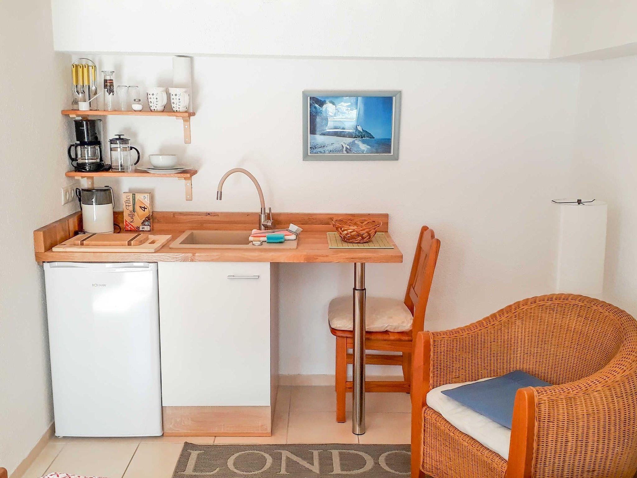 Das 25m² Ferienzimmer Strandhafer bietet Platz für 1 Person und besteht aus einem Schlafzimmer mit Doppelbett und TV sowie einem Badezimmer mit Dusche und WC. Weiterhin stehen dem Gast ein Kühlschrank, etwas Geschirr, ein Toaster, ein Wasserkocher, ein Eierkocher und ein Kaffeebereiter zur Verfügung. Abends kann die Terrasse mit Sitzgelegenheiten zum Entspannen genutzt werden. Parkplätze steht im Hinterhof zur Verfügung.