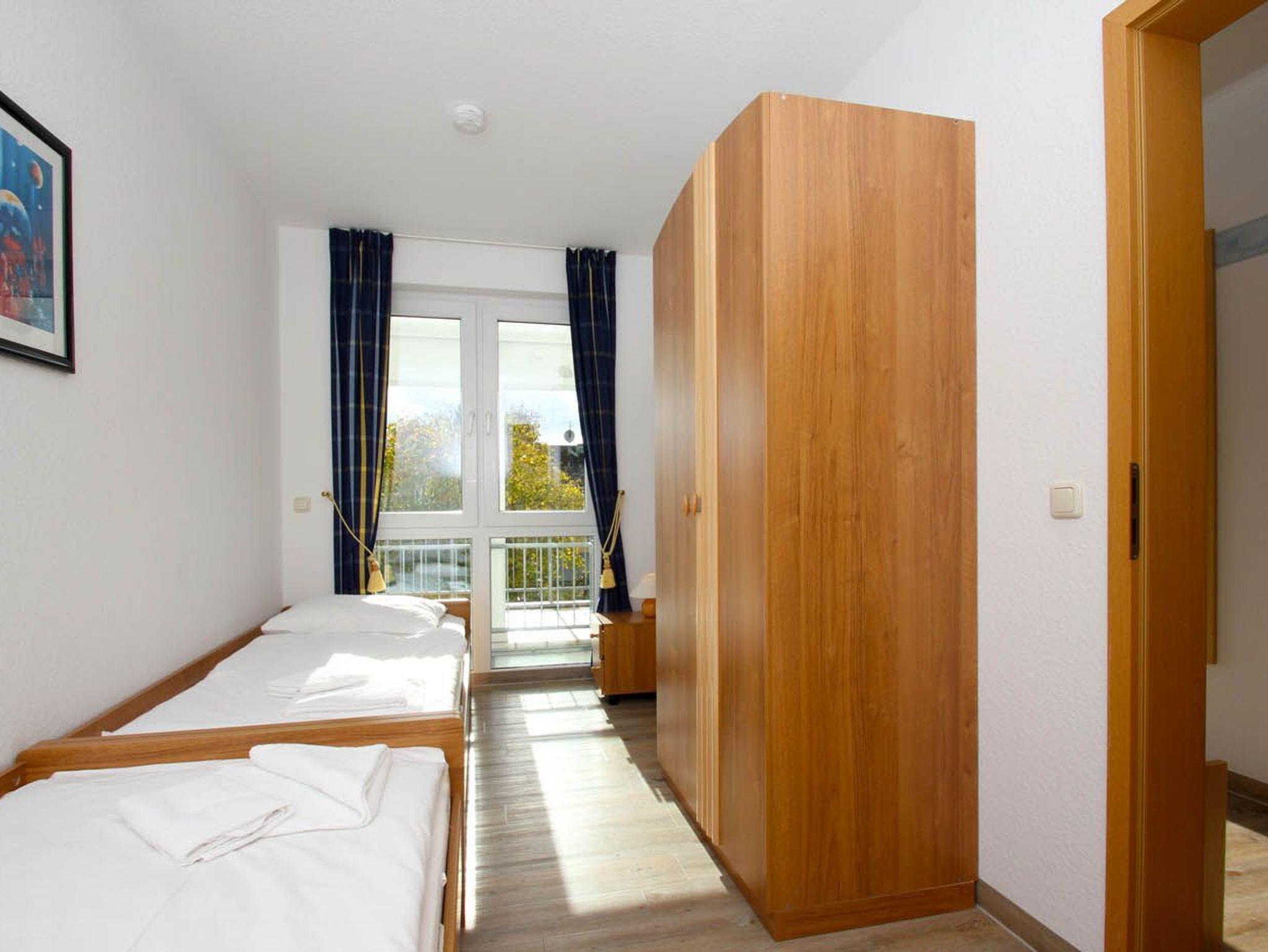 Schlafzimmer mit 2 getrennt stehenden Betten (90 x 200 cm) und kleinem Kleiderschrank