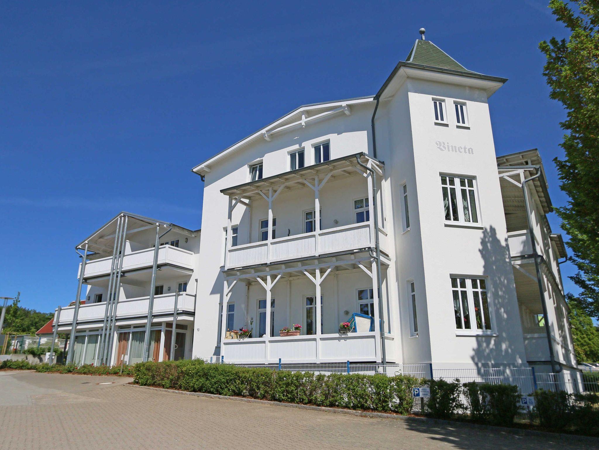 Die gemütliche 2-Zimmerwohnung mit einer hellen und freundlichen Einrichtung befindet sich im 1. Obergeschoss des modernen Anbaus der Villa Vineta. Das Ortszentrum mit vielen Restaurants, Cafés und Einkaufsmöglichkeiten erreicht man in wenigen Gehminuten. Die beiden Strände, der feinsandige Nordstrand und der natürliche Südstrand, die romantische Bernsteinpromenade und die Seebrücke sind ca. 500m von der Ferienwohnung entfernt. Zur Bahnstation Rasender Roland sind es ca. 450 m. Die Wohnung bietet eine gute Ausgangslage für Wanderungen und Radtouren in die nähere Umgebung und weiter auf die Halbinsel Mönchgut. Eine Bushaltestelle mit Verbindungsmöglichkeiten zu den umliegenden Ostseebädern befindet sich in der näheren Umgebung.
