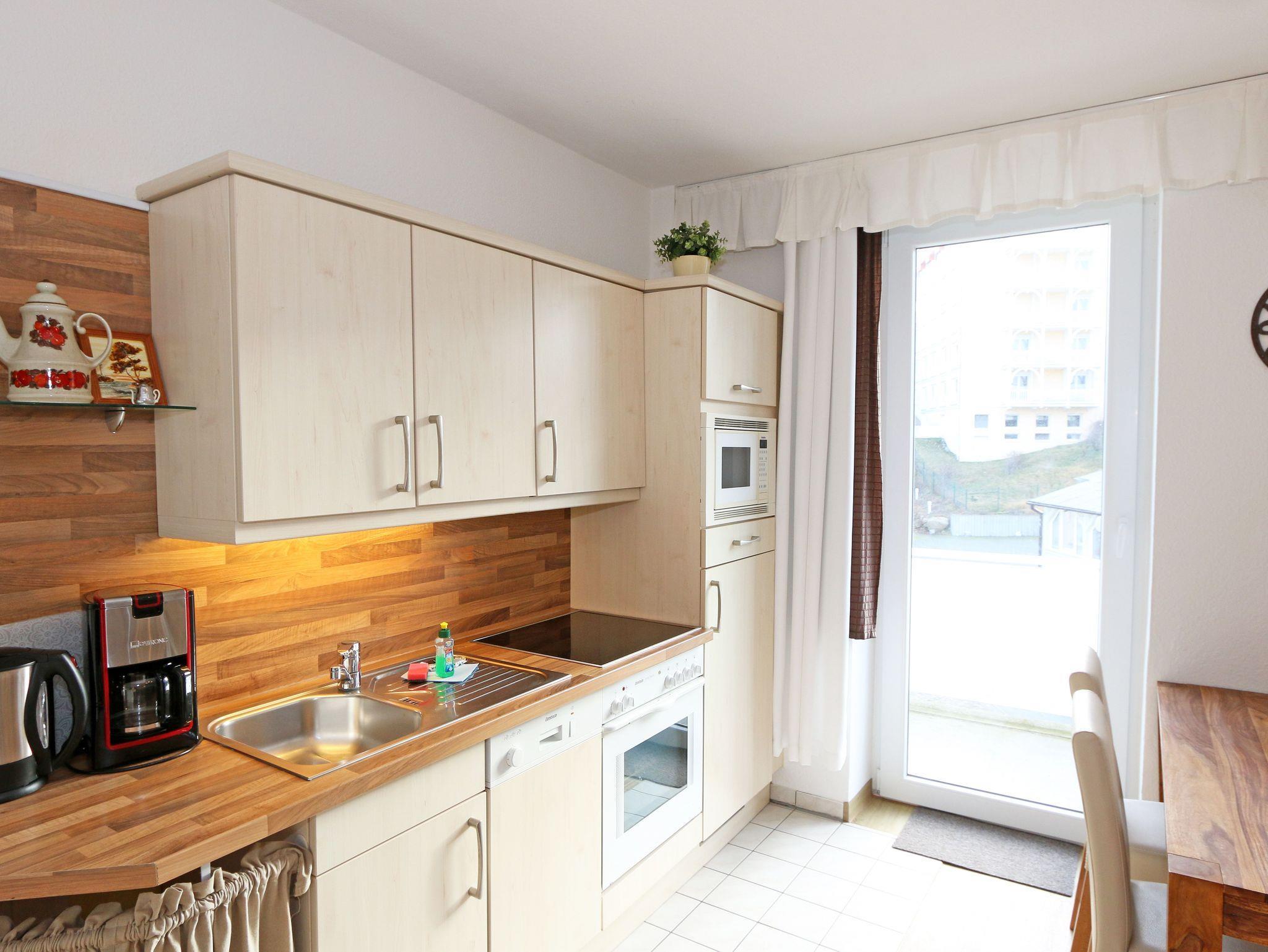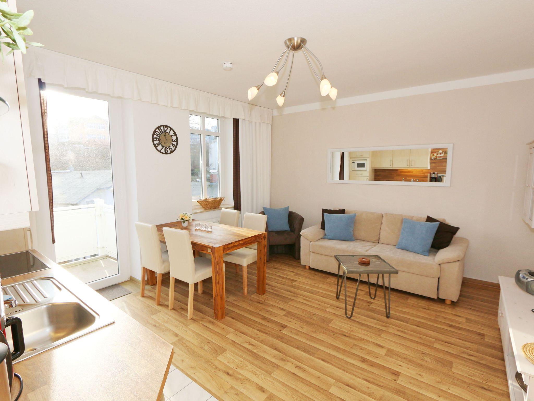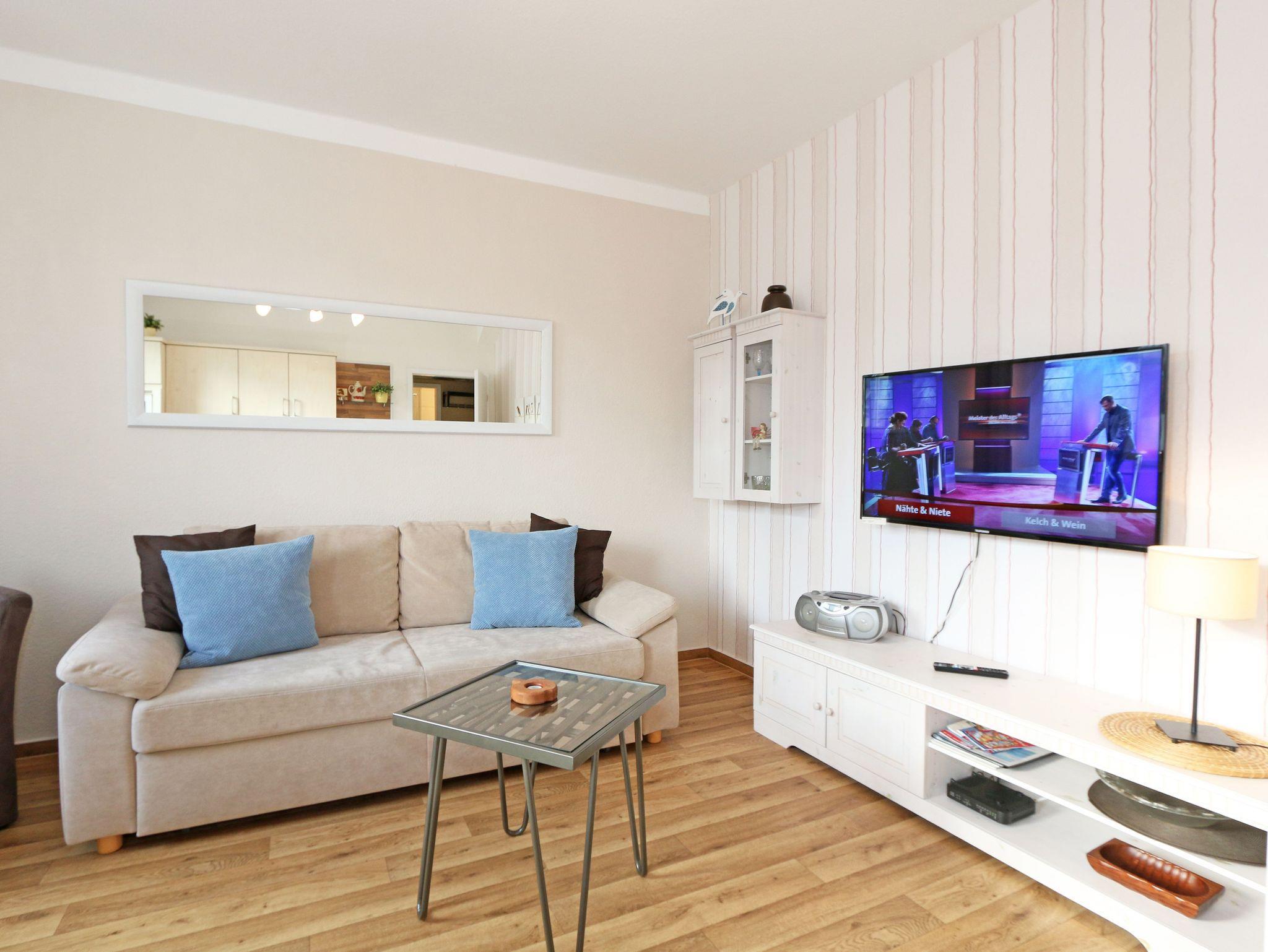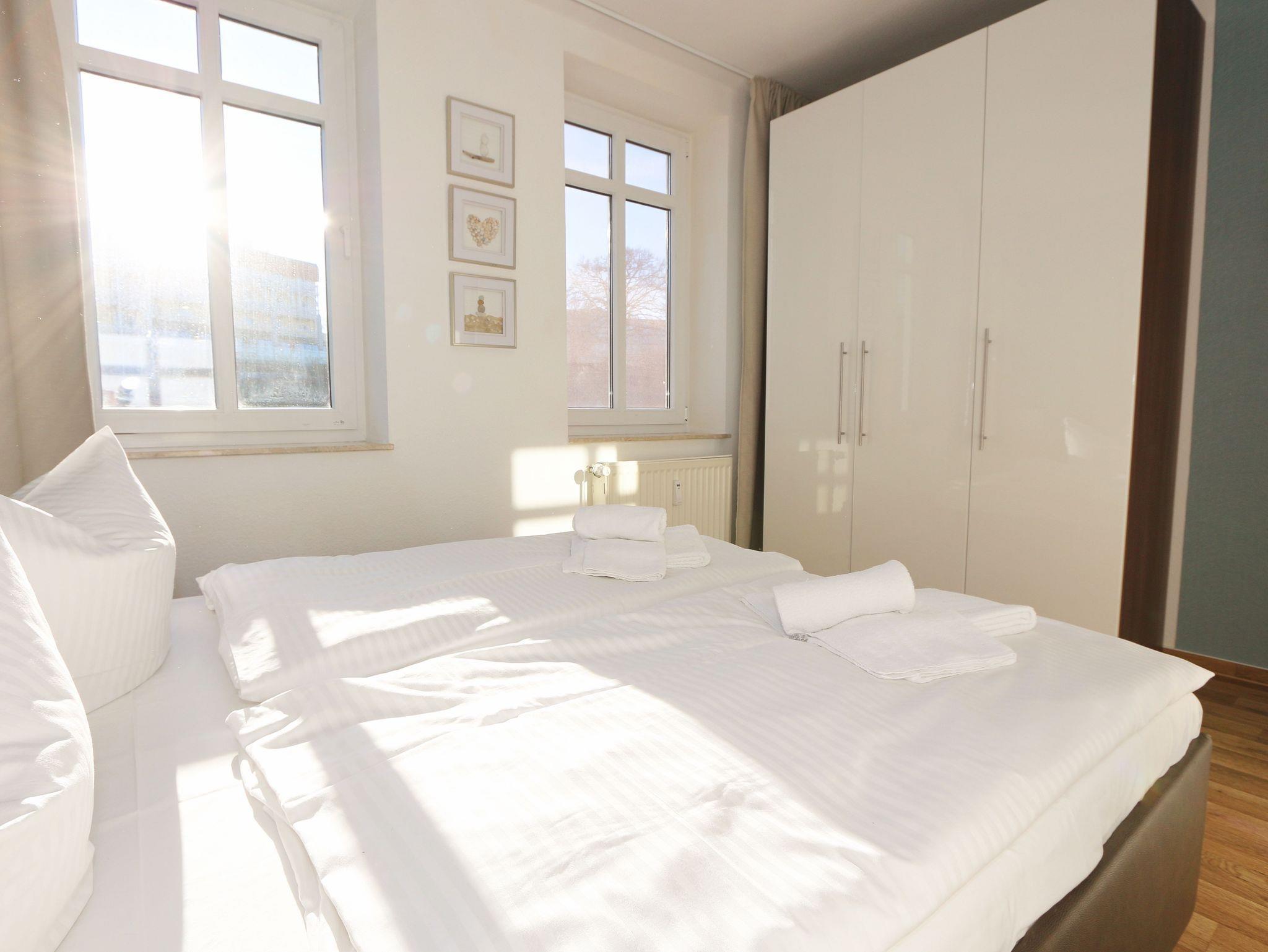 Die Ferienwohnung 09 des Hauses Strandmuschel ist eine komfortable Nichtraucherwohnung, welche sich in der 2. Etage befindet. Die 2-Zimmer Wohnung umfasst etwa 40m² und bietet somit ausreichend Platz für bis zu 4 Personen. Sie setzt sich zusammen aus einem Wohnbereich mit Balkon, einem Schlafzimmer und schließlich dem Badezimmer. Der Wohnbereich ist liebevoll und detailreich eingerichtet. Im dem lichtdurchfluteten Raum finden sie, neben einem Sessel sowie einem Couchtisch, ein bequemes Schlafsofa (1,40m x 2,00m), welches als Schlafmöglichkeit für 2 Personen geeignet ist. Ein Flachbild-TV sowie ein DVD-Player ermöglichen es ihnen, nach einem eindrucksvollen Tag einen gemütlichen Filmeabend mit den Liebsten zu verbringen. Auch ein Radio mit CD-Player und verschiedene Lektüren für die Bücherwürmer unter ihnen sind vorzufinden. Auf einen Internetzugang (WLAN) brauchen Sie nicht verzichten. Dieser ist für Sie inklusive. Die Küchenzeile im gleichen Raum ist mit einem Ceranfeld ausgestattet. Sie enthält, neben einem Backofen und einem Kühlschrank mit Eisfach, einen Geschirrspüler, eine Mikrowelle, einen Wasserkocher, einen Toaster, eine Kaffeemaschine und diverse Kochutensilien. Komplettiert wird der Wohnbereich durch einen Esstisch mit vier Stühlen sowie dem Zugang zum Balkon (Süd/Ost). Dieser umfasst knapp 7 m². Auch hier finden sie einen Tisch mit vier Stühlen sowie einen Sonnenschirm. Der Balkon (Süd/Ost) ist seitlich zum Meer ausgerichtet und tragen die Bäume zum Ende des Jahres keine Blätter mehr, so haben sie zumindest einen wunderbaren Blick auf das Meer. Das Schlafzimmer ist mit einem Doppelbett (1,60m x 2,00m), verstellbare Lattenroste und einem geräumigen Kleiderschrank ausgestattet. Auch ein kleiner Spiegel mit einer Ablage ist vorzufinden. Wie auch der Wohnbereich, ist das Schlafzimmer angenehm hell. Bei Bedarf können sie jedoch einfach die Vorhänge zuziehen und dunkeln den Raum somit komplett ab. Sollten sie feststellen, dass ihre Kleidung im Koffer zerknittert ist, so finden sie im Schlafzimmer sowohl ein kleines Bügelbrett als auch ein Bügeleisen vor. Abgerundet wird der Raum durch zwei Nachttischablagen mit jeweils einer Lampe sowie dekorativen Akzenten im ganzen Raum. Das Badezimmer setzt sich zusammen aus einer Dusche, einem Waschplatz, einem WC, einem beleuchteten Spiegel sowie einer Ablage. Auch ein Fön steht zur Verfügung. Natürlich ist auch an die kleinen Gäste gedacht, so dass Sie sich an verschiedenen Spielzeugen, Gesellschaftsspielen und Kinderbüchern erfreuen werden. Zusätzlich finden sie im Wohnbereich einen Kinderfahrradhelm. Ein kostenloser und mit einer Schranke gesicherter Stellplatz für Ihren PKW befindet sich direkt am Haus. Haustiere sind nicht erlaubt. Die Erstausstattung eines Wäschepaketes (komplette Bettwäsche, 1 Duschhandtuch, 2 kleine Handtücher, 2 Geschirrhandtücher) können Sie bis 14 Tage vor Anreise gegen einen Aufpreis dazu buchen oder durch eigene ergänzen.