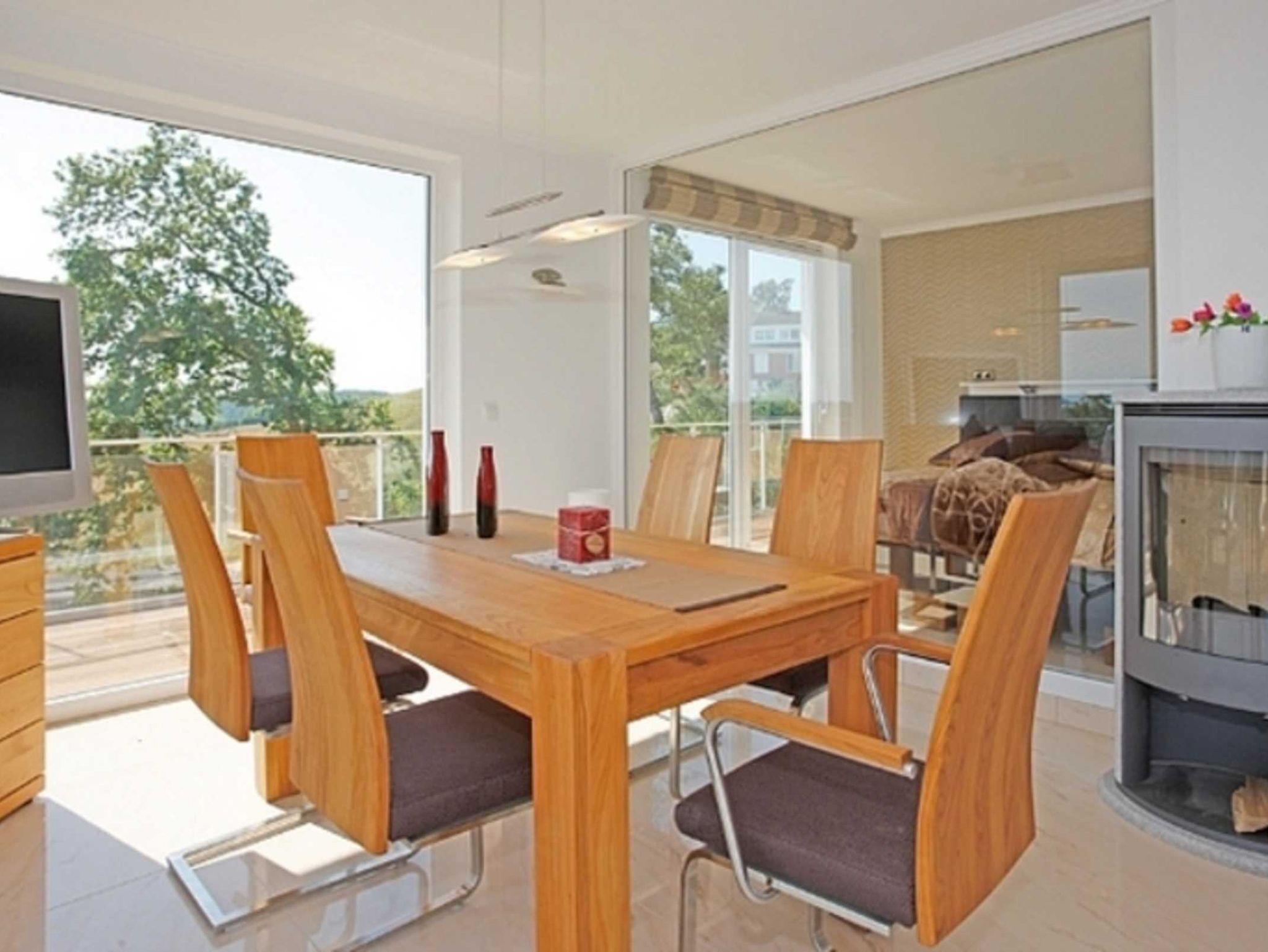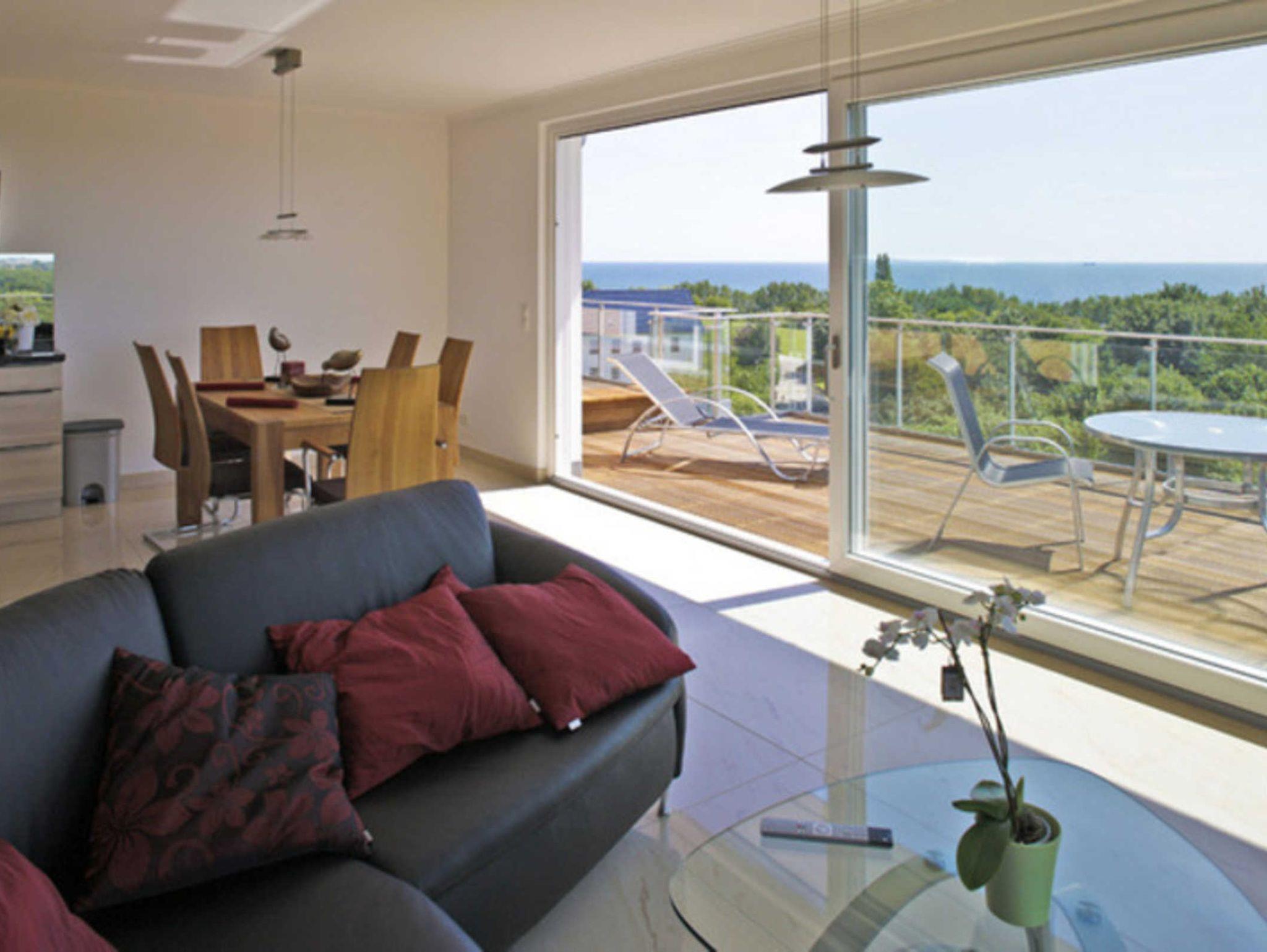Der Wohnraum von 30 m² ist großzügig eingerichtet und mit Rosa Portogallo Marmor-Feinstein ausgelegt. Große Schiebetüren öffnen die Fensterfronten zum 42 m² großen umlaufenden Balkon, nach Süden mit Blick auf die Ostsee und nach Westen mit Blick auf den Bodden und die Zickerschen Berge.