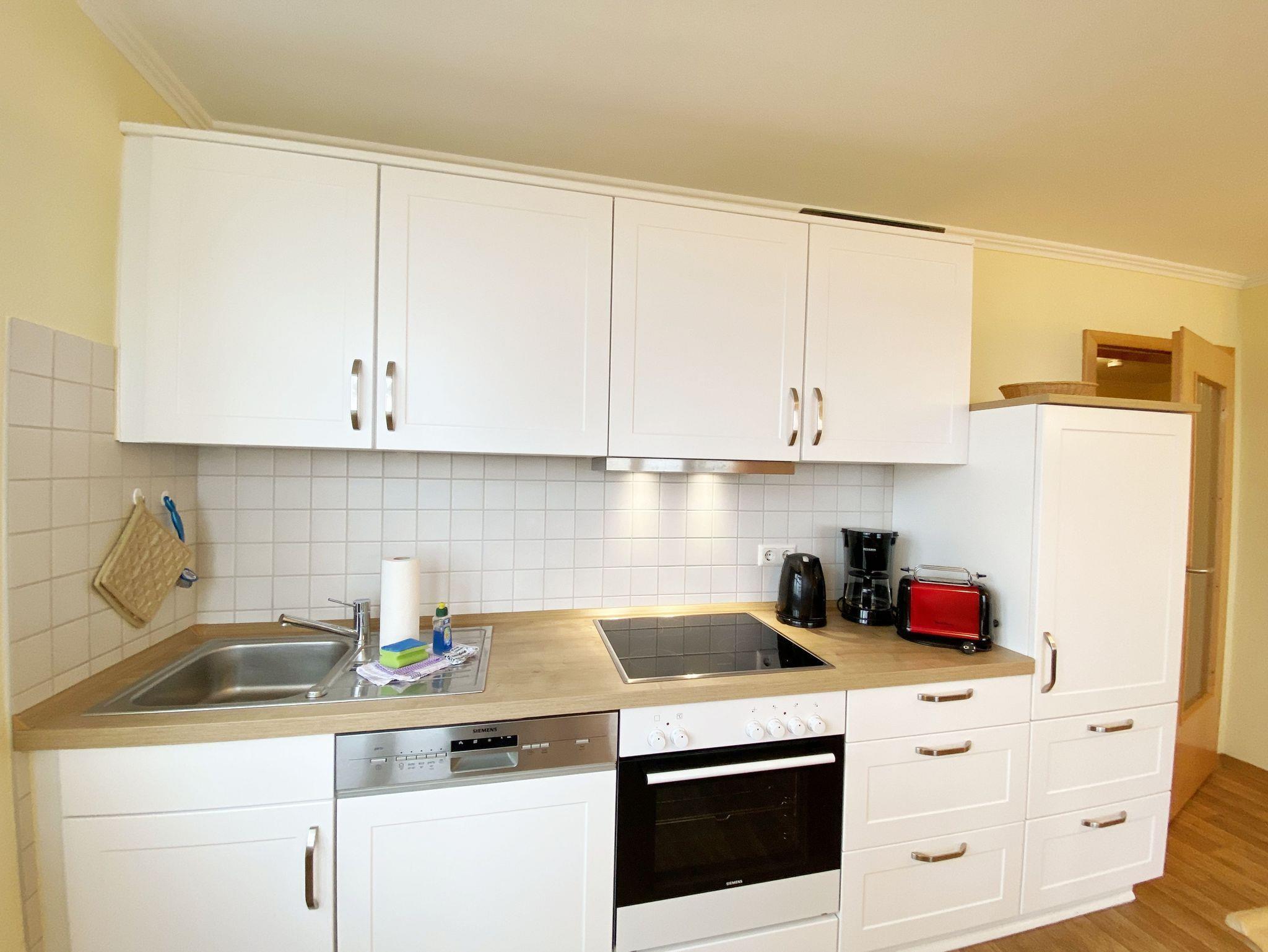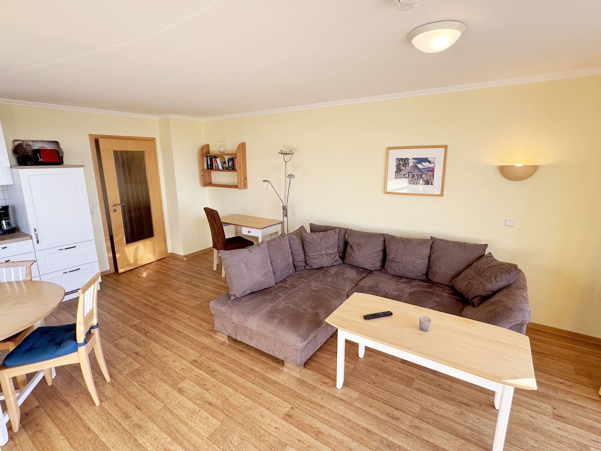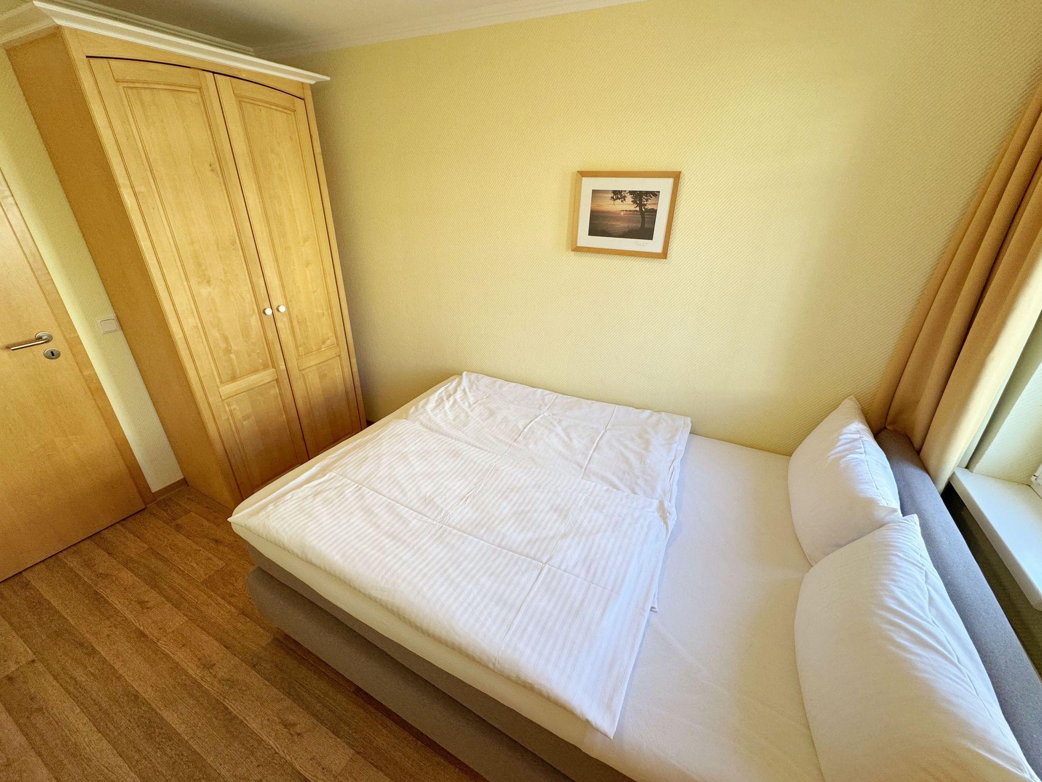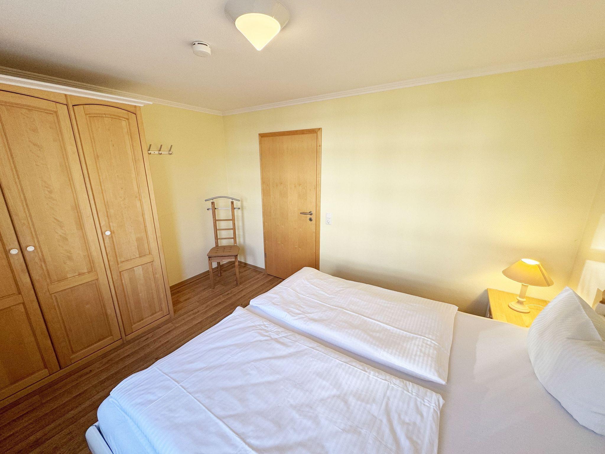 Unsere komfortable Nichtraucherwohnung von ca. 60 m² befindet sich in der 1. Etage und ist für max. 4 Erwachsene und 1 Kleinkind bis 3 Jahre im Kinderreisebett ausgelegt. Der Wohnbereich mit integrierter Küchenzeile und Essplatz ist großzügig ausgestattet. Die Küchenzeile verfügt unter anderem über einen Backofen, 4-Zonencerankochfeld, Kühlschrank mit Eisfach, Geschirrspüler, Kaffeemaschine, Wasserkocher, Toaster sowie diverse Küchenutensilien, die Ihnen beim Kochen keine Wünsche offen lassen. Der Essplatz besteht aus einem runden Holzesstisch mit 4 Stühlen. Ein Sideboard mit Flachbild-TV, DVD-Player, Ministereoanlage, Leselampe, Couch mit Couchtisch und einem Sessel runden den Wohnbereich ab. Das große Schlafzimmer verfügt über ein Doppelbett (2 x 0,90 m x 2,00 m) mit Nachttischkonsolen und Kleiderschrank. Das kleine Schlafzimmer ist ausgestattet mit einem französischem Bett, Nachttischablage sowie einem Kleiderschrank. Im Wohnbereich sowie im Schlafbereich befinden sich Insektenschutzgitter. Genießen Sie von Ihrem bestuhlten Balkon mit Ausrichtung (Süd/Südwest) den einmaligen Blick auf die Ostsee. Das Bad ist mit einem Waschtisch, Dusche, WC, Urinal, Kosmetikspiegel und Fön eingerichtet. Ein Fenster im Badbereich spendet Ihnen Tageslicht. Ein eigener PKW-Stellplatz Nr. 06 sowie eine Fahrradabstellmöglichkeit sind für Sie vorhanden. Ein WLAN-Zugang steht Ihnen inklusive zur Verfügung. Ein Kinderreisebett (ohne Matratze und Bett Inlett) und ein Hochstuhl können auf Anfrage gegen eine Gebühr für unsere kleinen Gäste gestellt werden. Waschmaschine und Trockner kann in einem separaten Raum genutzt werden. Die Erstausstattung eines Wäschepaketes (komplette Bettwäsche, 1 Duschhandtuch, 2 kleine Handtücher) können Sie bis 14 Tage vor Anreise gegen einen Aufpreis dazu buchen oder durch eigene ergänzen. Ab 2 gebuchten Paketen erhalten Sie einmalig 1 Geschirrhandtuch und 1 Duschvorleger dazu.