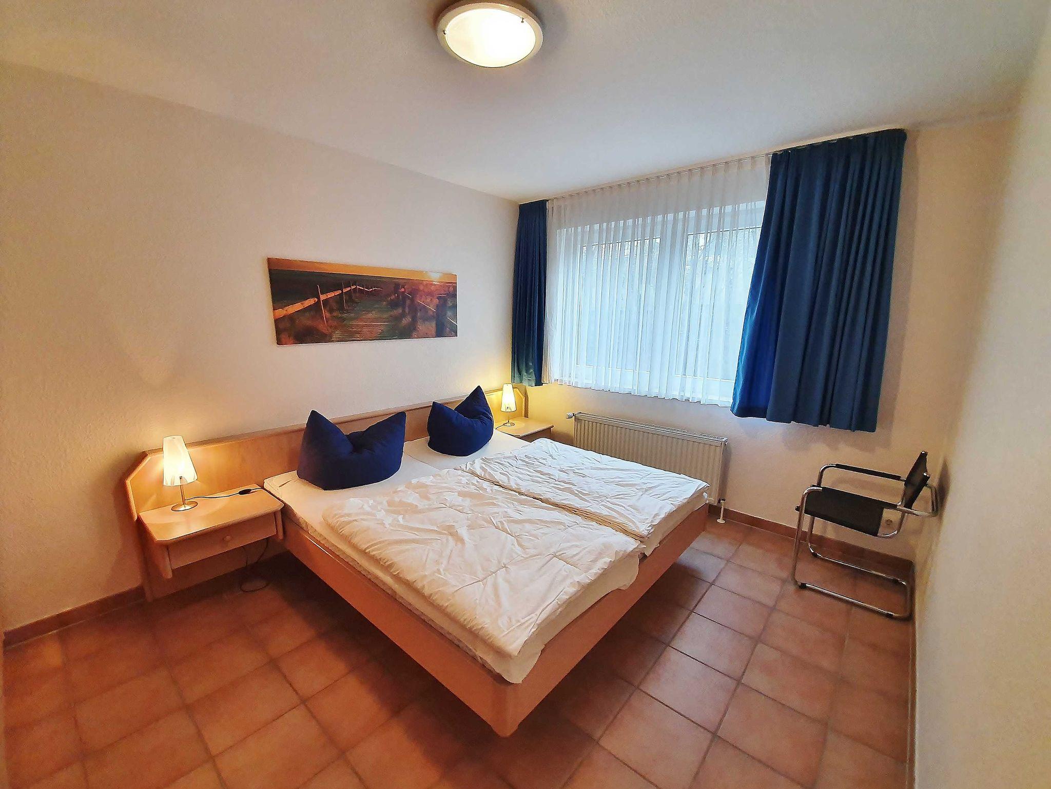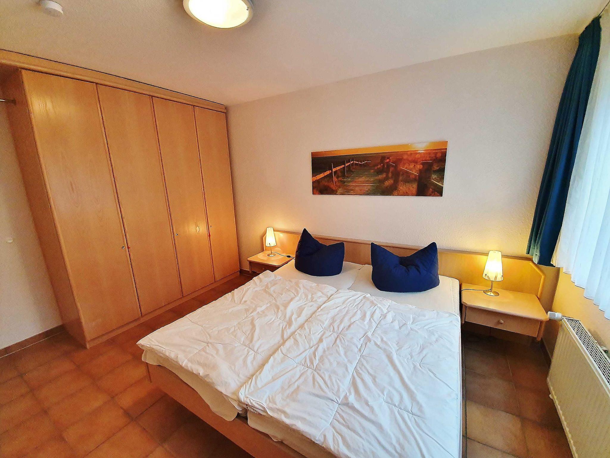 * 1. Schlafzimmer mit Doppelbett, Nachttischkonsolen und großem Kleiderschrank