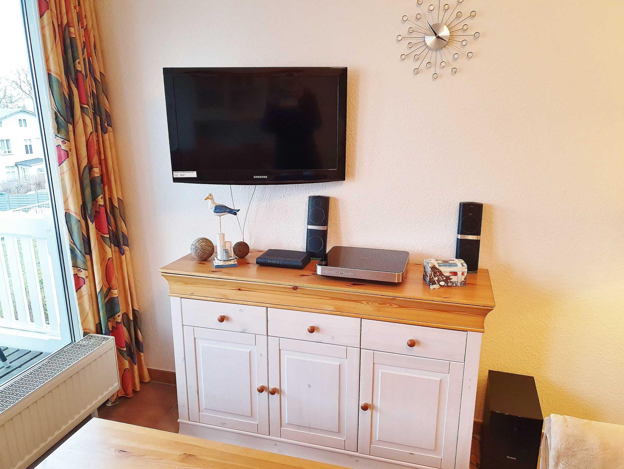 * Wohnbereich mit Couch, Couchtisch,TV sowie eine Home-Cinema-Anlage (CD+DVD)
