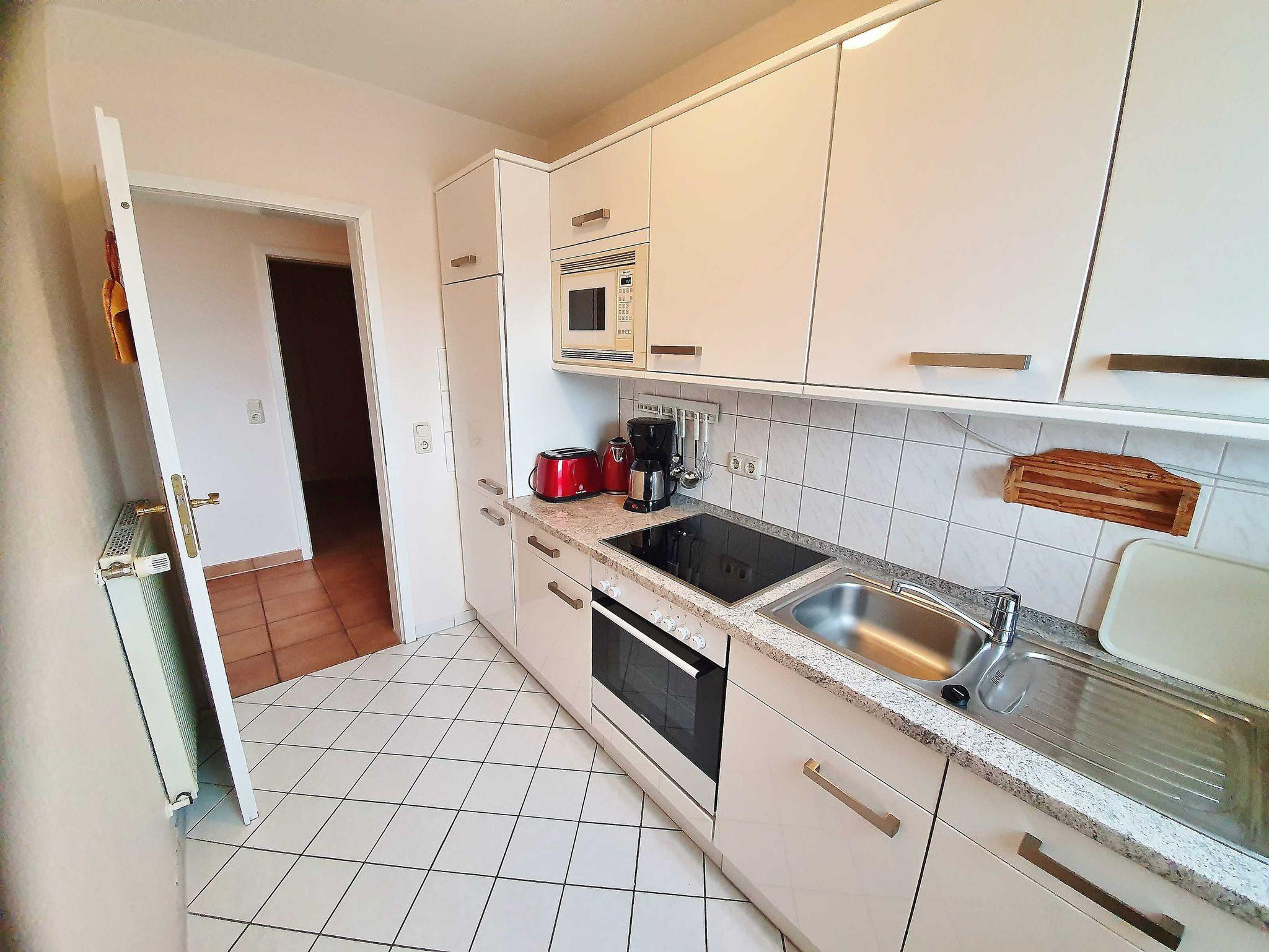 * moderne Küchenzeile mit 4-Zonenceranfeld, Backofen, Mikrowelle, Geschirrspüler, Kühlschrank mit Gefrierfach und diversen Küchenutensilien