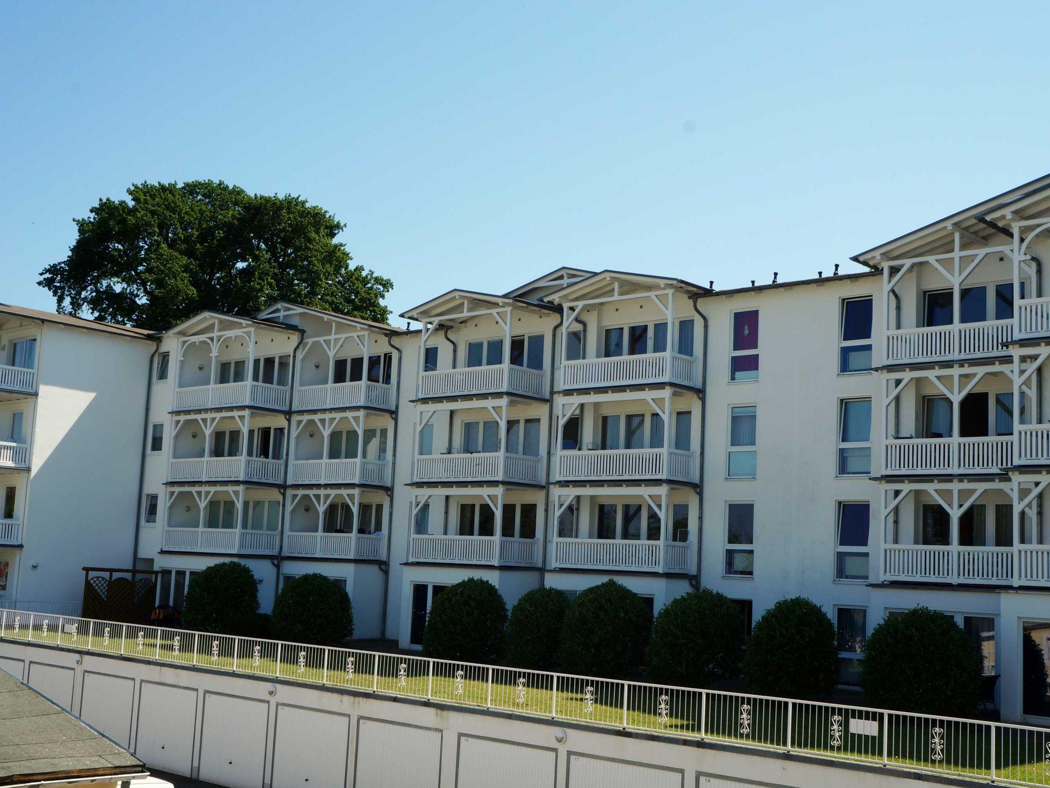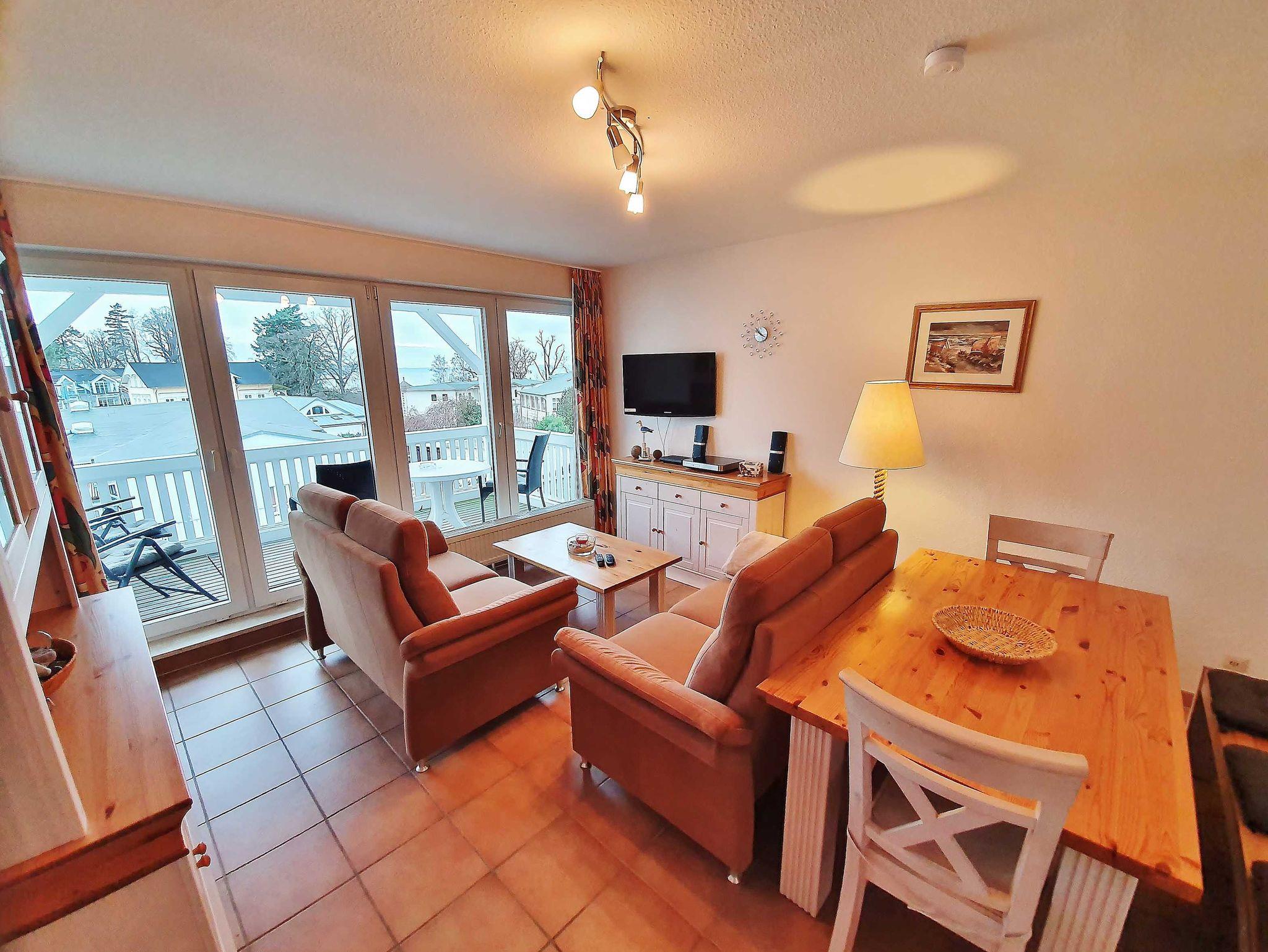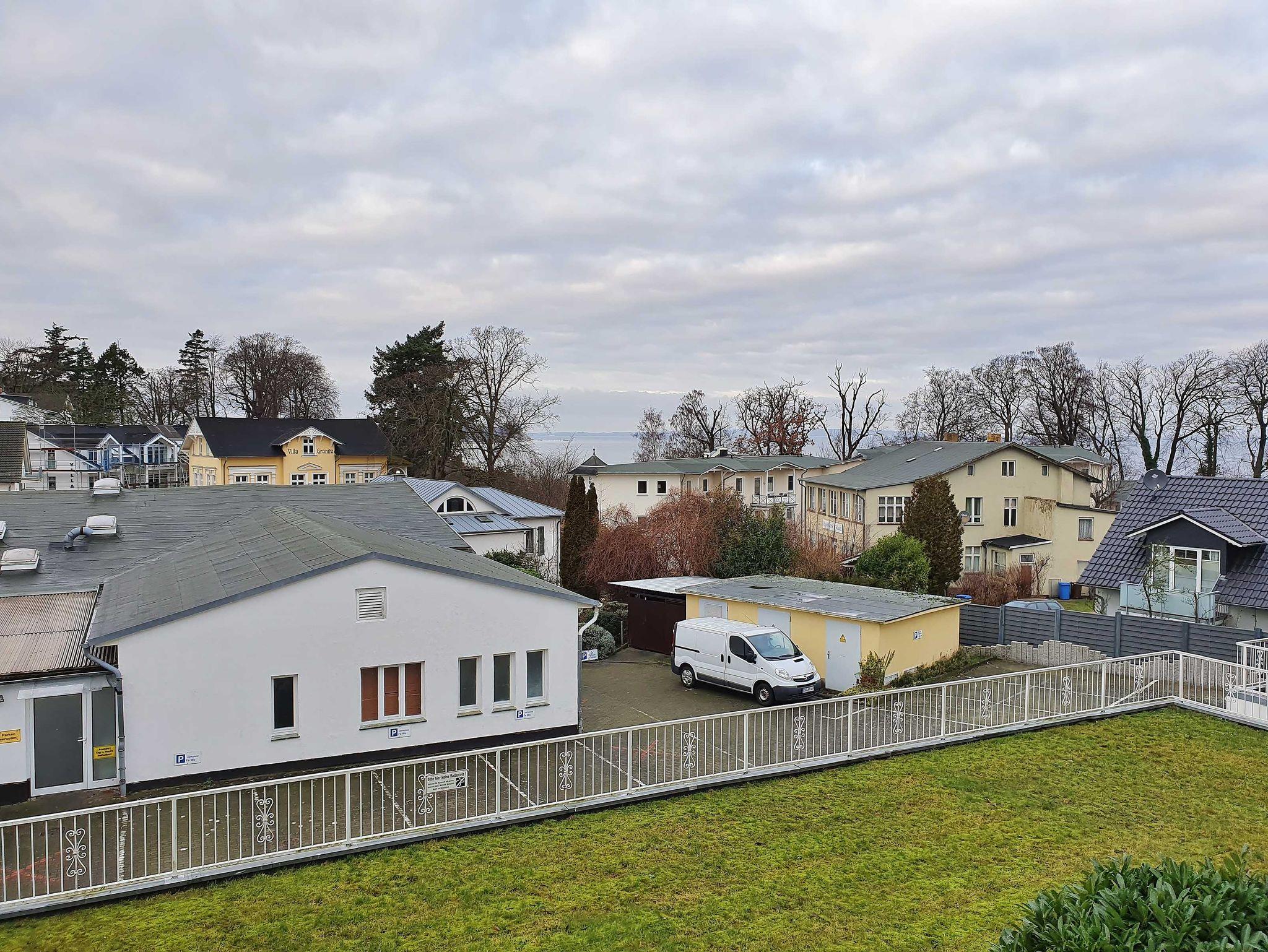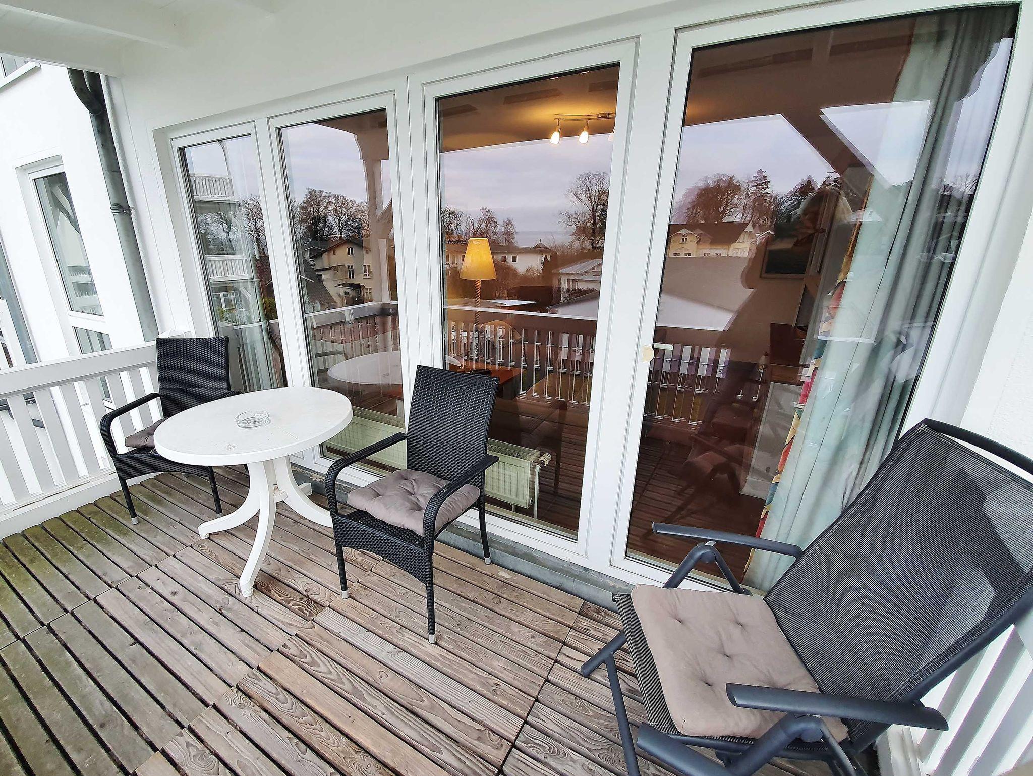 Die große Fensterfront im Wohnbereich erhellt die Wohnung mit Tageslicht und ermöglicht den Zugang zum Balkon. Von hier aus können Sie durch die Baumkronen den Blick auf die Ostsee geniessen.