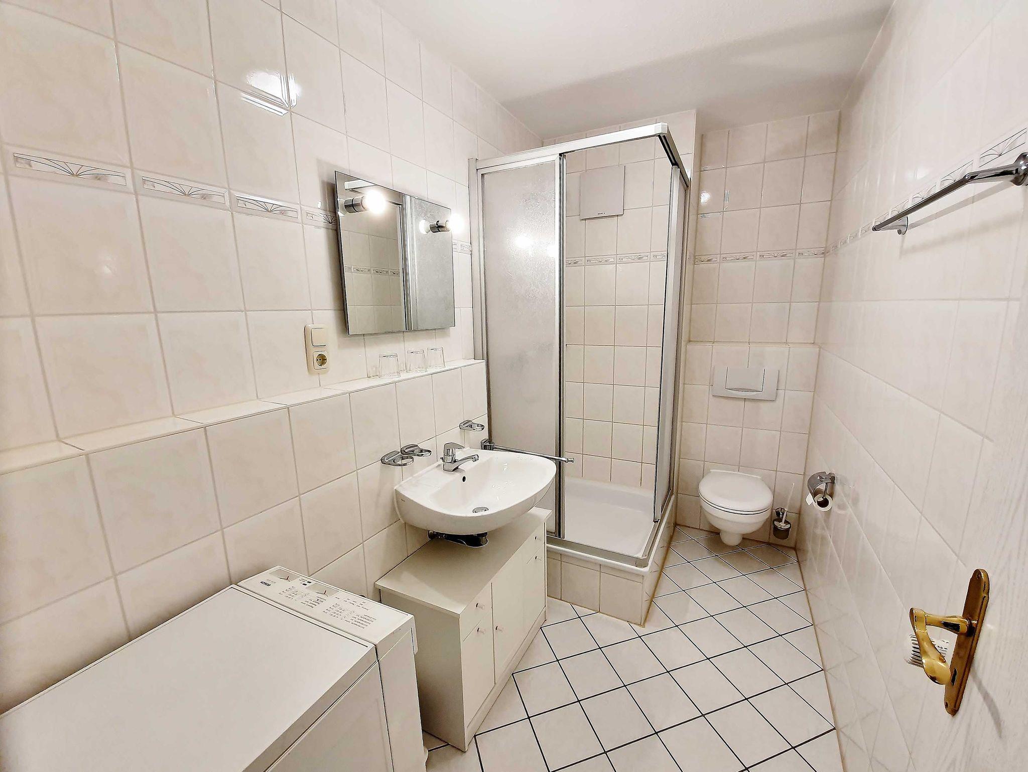 * Badezimmer mit Dusche, Waschbecken, WC und Waschmaschine
