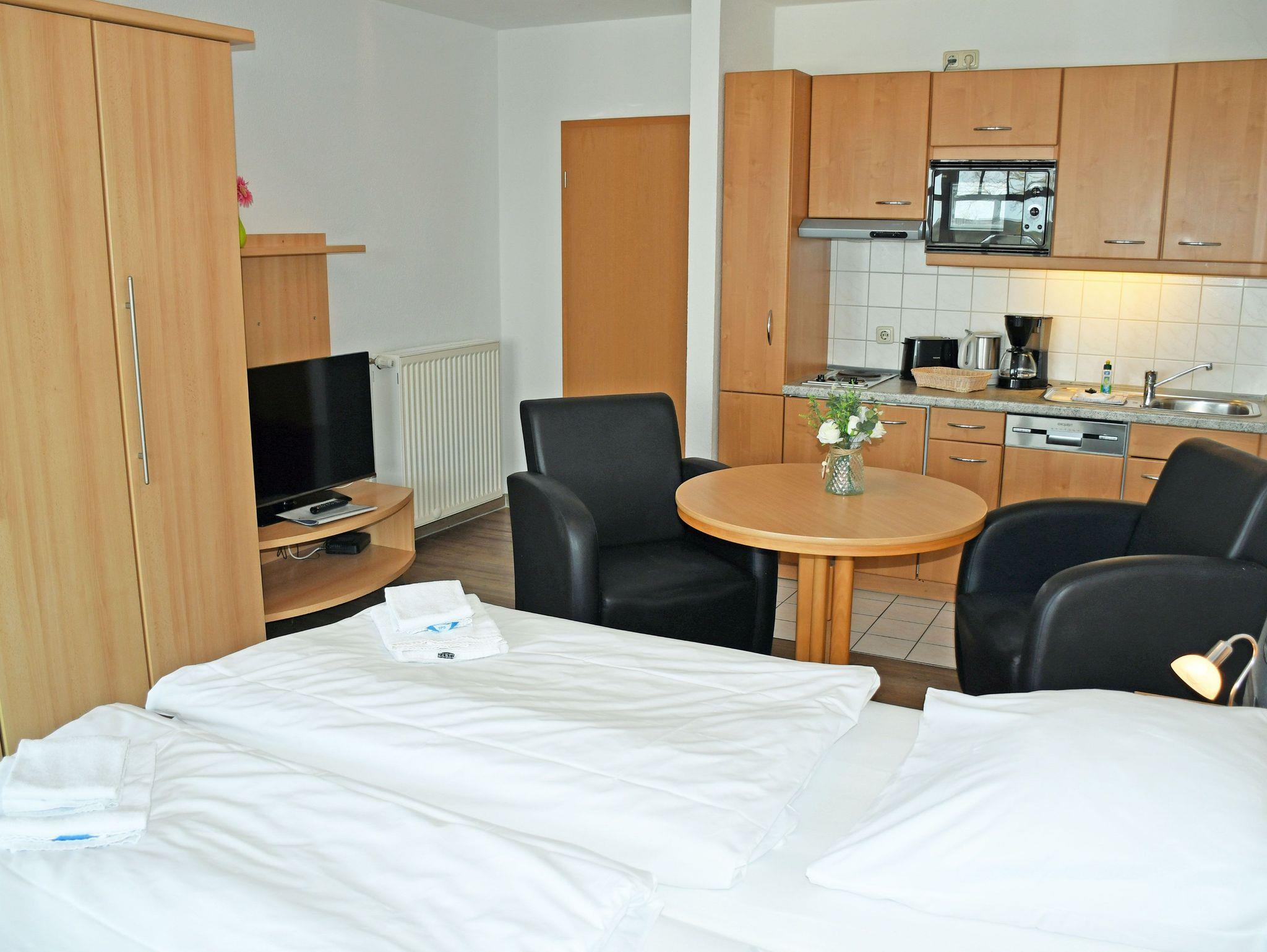 Unsere ruhig gelegenen, hellen und lichtdurchfluteten 1-Raum-Ferienwohnungen mit Balkon oder Terrasse sind wie folgt ausgestattet: