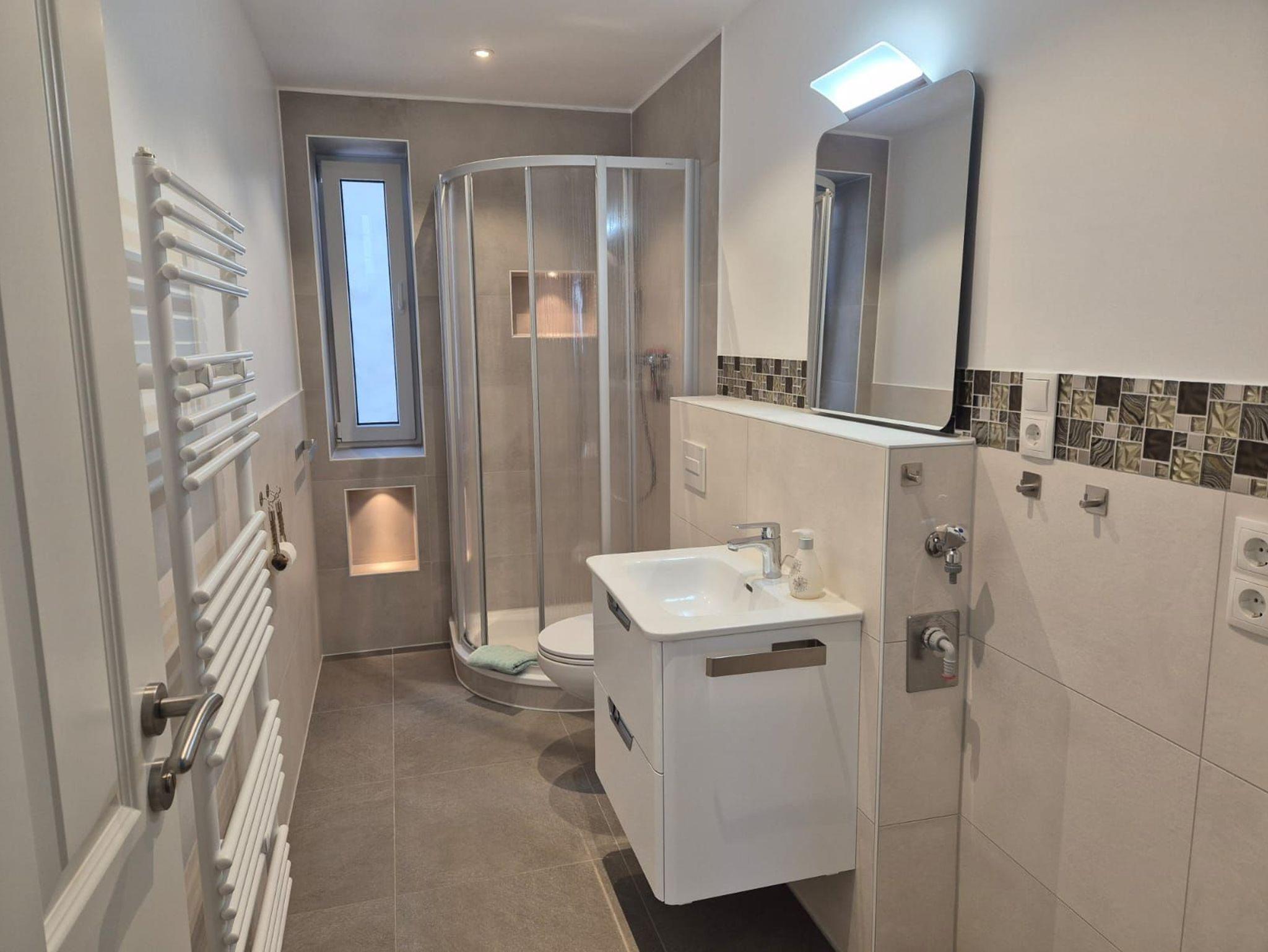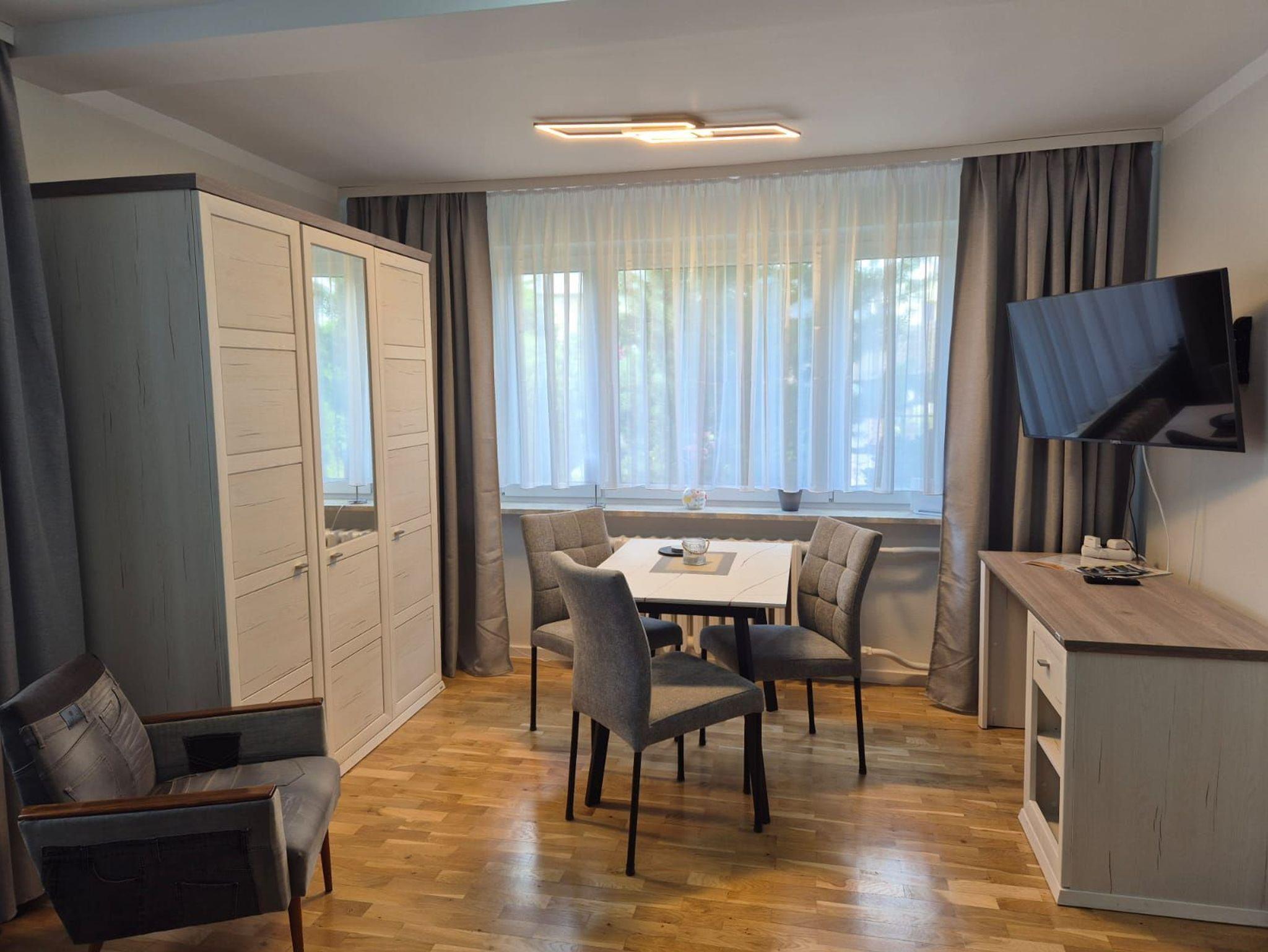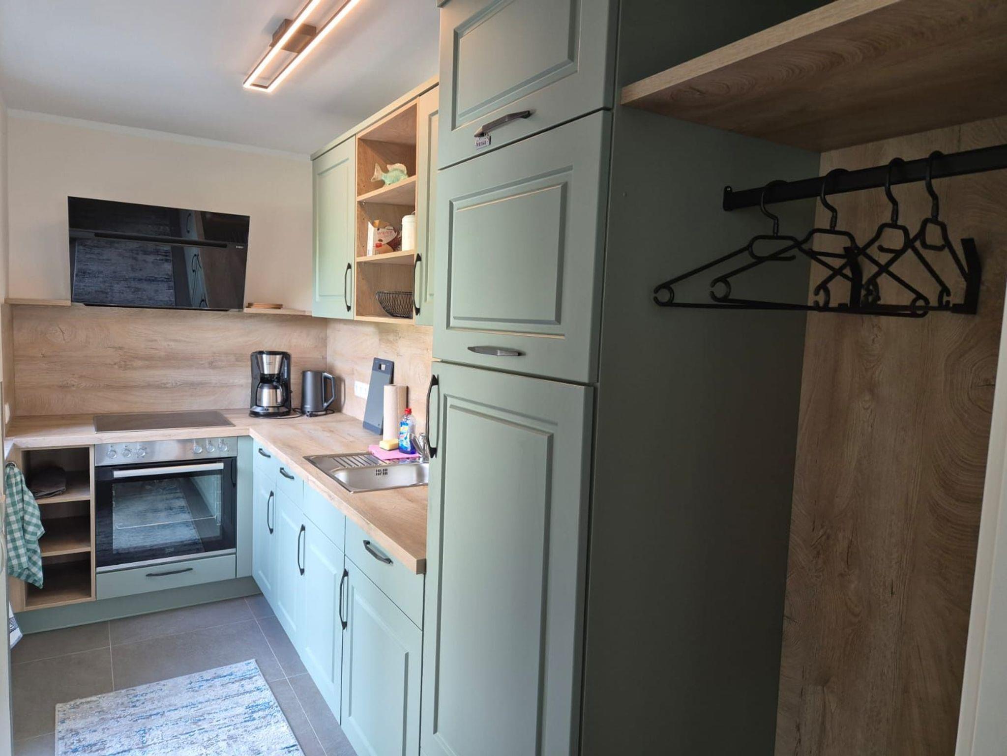 Gemütliche 1-Raum-Fewo als Einliegerwohnung. Im Wohn-/Schlafzimmer befindet sich ein Boxspringbett, Sitzecke und TV, kleine Küche - komplett eingerichtet mit Kopchplatte, Backofen, Abzugshaube, Geschirr etc., geräumiges Badezimmer mit Dusche/WC. Die Wohnung befindet sich im EG und verfügt über eine Terrasse mit Bestuhlung, Liegen und einem Sonnenschirm.