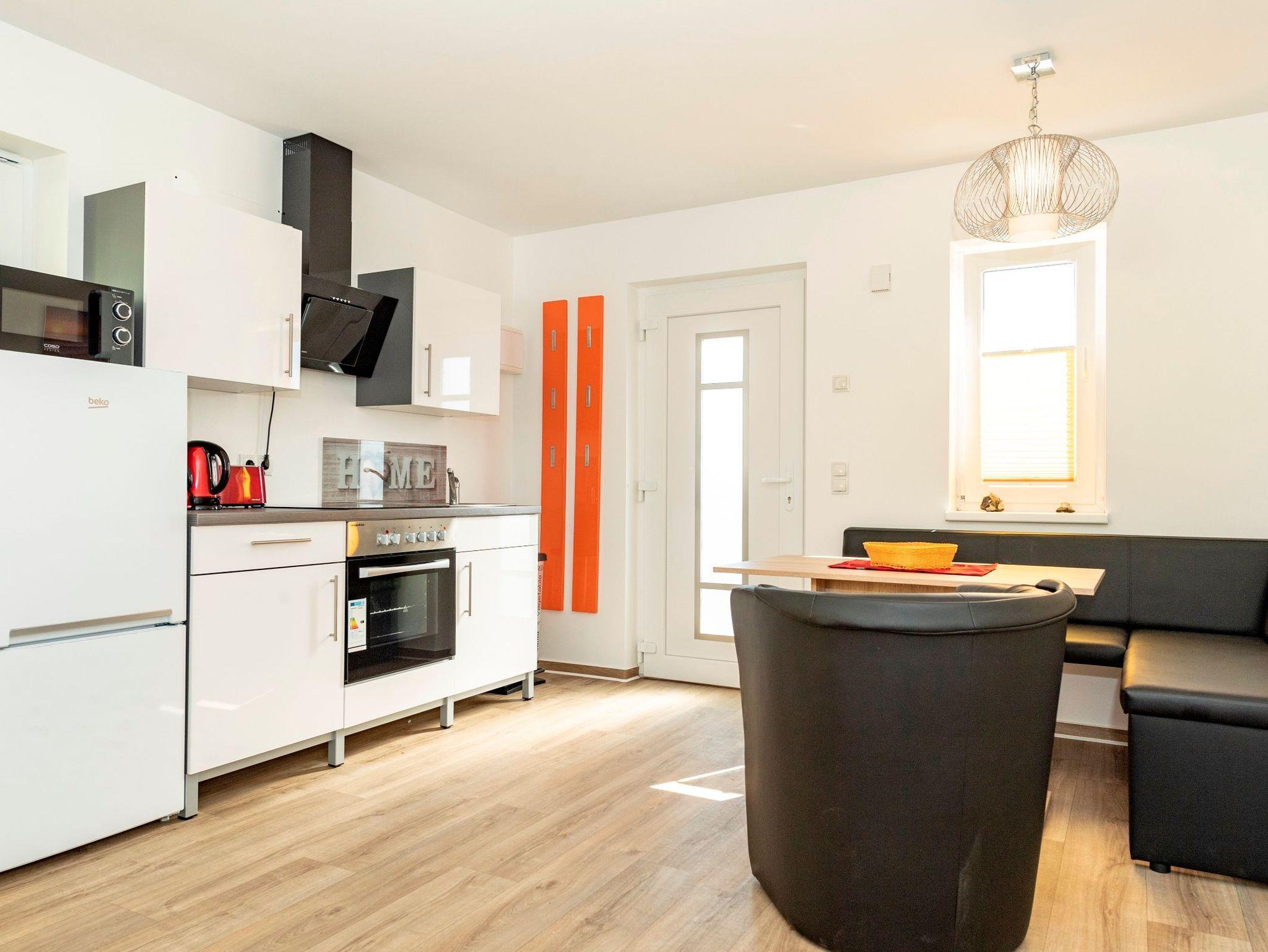 * integrierter Küchenzeile ausgestattet mit: 4-Platten-Ceran-Kochfeld, Backofen Dunstabzugshaube, kleiner Kühlschrank mit Gefrierfach, Spüle, Toaster, Kaffeemaschine, Wasserkocher, diverse Küchenutensilien