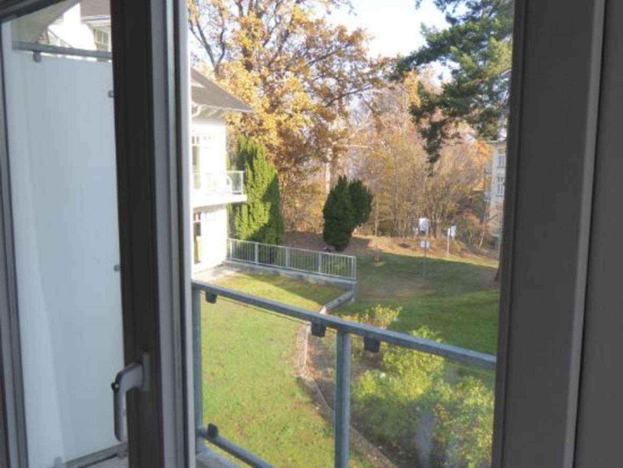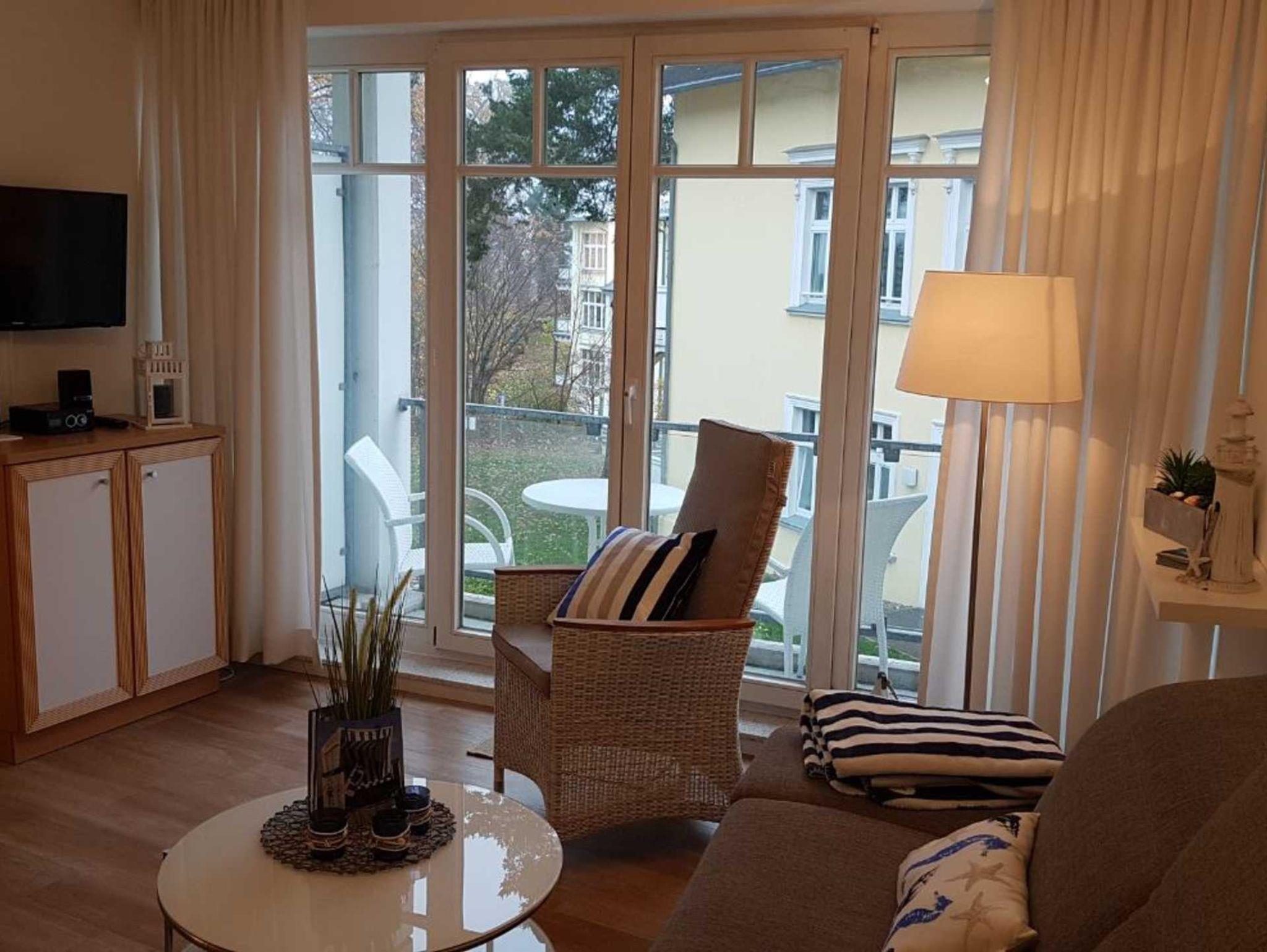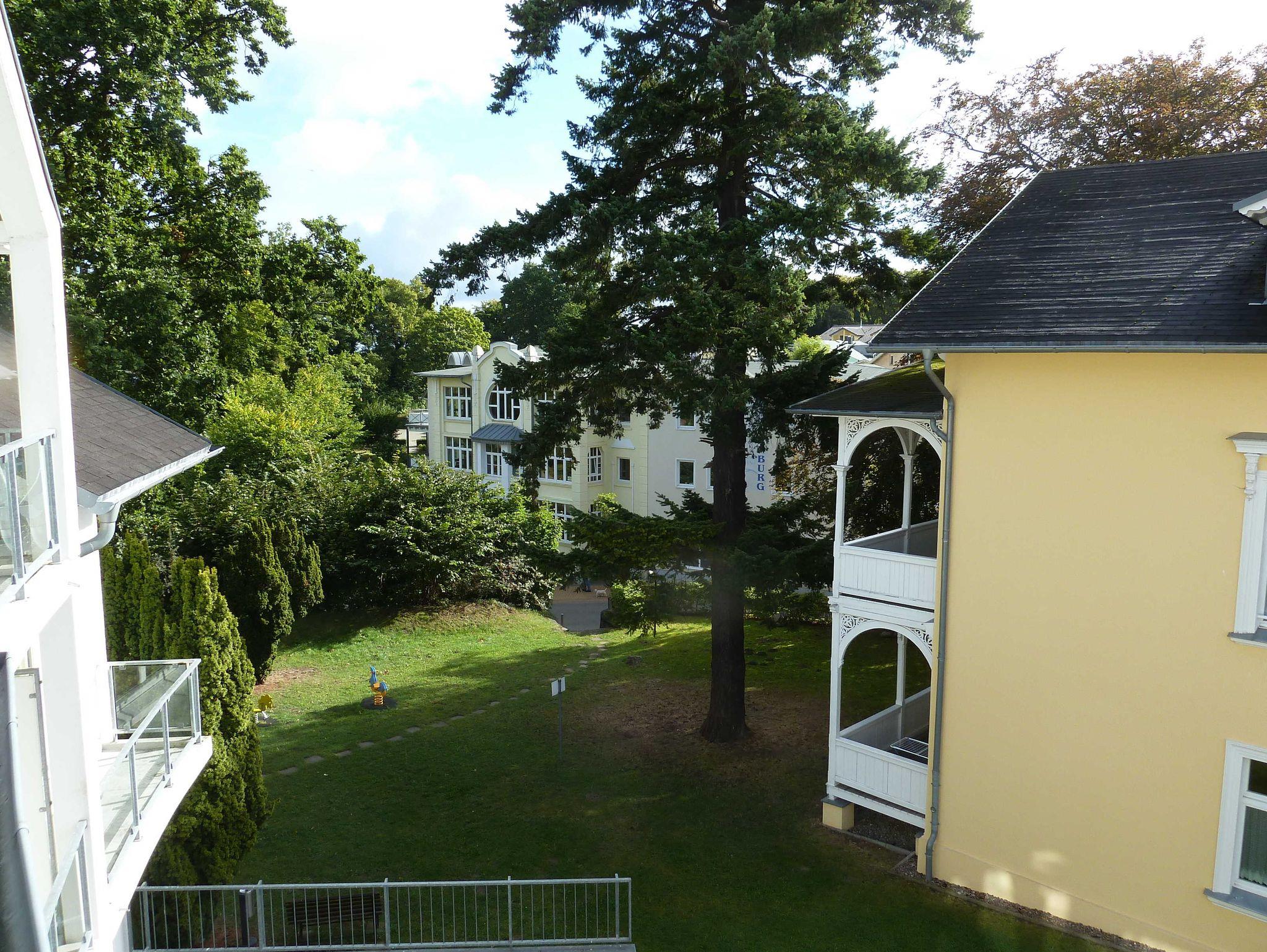 Der vor dem Wohnraum liegende Ost-Balkon ermöglicht einen traumhaften Blick in den ehemaligen Park der Villa Granitz und zur Ostsee. Der Meerblick ist im Sommer durch die Bäume an der Promenade eingeschränkt.