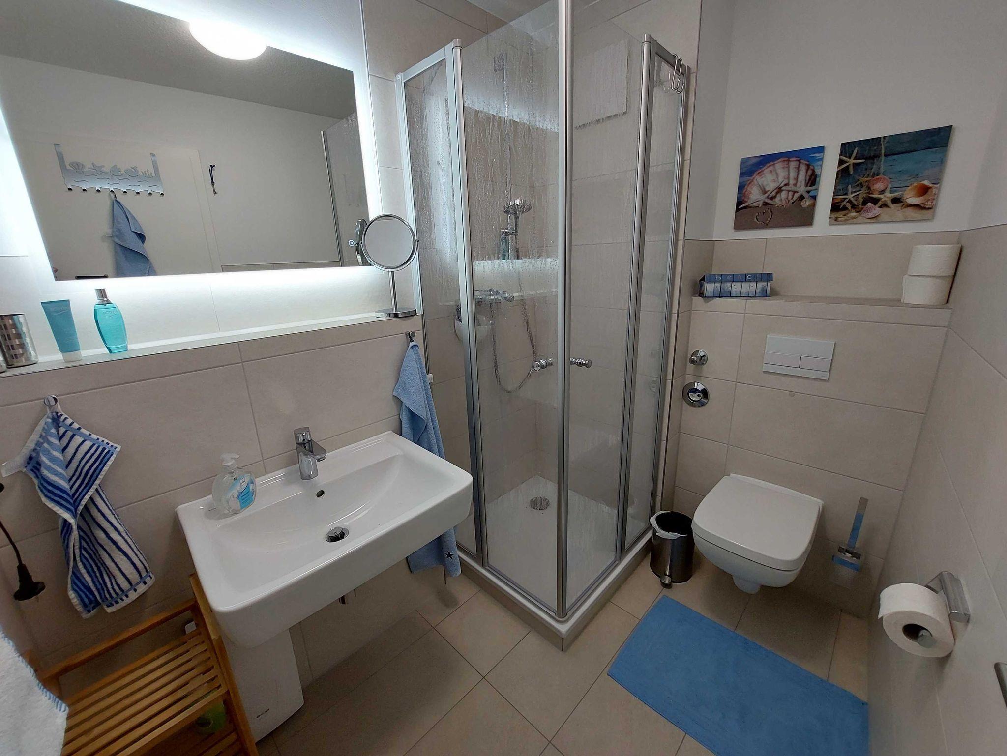 Das hell geflieste Bad ist zweckmäßig mit Dusche und WC, Waschbecken und Ablagen ausgestattet. Es wurde im Jahr 2022 renoviert.