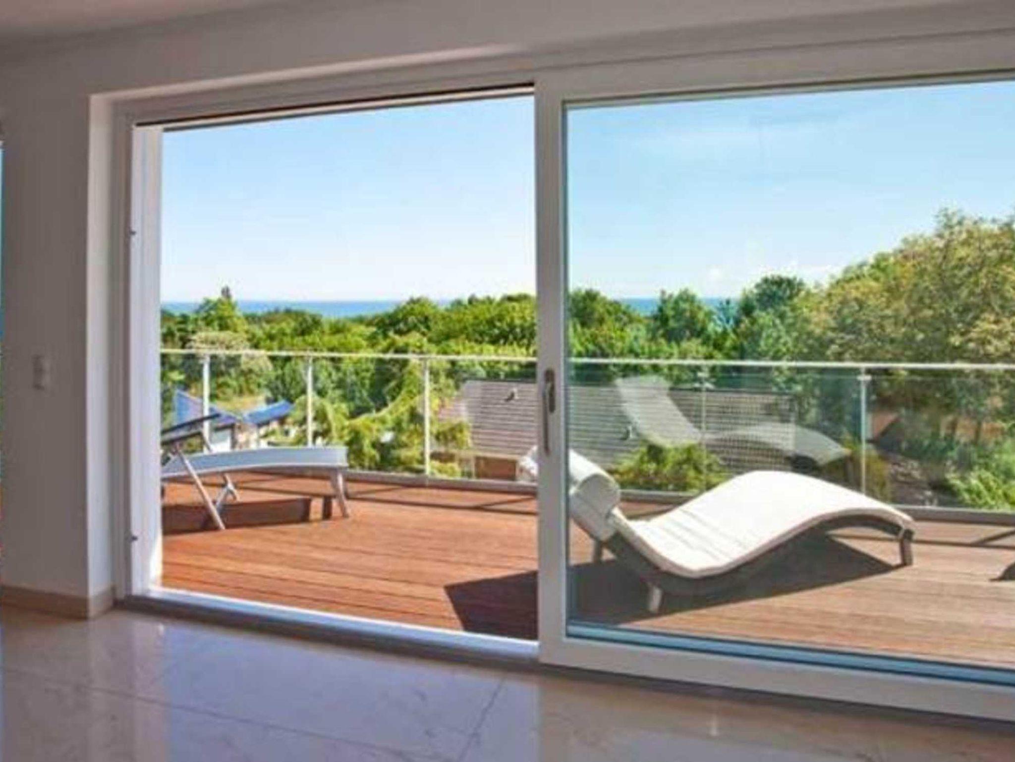 Eine Sitzgruppe in weißem Leder ist mit Blick auf die Ostsee ausgerichtet.