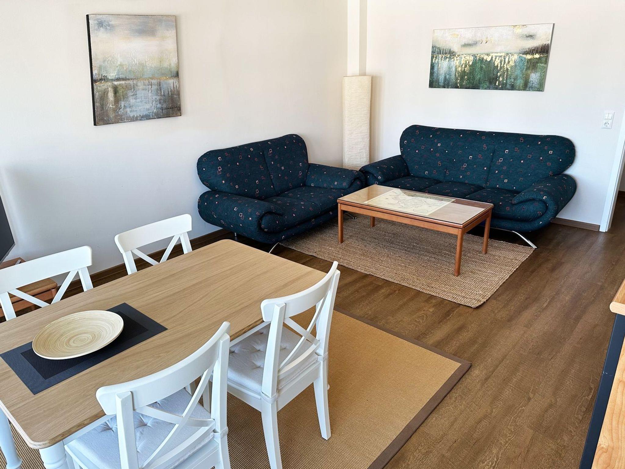 Wohnzimmer mit 2 Couchen, Essbereich und TV, komplett eingerichtete separate Küche (Ceranfeld, Backofen, Geschirrspüler, Kaffeemaschine, etc.), ein Schlafzimmer mit Doppelbett und ein Schlafzimmer mit zwei Einzelbetten, sowie ein Badezimmer mit Dusche und WC.