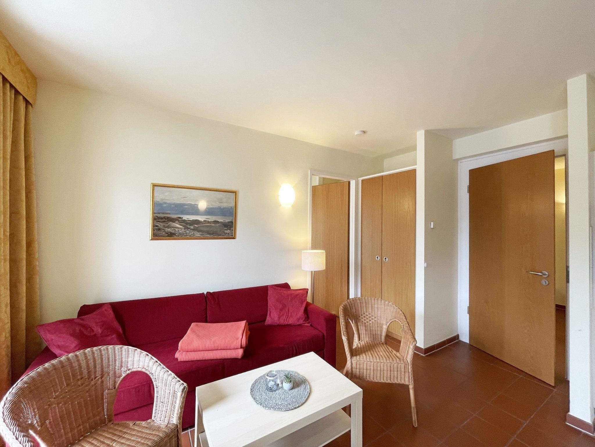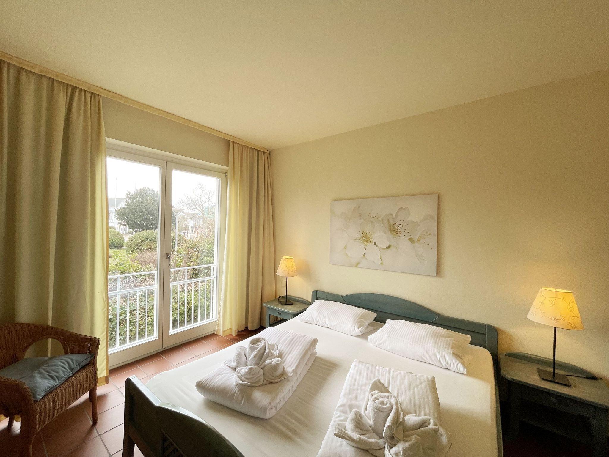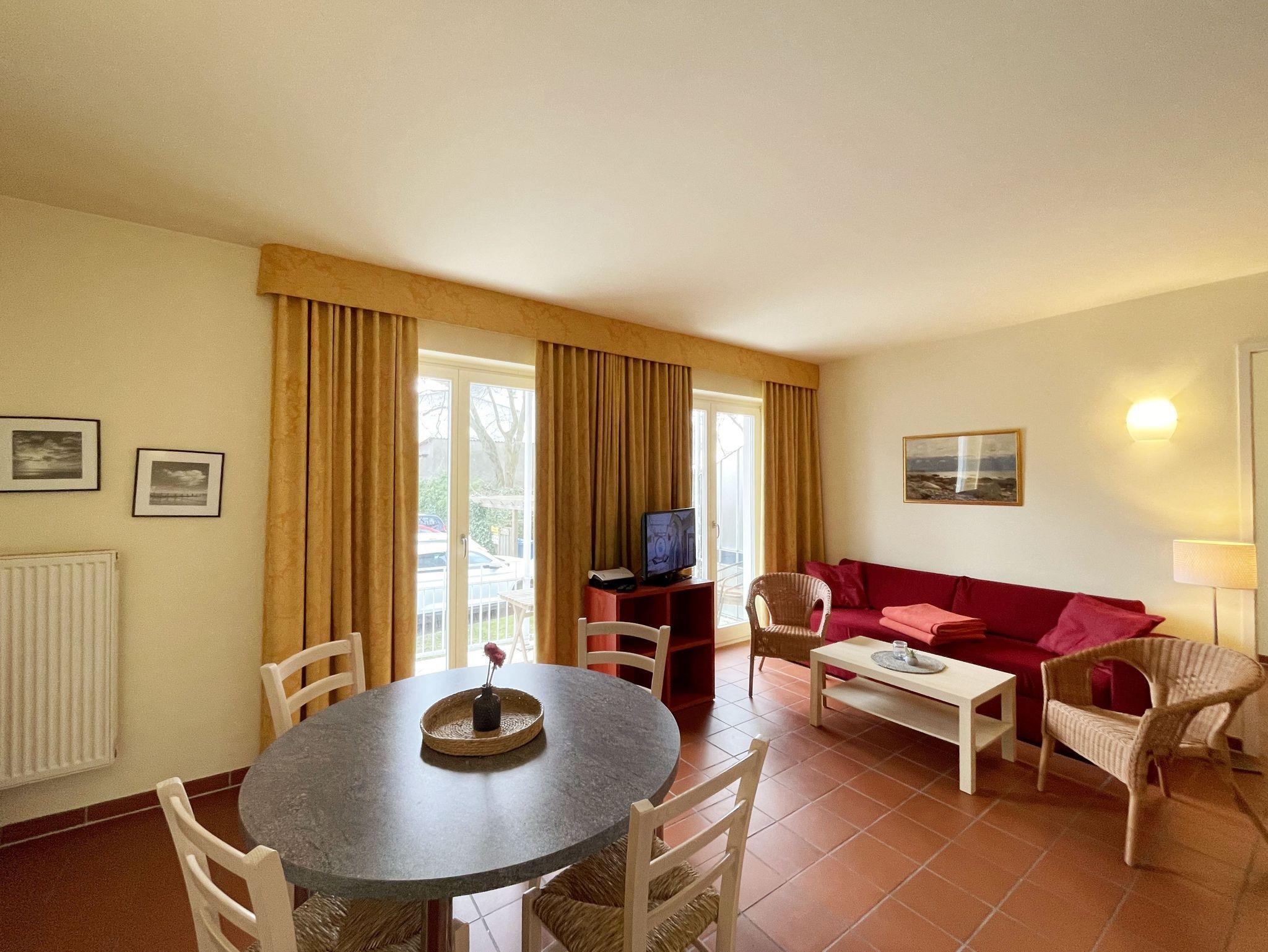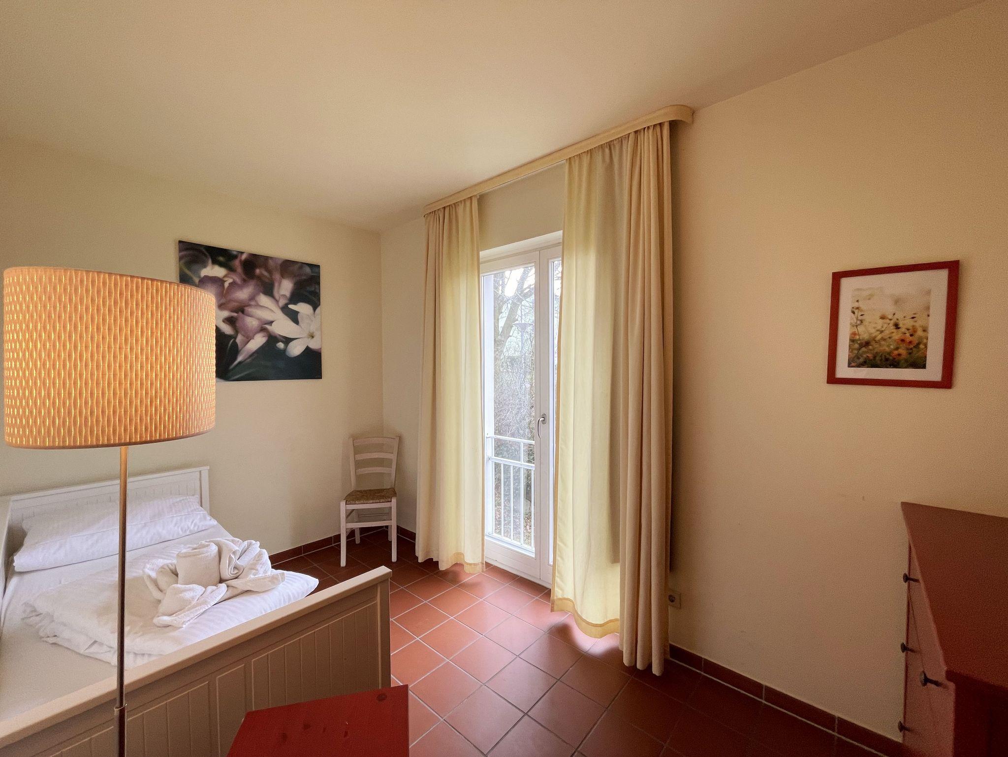 Die geräumige, nach Südwesten ausgerichtete 3-Zimmerwohnung ist etwa 55 qm groß und befindet sich im Hochparterre. Von vorne ist sie über die Freitreppe erreichbar, von der Hofseite aus sind es nur wenige Stufen. Das Appartement ist für 2 bis 6 Personen geeignet. Im Wohnbereich finden Sie eine komfortable Schlafcouch (1,60m x 2,00m), einen LED-Fernseher, einen Essplatz für 6 Personen sowie die Küchenzeile. Sie ist mit Cerankochfeld, Spülmaschine, Backofen, Kaffeemaschine, Wasserkocher, Toaster, Kühlschrank mit Eisfach und allen wichtigen Küchenutensilien ausgestattet. An den Wohnbereich grenzt der bestuhlte Südbalkon. Das gemütliche Schlafzimmer verfügt über ein Doppelbett (2 x 0,90 x 2,00 m) mit 7-Zonen-Matratzen, einen Kleiderschrank und eine Kommode mit Spiegel. Im zweiten, kleineren Schlafzimmer finden Sie ein Kojenbett (2 x 0,80 x 2,00 m), ebenso einen Kleiderschrank und eine Kommode mit Spiegel. Das Bad ist mit WC, Waschbecken und Föhn ausgestattet. Die geräumige Dusche ist ebenerdig zu begehen und mit Glaswänden abgetrennt. In der kühleren Jahreszeit wärmt die angenehme Fußbodenheizung in allen Räumen den Terracottaboden. Auch im Urlaub brauchen Sie auf einen WLAN-Zugang nicht verzichten. Dieser ist für Sie inklusive vorhanden. Ein eigener Stellplatz Nr. 11 für Ihr Fahrzeug befindet sich hinter dem Haus. In einem separaten Raum können mitgebrachte oder geliehene Fahrräder abgeschlossen werden. Auch 1 Vierbeiner ist gegen eine Gebühr ein gern gesehener Gast. Die Erstausstattung eines Wäschepaketes (komplette Bettwäsche, 1 Duschhandtuch, 1 kleines Handtuch) können Sie bis 14 Tage vor Anreise dazu buchen oder durch eigene ergänzen. Ab 2 gebuchten Paketen erhalten Sie einmalig 1 Geschirrhandtuch und 1 Duschvorleger hinzu.