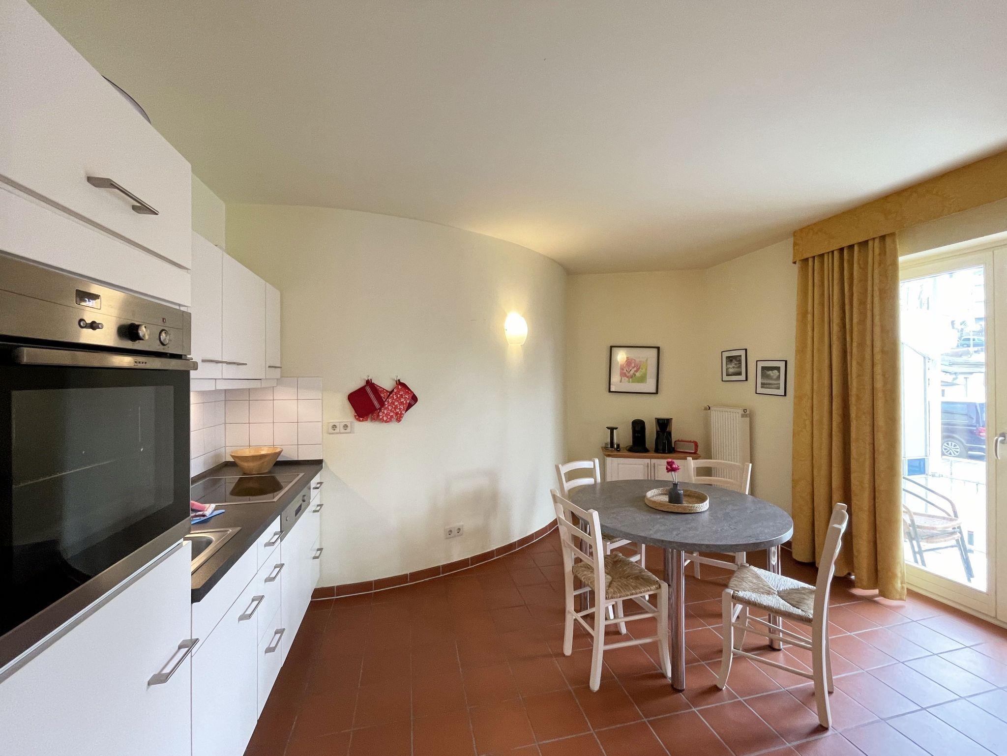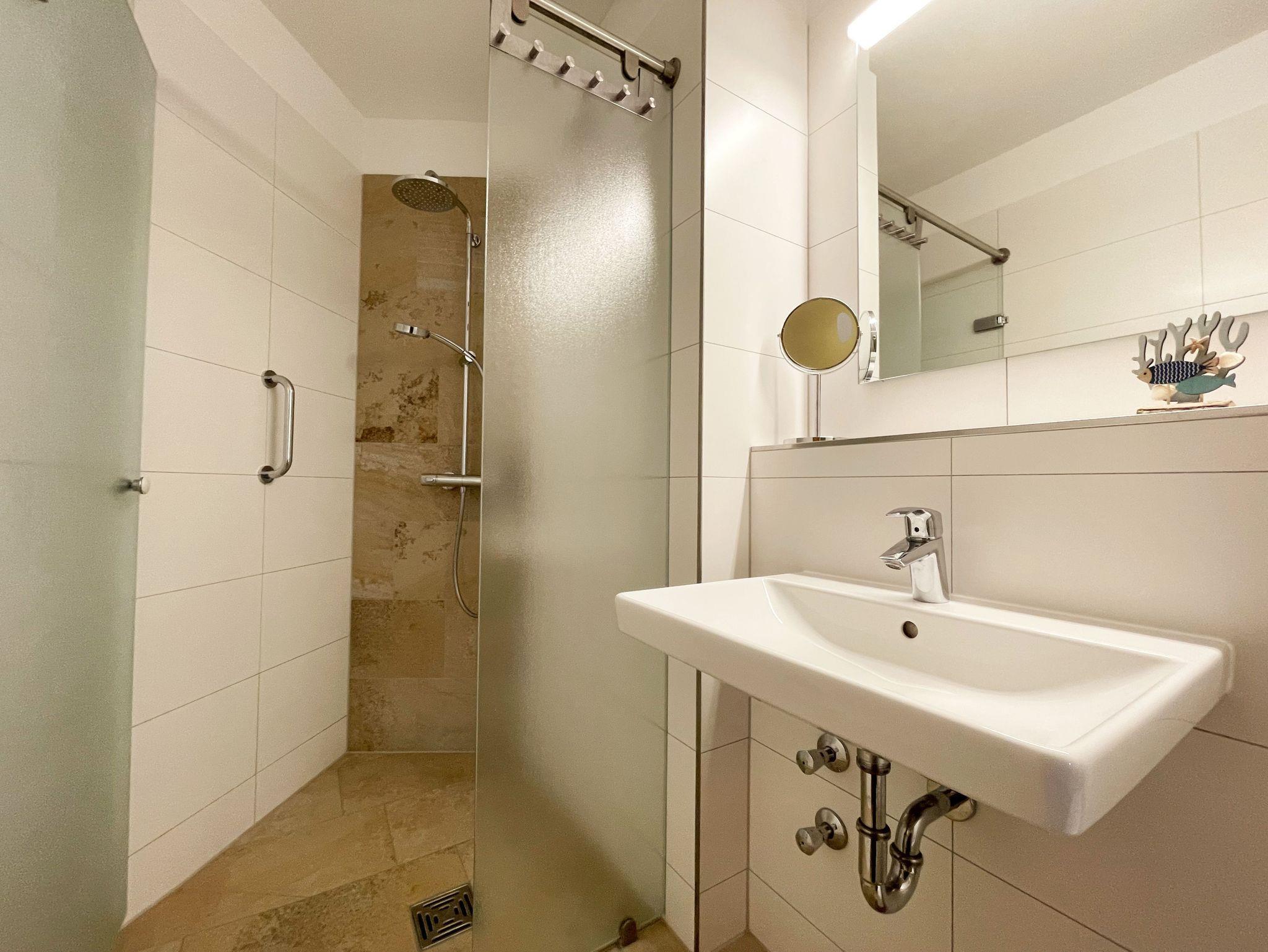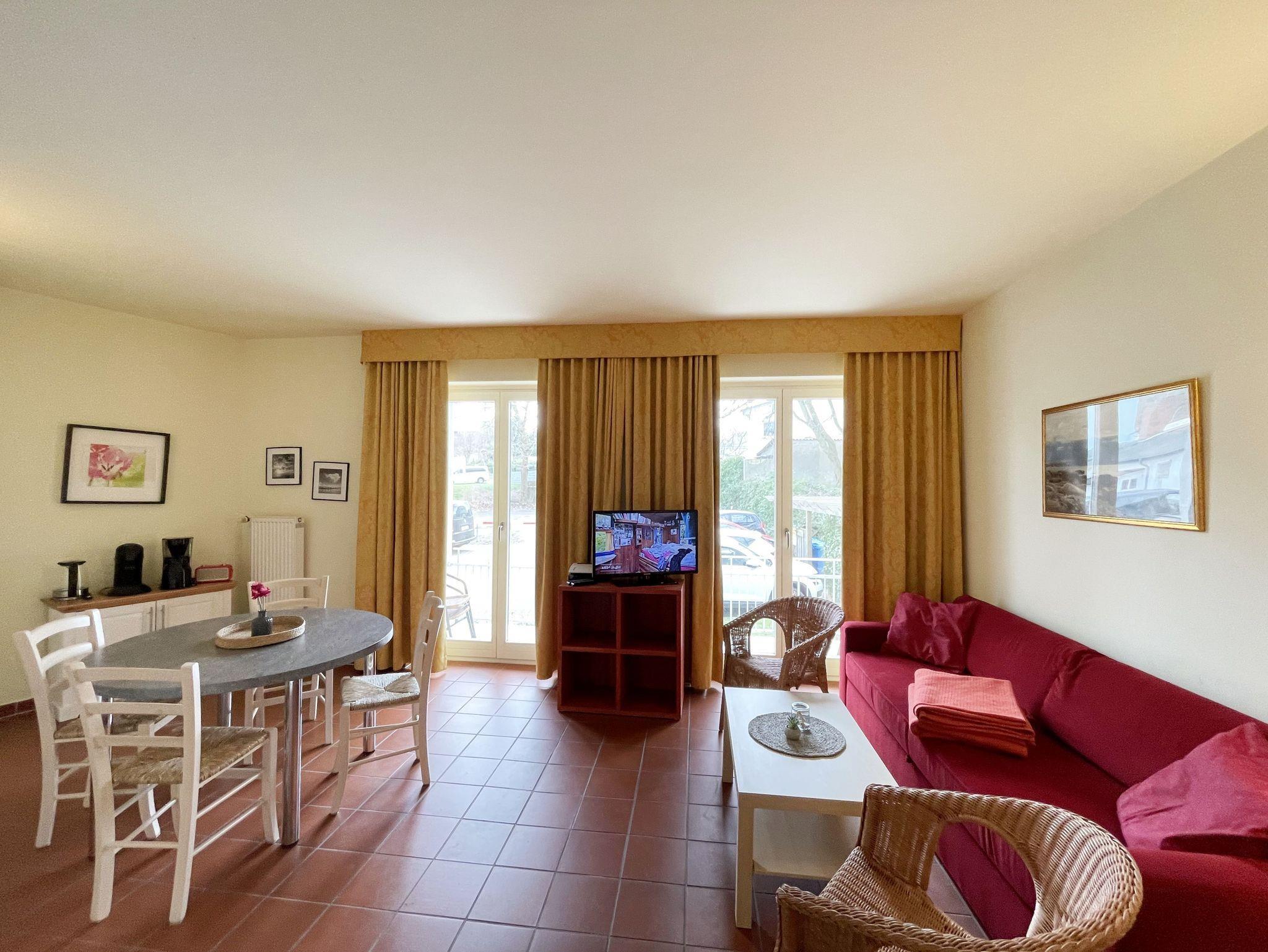 Die geräumige, nach Südwesten ausgerichtete 3-Zimmerwohnung ist etwa 55 qm groß und befindet sich im Hochparterre. Von vorne ist sie über die Freitreppe erreichbar, von der Hofseite aus sind es nur wenige Stufen. Das Appartement ist für 2 bis 6 Personen geeignet. Im Wohnbereich finden Sie eine komfortable Schlafcouch (1,60m x 2,00m), einen LED-Fernseher, einen Essplatz für 6 Personen sowie die Küchenzeile. Sie ist mit Cerankochfeld, Spülmaschine, Backofen, Kaffeemaschine, Wasserkocher, Toaster, Kühlschrank mit Eisfach und allen wichtigen Küchenutensilien ausgestattet. An den Wohnbereich grenzt der bestuhlte Südbalkon. Das gemütliche Schlafzimmer verfügt über ein Doppelbett (2 x 0,90 x 2,00 m) mit 7-Zonen-Matratzen, einen Kleiderschrank und eine Kommode mit Spiegel. Im zweiten, kleineren Schlafzimmer finden Sie ein Kojenbett (2 x 0,80 x 2,00 m), ebenso einen Kleiderschrank und eine Kommode mit Spiegel. Das Bad ist mit WC, Waschbecken und Föhn ausgestattet. Die geräumige Dusche ist ebenerdig zu begehen und mit Glaswänden abgetrennt. In der kühleren Jahreszeit wärmt die angenehme Fußbodenheizung in allen Räumen den Terracottaboden. Auch im Urlaub brauchen Sie auf einen WLAN-Zugang nicht verzichten. Dieser ist für Sie inklusive vorhanden. Ein eigener Stellplatz Nr. 11 für Ihr Fahrzeug befindet sich hinter dem Haus. In einem separaten Raum können mitgebrachte oder geliehene Fahrräder abgeschlossen werden. Auch 1 Vierbeiner ist gegen eine Gebühr ein gern gesehener Gast. Die Erstausstattung eines Wäschepaketes (komplette Bettwäsche, 1 Duschhandtuch, 1 kleines Handtuch) können Sie bis 14 Tage vor Anreise dazu buchen oder durch eigene ergänzen. Ab 2 gebuchten Paketen erhalten Sie einmalig 1 Geschirrhandtuch und 1 Duschvorleger hinzu.