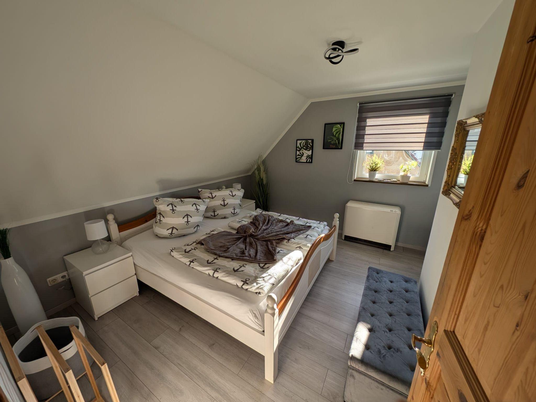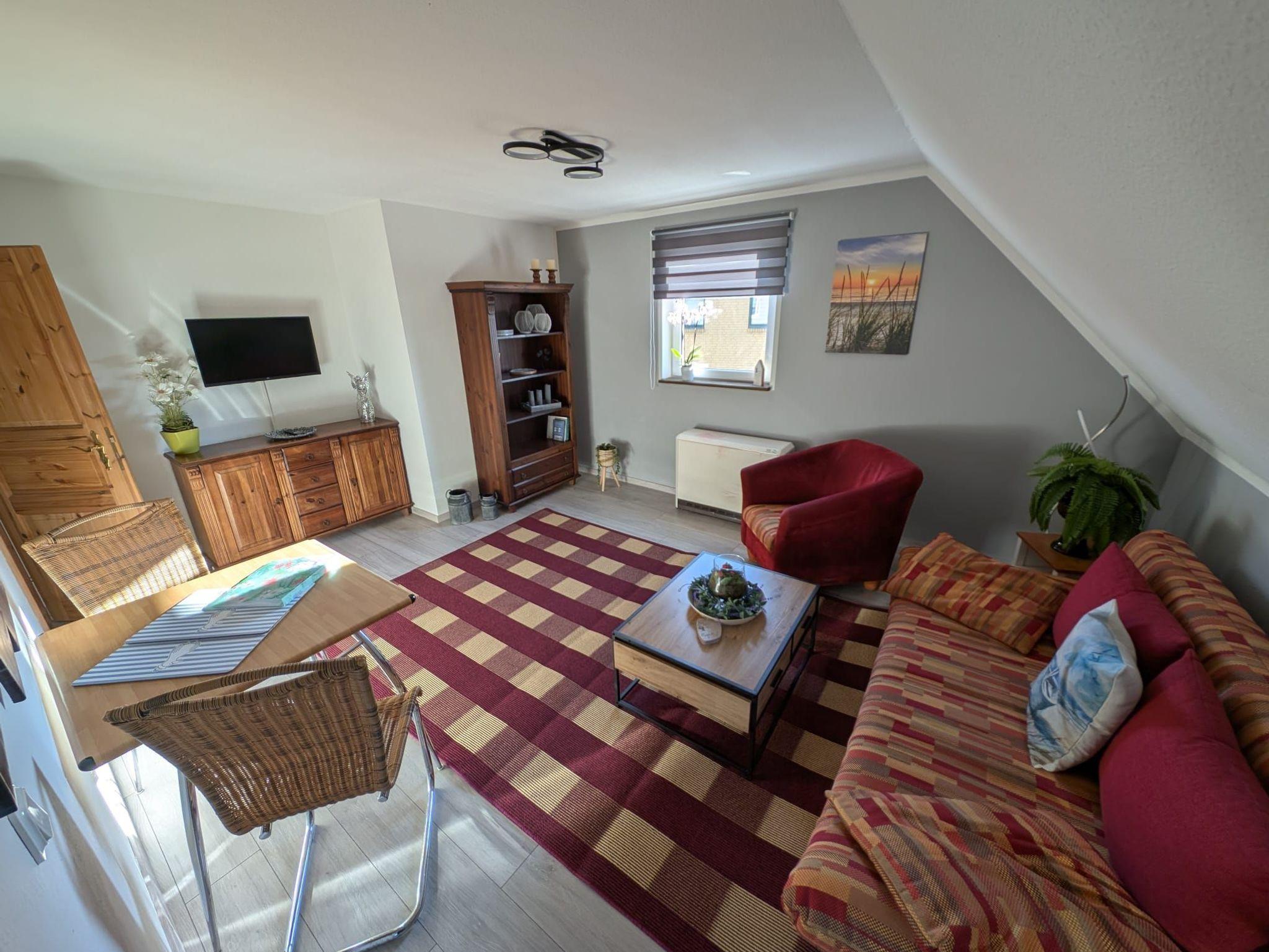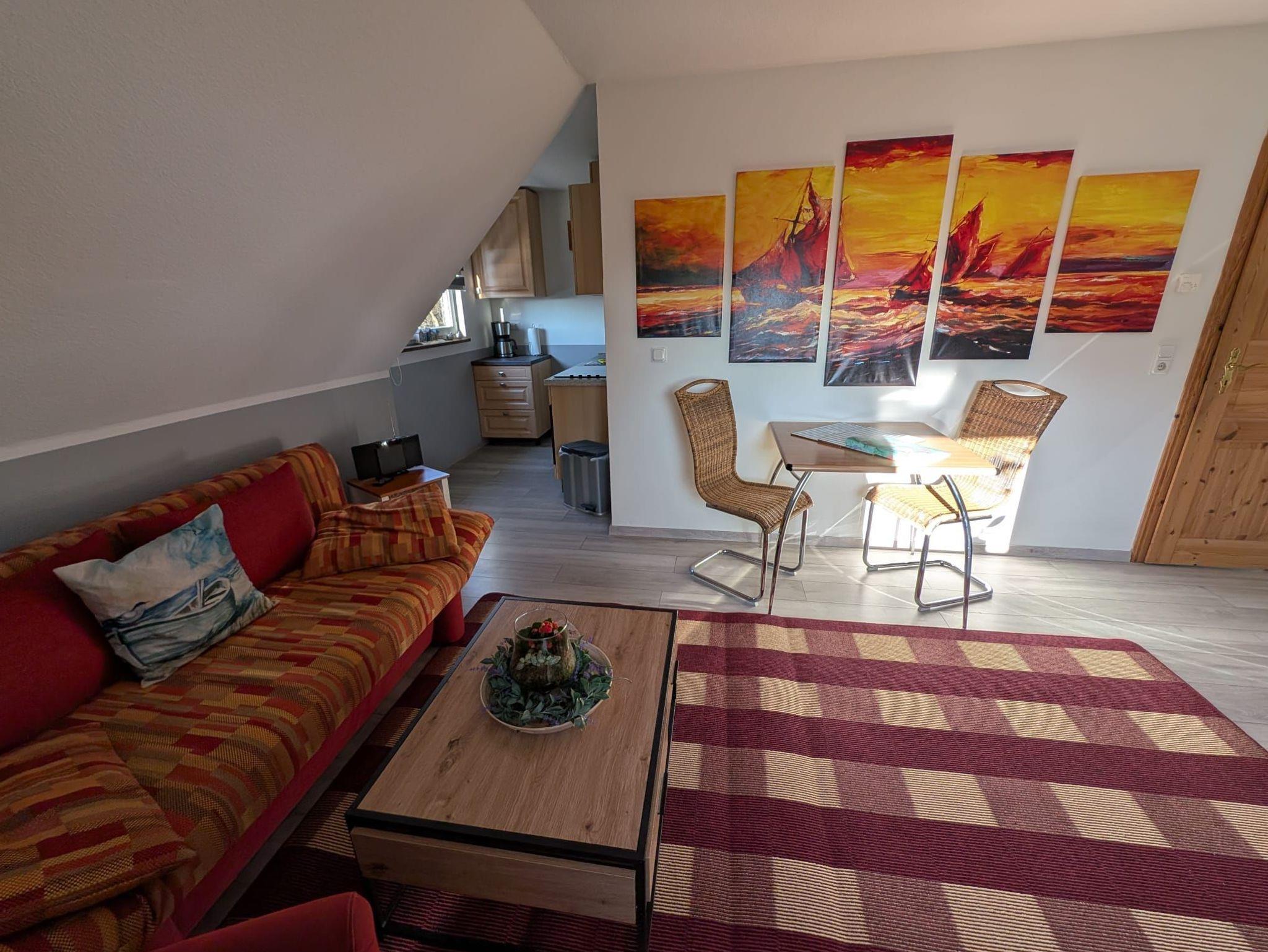 Unsere Ferienwohnung Merle ist eine 45m² Dachgeschosswohnung bestehend aus einem Schlafzimmer,einem Wohnzimmer mit ausziehbarer Couch.Eine SMART-TV,einer voll ausgestatten Küche.