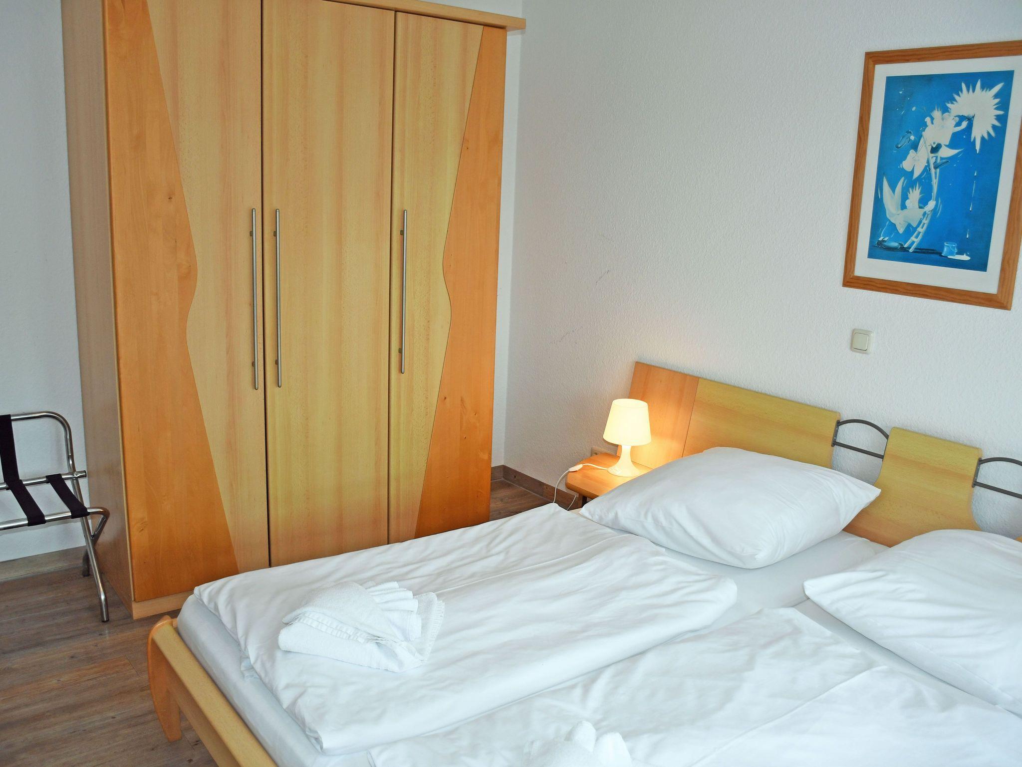 Schlafzimmer mit 2 getrennt stehenden Betten (90 x 200 cm) und kleinem Kleiderschrank