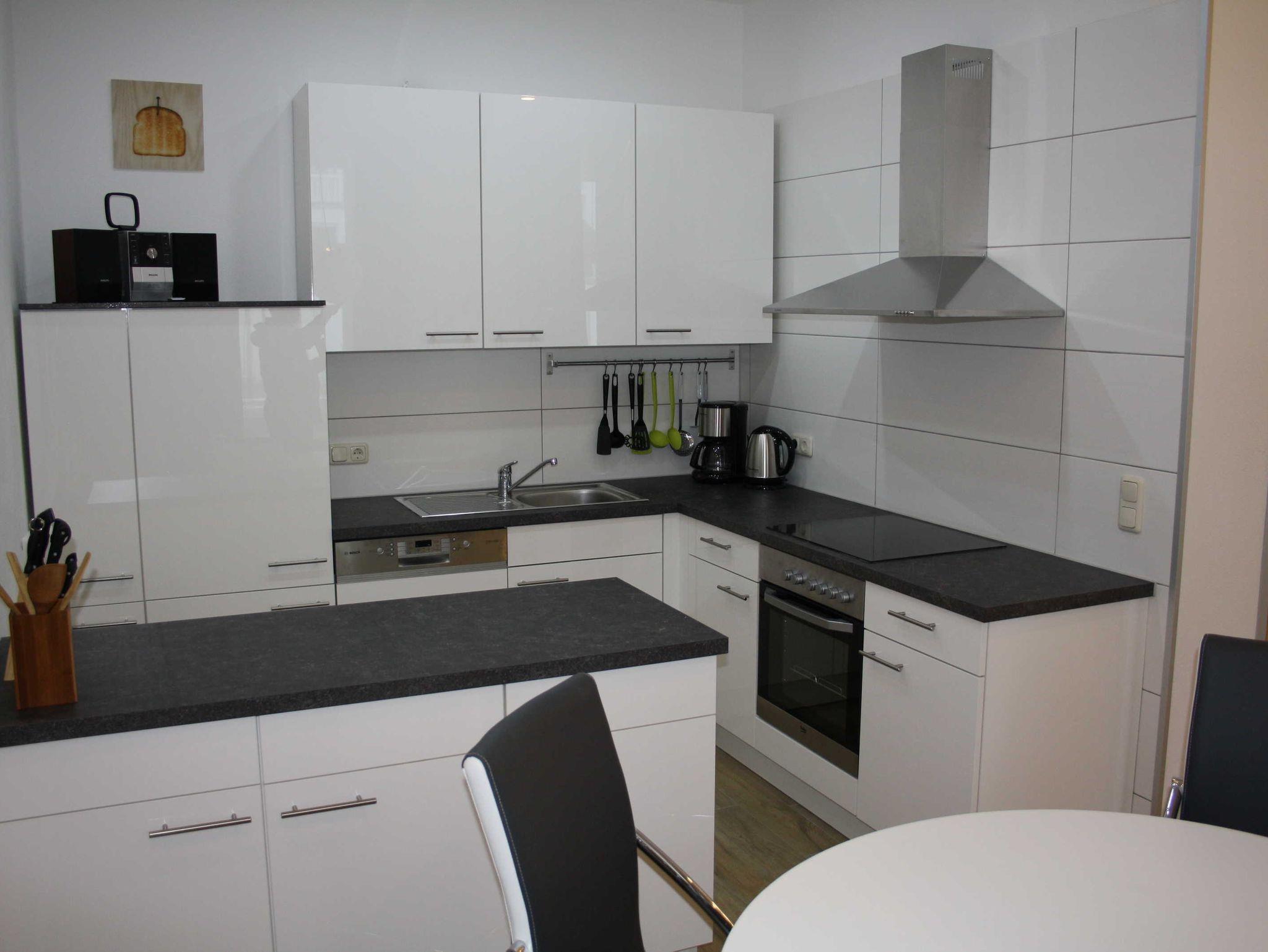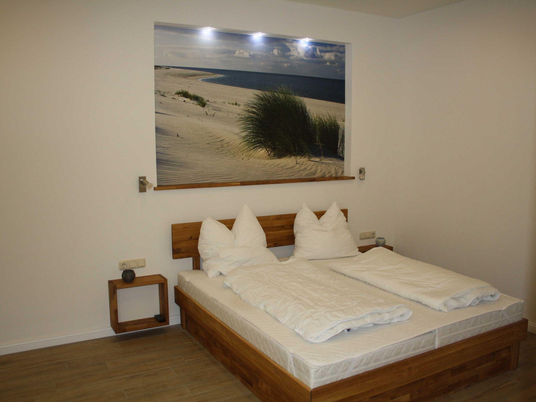 Die Anfang 2016 komplett sanierte und neu eingerichtete 2-Raum-Fewo befindet sich im Erdgeschoß. Sie ist ca. 69 qm groß und für 5 Personen ausgestattet. Die Fewo besteht aus aus einem Wohnzimmer mit Sitzecke (Doppelschlafcouch) und TV und einer offenen Küche - komplett eingerichtet mit Esstisch, Kühl- und Gefrierkombi, Geschirrspüler, Ceranfeld, Backofen, Kaffeemaschine, Wasserkocher und komplett Geschirr etc. Das Schlafzimmer ist ausgestattet mit Doppelbett, einem großen Kleiderschrank und TV. Für die 5. Person ist ein Klappbett vorhanden, welches ins Schlafzimmer gestellt werden kann. Vor dem Wohnzimmer ist ein großer ebenerdiger Ballkon mit Sitzmöglichkeiten. Das Bad ist mit einer großen Dusche, Waschbecken, WC und Waschmaschine bestückt.