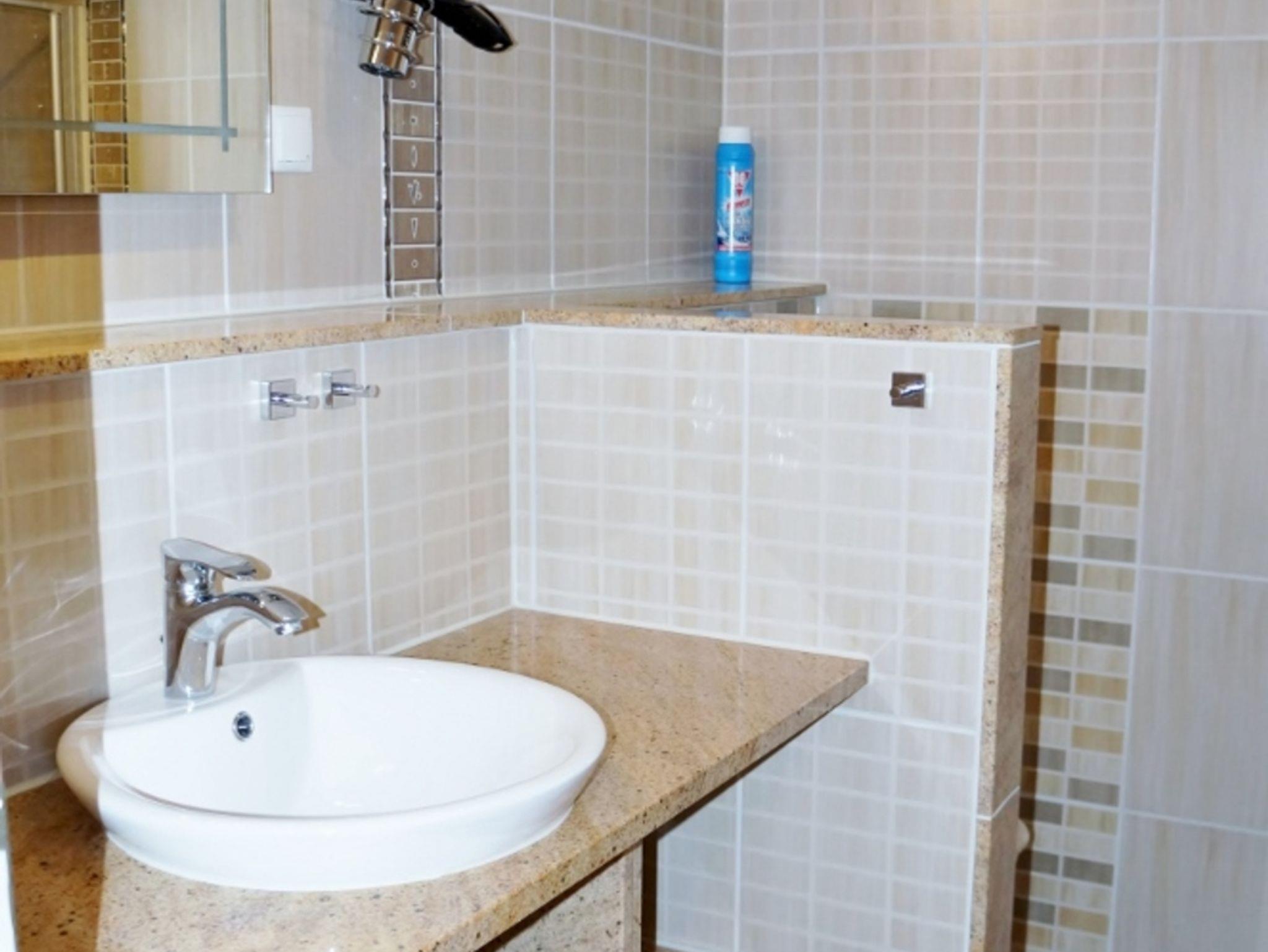 Ein mediteranes Bad mit Dusche/WC . Die großzügige Küchenzeile ist komplett ausgestattet mit Backofen, Spülmaschine, Mikrowelle und vielen Extras - ein extra Essbereich gehört zusätzlich zur Küchenzeile.
