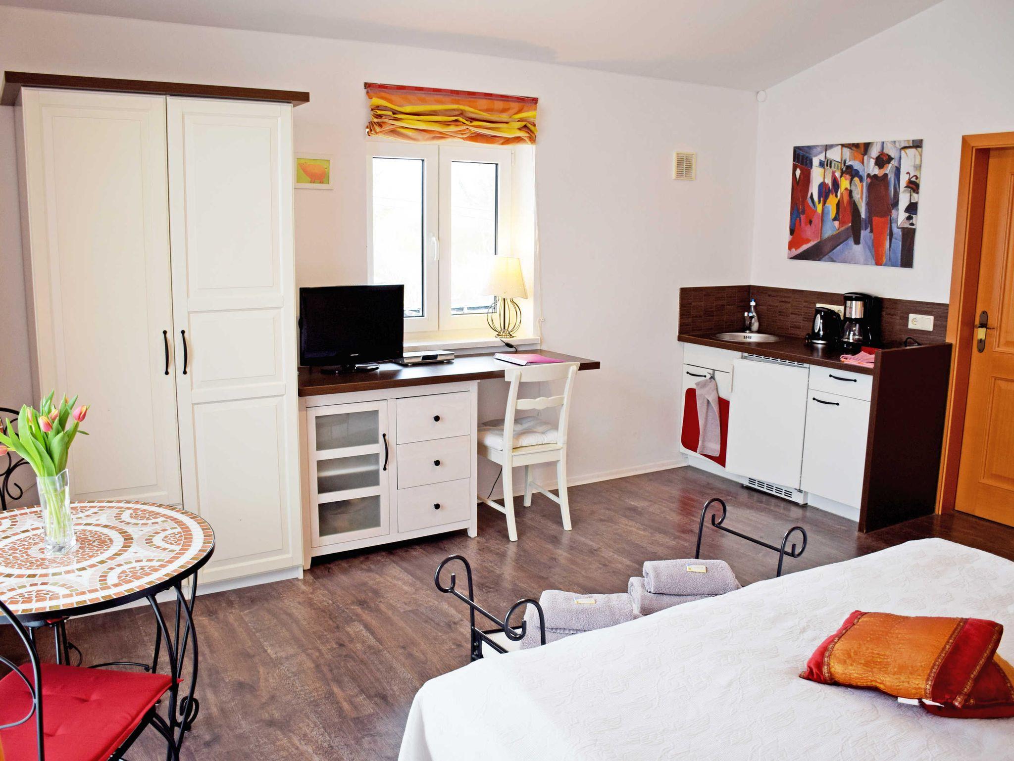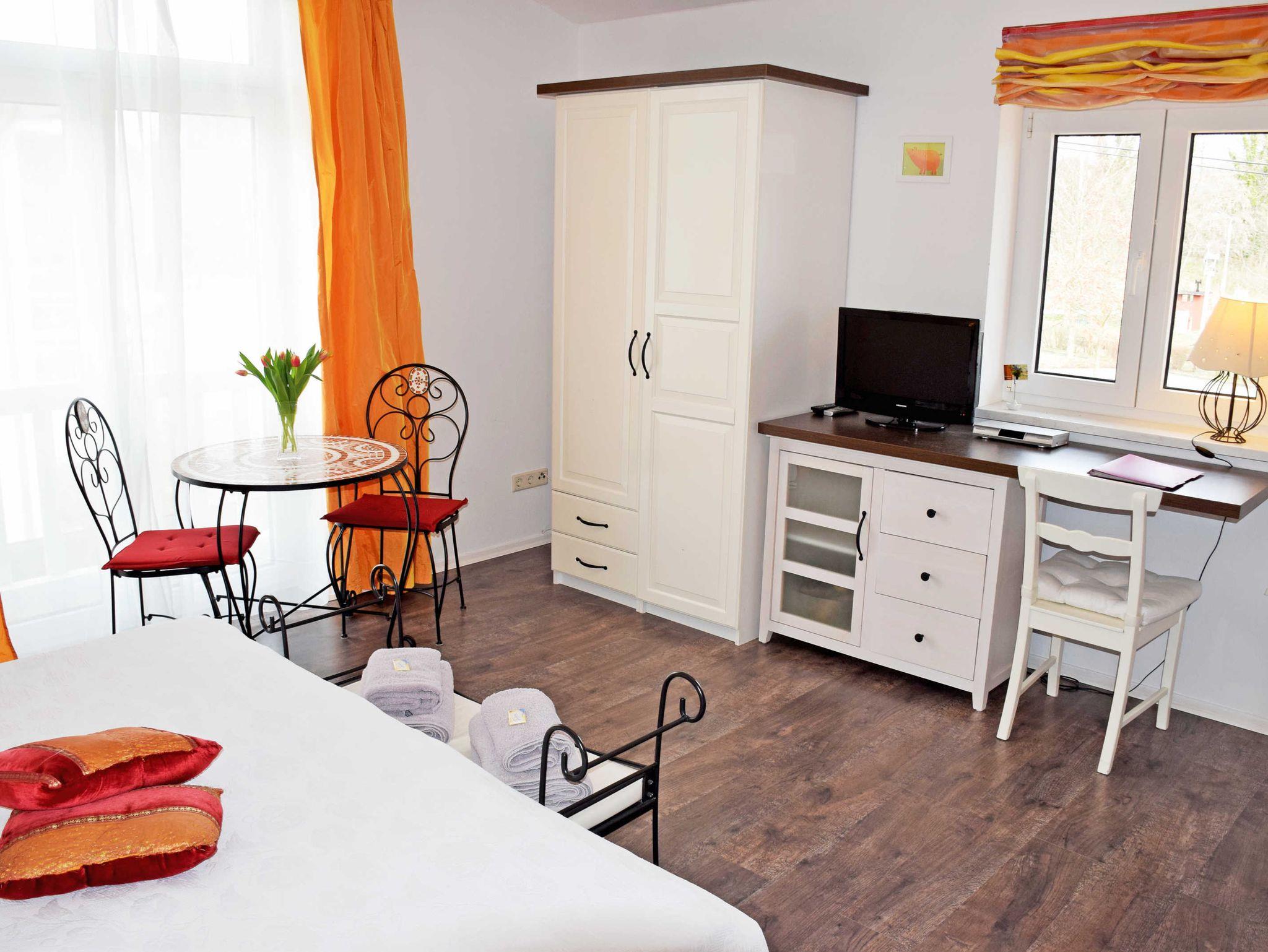 Unser 1- Raum Appartement ist für 2 Personen geeignet und ist ca. 25 m² groß. Es befindet sich im Obergeschoss. Es erwartet Sie in einem sehr gemütlichen Ambiente ein Wohnschlafraum mit einem Doppelbett einer Pantry mit Kühlschrank und Spüle, eine Induktionskochplatte (geeignet zum Kochen von Kleinigkeiten, nicht zum Braten) mit einem Topf, Kaffeemaschine, Wasserkocher, Toaster, Sat-TV, Dusche und WC. Fliegengitter schützen Sie vor unliebsamen Eindringlingen.