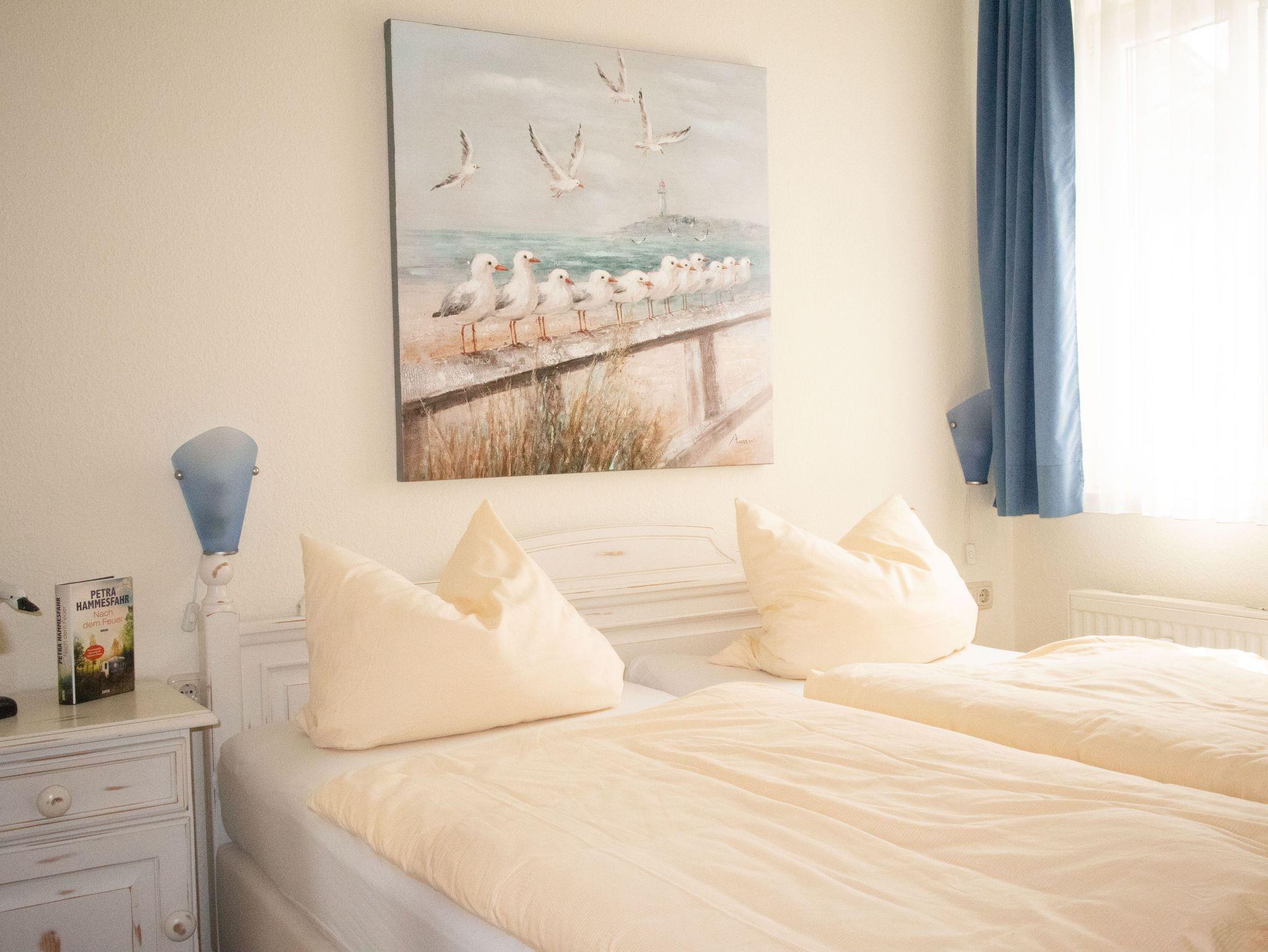 Im Schlafzimmer bietet Ihnen ein Boxspringbett ausreichend Platz für einen erholsamen Schlaf. Ihre Urlaubskleidung können Sie im geräumigen Kleiderschrank unterbringen.