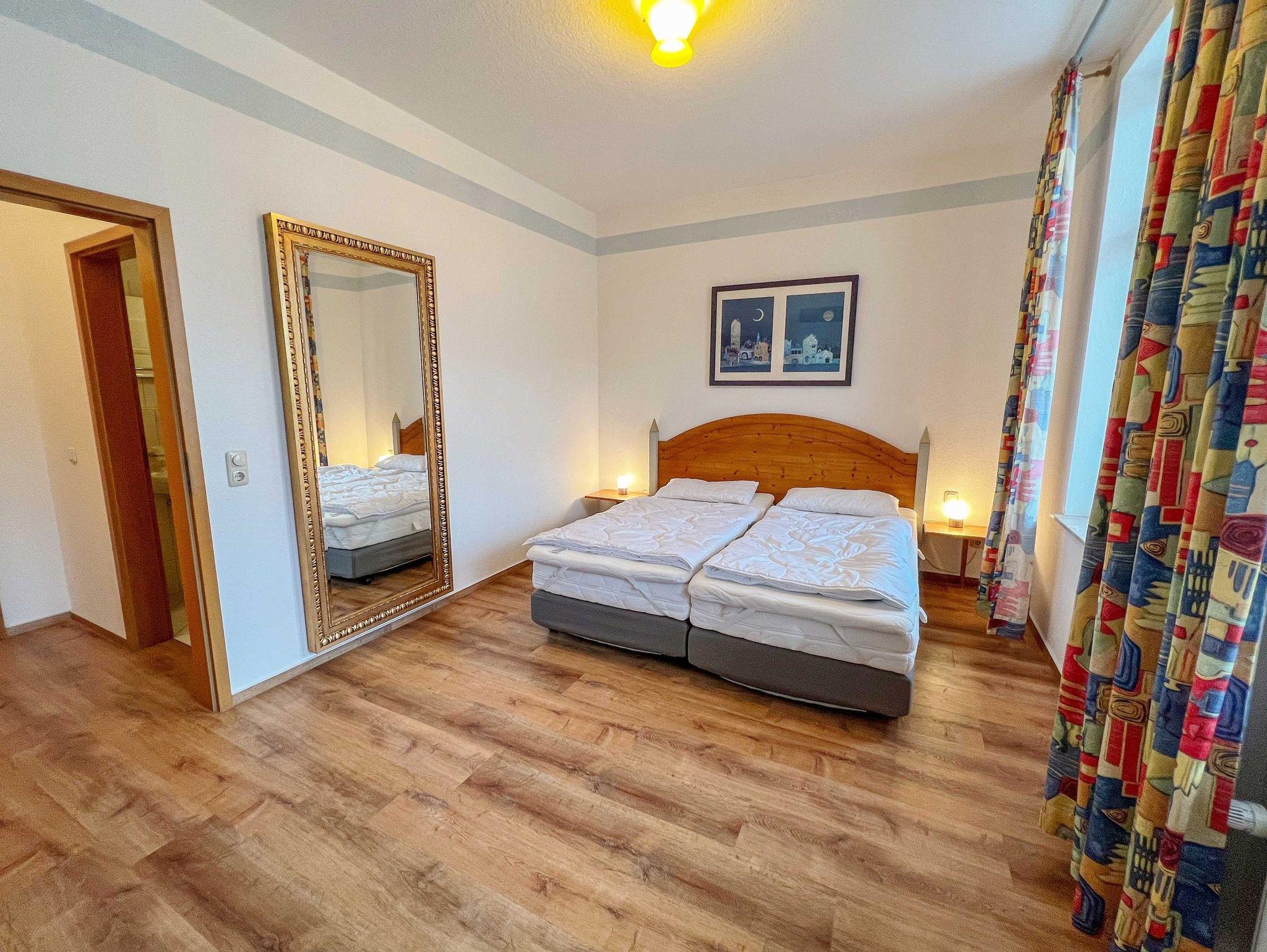 Die großzügige, freundliche und komfortabel eingerichtete *** Nichtraucher - Ferienwohnung (2. Etage) besteht aus einem Schlafzimmer mit Doppelbett (allergikergerechte Matratzen).