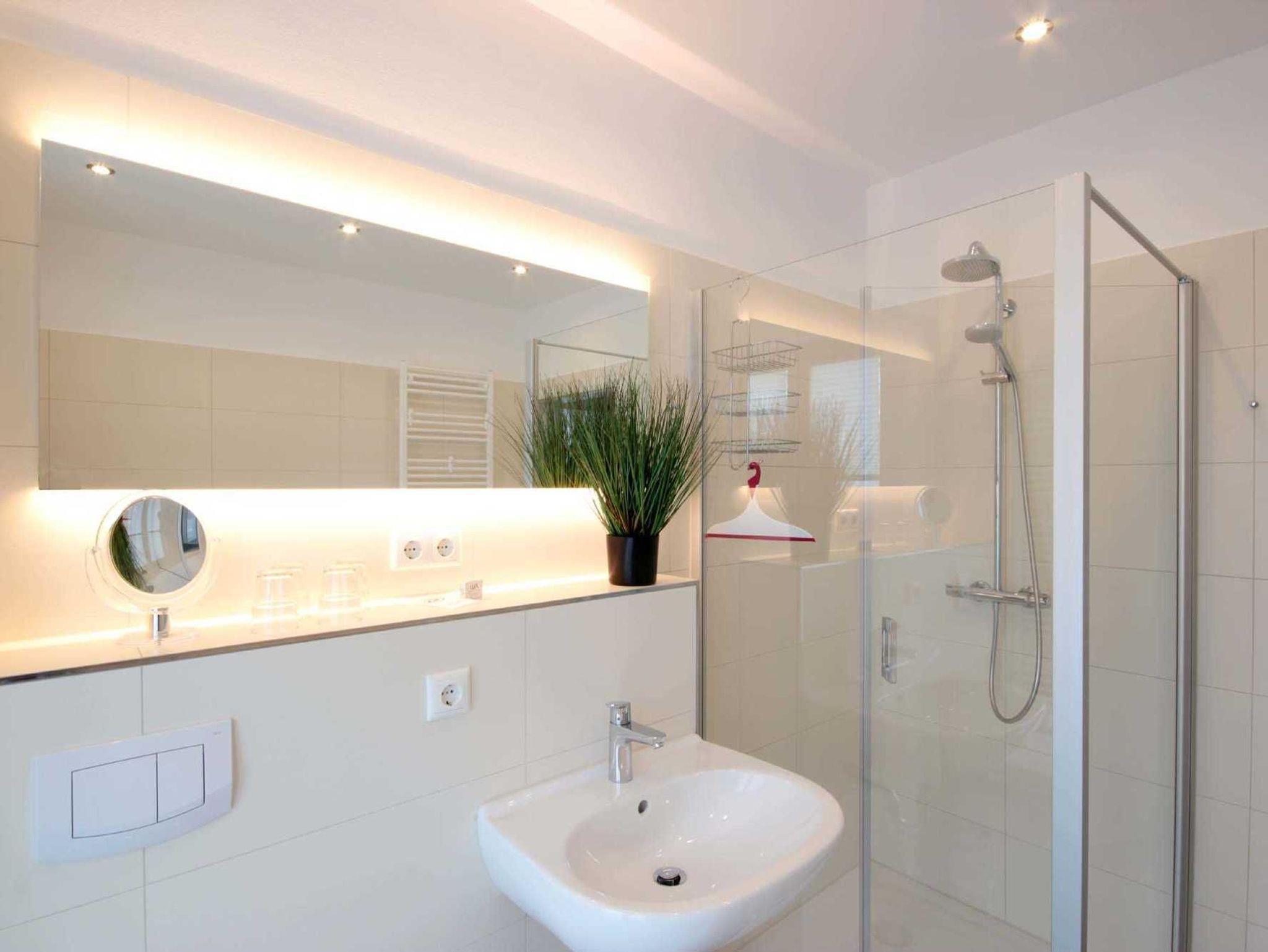 Im EG befindet sich der Wohnbereich mit einer großzügigen Sitzgruppe, Kamin sowie die moderne Küche und der Essbereich. Zur technischen Ausstattung im Wohnraum zählt ein Flachbildfernseher (65-Zoll) und der kostenfreie Internetzugang. Die Küche ist mit Backofen, Cerankochfeld, Mikrowelle, Geschirrspülmaschine, Kühl-/Gefrierkombination, Kaffeevollautomat, Wasserkocher, Toaster und diversen anderen Küchenhelfern komplett ausgestattet. Darüber hinaus gibt es Tageslicht-Duschbad mit Waschtisch, Waschmaschine und WC.