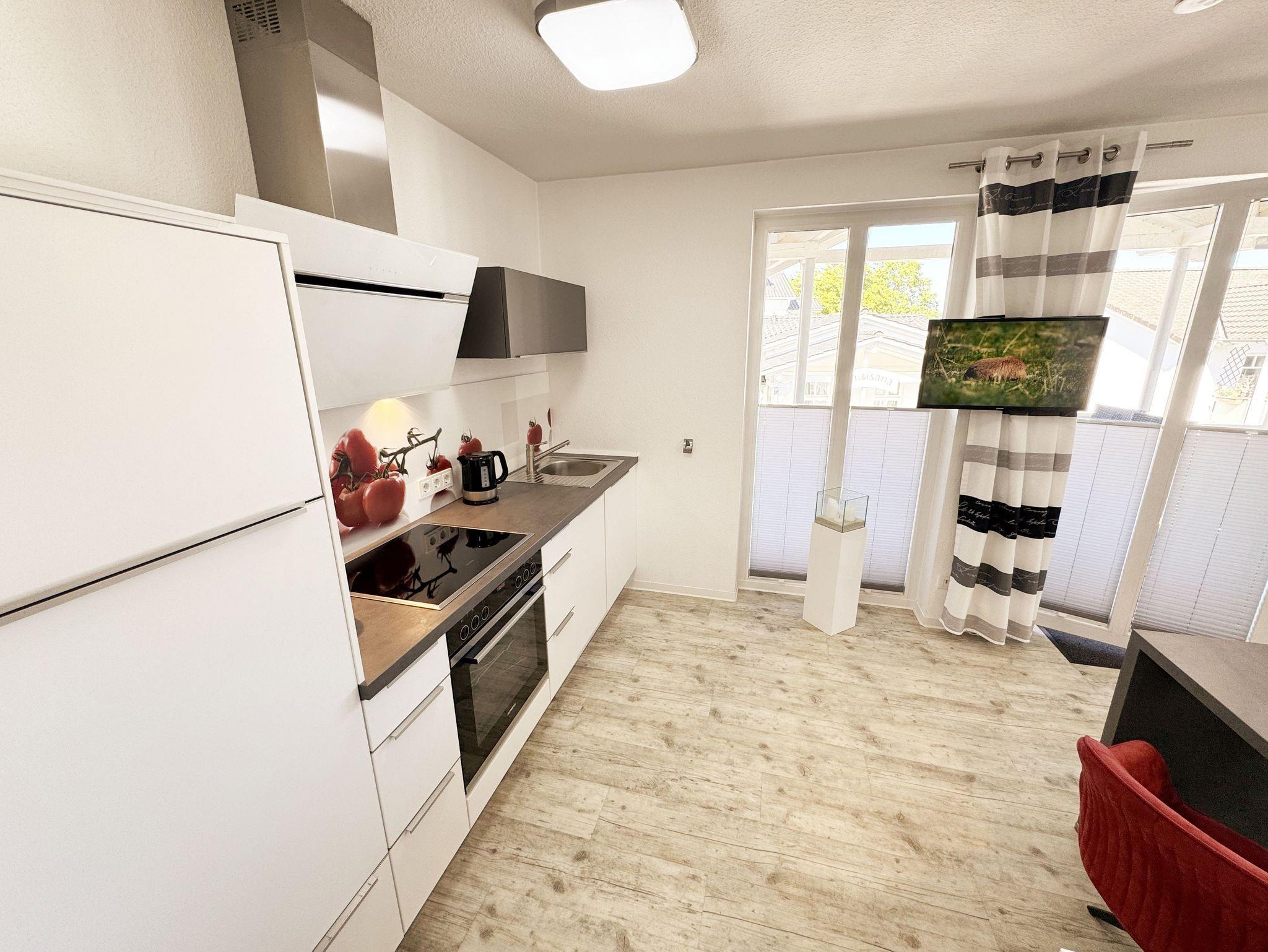 Die Nichtraucherwohnung 31 befindet sich im 2. Obergeschoss und ist ca. 40 m² groß. Sie ist in einem modernen Design hell und Allergiker freundlich gestaltet und komfortabel für max. 2 Personen + 1 Kleinkind bis 3 Jahre im Kinderreisebett eingerichtet. Der freundliche Eingangsbereich bietet einen deckenhohen Einbauschrank mit viel Platz für Ihre Kleidung und einem sehr großen Spiegel. Außerdem finden Sie hier eine Schuhablage mit Sitzbank. Im lichtdurchfluteten Wohnbereich lässt es sich nach einem erlebnisreichen Urlaubstag wunderbar relaxen, hier finden Sie eine hochwertige Couch, einen Couchtisch, eine Leselampe, einen Essbereich mit 2 bequemen Freischwingstühlen sowie einen Smart-TV mit Sky (Auswahl von Sport, Film, Dokumentation) und ein CD-Radio. Mit einem spannenden Buch (eine Auswahl von Büchern finden Sie in der Wohnung) oder einem guten Glas Wein können Sie den Tag ausklingen lassen. Auch im Urlaub brauchen Sie auf einen WLAN-Zugang (20 Mbit) nicht verzichten, denn dieser ist für Sie inklusive. Vom Wohnbereich gelangen Sie auf den ca. 12 m² großen und bestuhlten Balkon (Nordost), welcher Sie zum sonnigen Frühstück oder zur Entspannung auf den bequemen Sonnenliegen einlädt. Die offene und moderne Küchenzeile ist mit allem Komfort und hochwertigen Elektrogeräten ausgestattet. Dazu gehören Mikrowelle, Backofen, Induktionskochfeld, Geschirrspüler, Kühlschrank mit Gefrierfach, Toaster, Wasserkocher, Dolce Gusto Maschine, Kaffeemaschine und diverse Küchenutensilien. In dem geschmackvoll eingerichteten Schlafzimmer können Sie in dem Boxspringbett (1,80m x 2,00m) mit komfortablen Topper und Nachttischablagen wunderbar neue Energie tanken. Für einen erholsamen Schlaf sorgt hier ein Verdunkelungsvorhang. Das innenliegende Bad, welches durch die Beleuchtung sehr hell erscheint, ist komplett eingerichtet. Es beinhaltet neben Waschbecken mit Unterschrank, eine Dusche mit sehr niedrigem Einstieg, ein WC, einen separaten Badschrank, ein eingebautes Radio, einen Föhn, einen Kosmetikspiegel, einen Handtuchheizkörper sowie große Ablageflächen. Alle Fenster sind mit Plissees versehen worden. Die Wohnung verfügt über einen PKW-Stellplatz im Parkhaus in unmittelbarer Nähe (Bahnhofstrasse, ca. 8 Gehminuten bis 31 Dezember 2025) und einen eigenen abschließbaren Fahrradkeller direkt im Untergeschoss des Hauses.